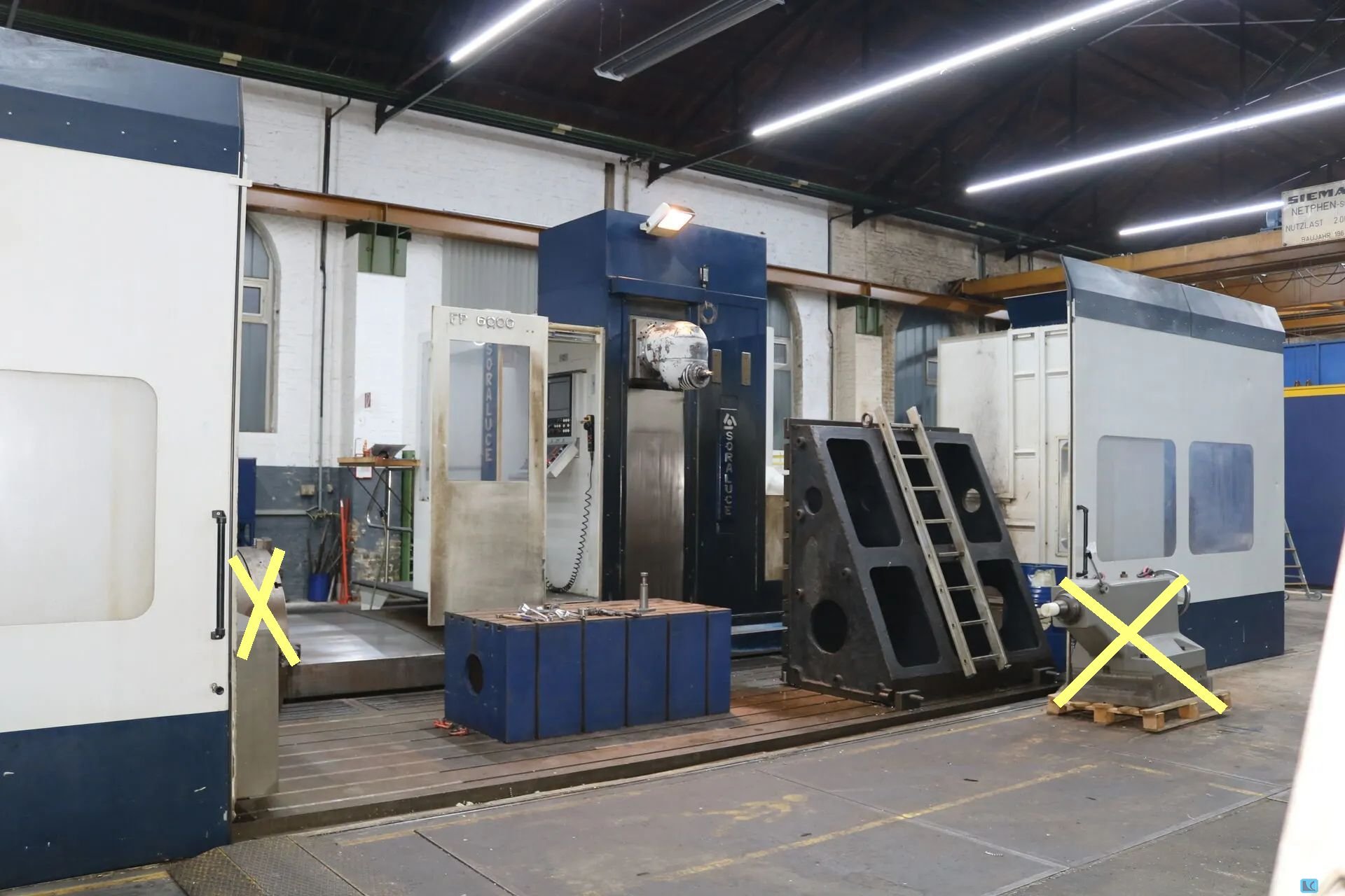 x-travel:6000 mm y-travel:2100 mm z-travel:1500 mm Controls:HEIDENHAIN iTNC 530 BASIC DESIGN:. - basic design : travelling column :. WORKING RANGE -MILLING-:. - x-axis travel:6000 mm - y-axis travel:2100 mm - z-axis travel:1500 mm FLOOR PLATE:. - clamping surface (left-right):7000 mm - clamping surface (front-back):2000 mm WORKING SPINDLE / HEAD:. - spindle type : orthogonal head :. - tilting range:360 ° - - mode of operation : automatic :. - - positioning/indexing:1 ° - tilting range (2nd axis):270 ° - - mode of operation : automatic :. - - positioning/indexing:1 ° - spindle revolutions (min):20 /min - spindle revolutions (max):4000 /min - spindle diameter:90 mm - taper fixture : ISO SK 50 :. - spindle power (continuous):32 kW - torque (max.):910 Nm AXIS DRIVES:. - feed velocity (min):2 mm/min - feed velocity (max):20000 mm/min - rapid traverse:25000 mm/min ELE ...