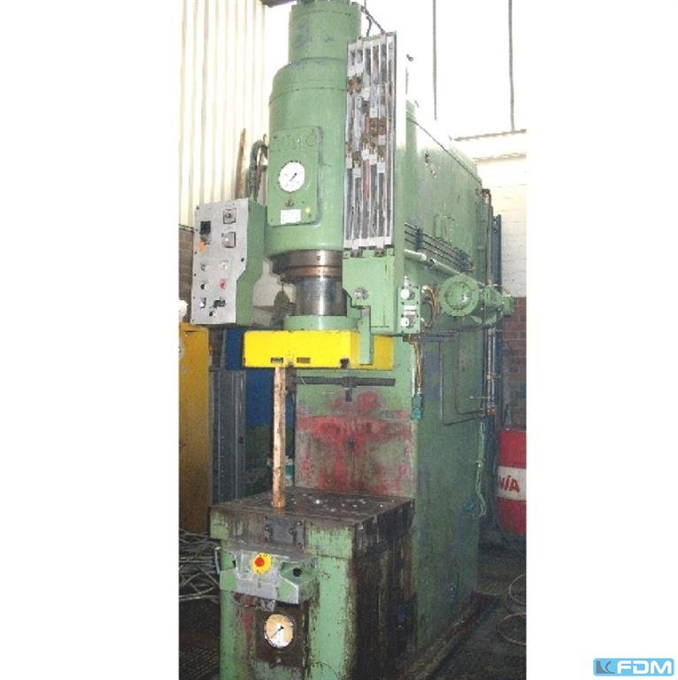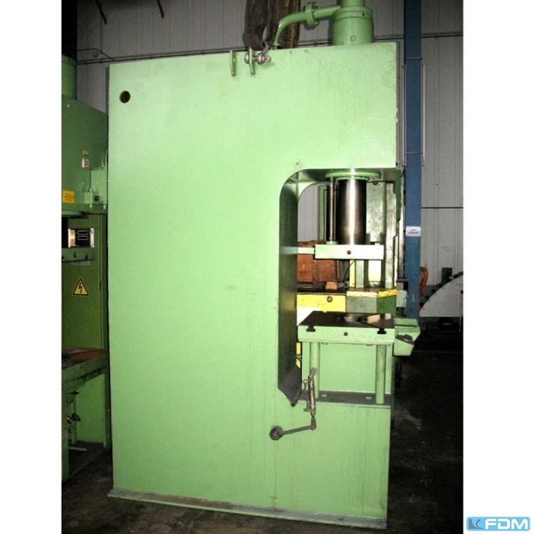 pressure:160 t throat:370 mm stroke:150 mm distance table/ram, max. stroke up, adjustment up:500 mm table surface area:1000 x 700 mm hole in the table:100 mm table height over floor:820 mm ram surface:600 x 520 mm speed down:350 mm/s speed up:350 mm/s working speed:12 - 36 mm/s oil volume:1100 l power requirement:27,0 kW weight:16,5 t dimensions (WxDxH):1,8 x 2,7 x 3,95 m German Safety: permitted for manual loading:UVV 11.064 - VBG 7n5.2 depth stop:motoric adjustable