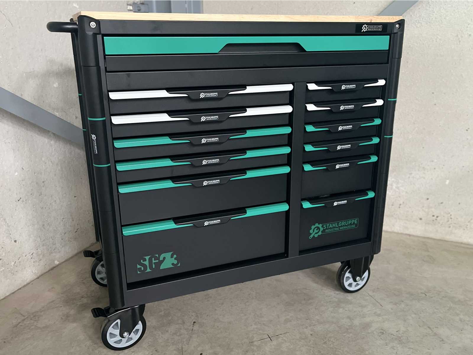 Brand: Stahlgruppe Type: SG23 Number of drawers: 13 drawers Number of filled drawers: 11 filled drawers Material: Chrome Vanadium Contents: 2 socket wrench sets (1/2\" & 1/4\") torque wrench (40-220 Nm) Spanner set (6-32 mm) Ring Ratchet Spanner Set (8-19mm) Ring Ring Ring Wrench Set (6-32mm) Allen keys (1.5-10 mm) Torx wrenches (T8-T70) Screwdrivers (21 pieces) Various pliers (9 pieces) Caliper (0-150mm0.02mm) Chisels and pin punches (9 pieces) various hammers (3 pieces) T-handle Torx wrenches (T15-T45) T-handle Allen keys (2-10 mm) Chromium-Molybdenum Impact Sockets (10-24 mm) T-handle sockets (7-14 mm) VDE tools (10 pieces) Files and hook set (8 pieces) and so on... Dimensions: L 112 x D x 55 x H 110 cm Condition: unused, in the original packaging Aucti ...