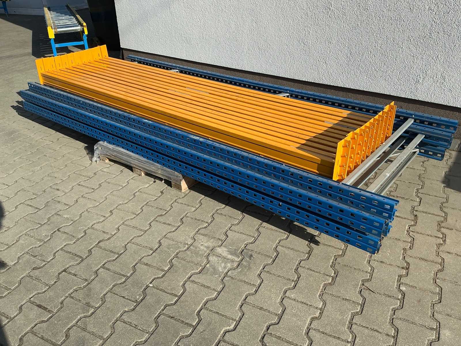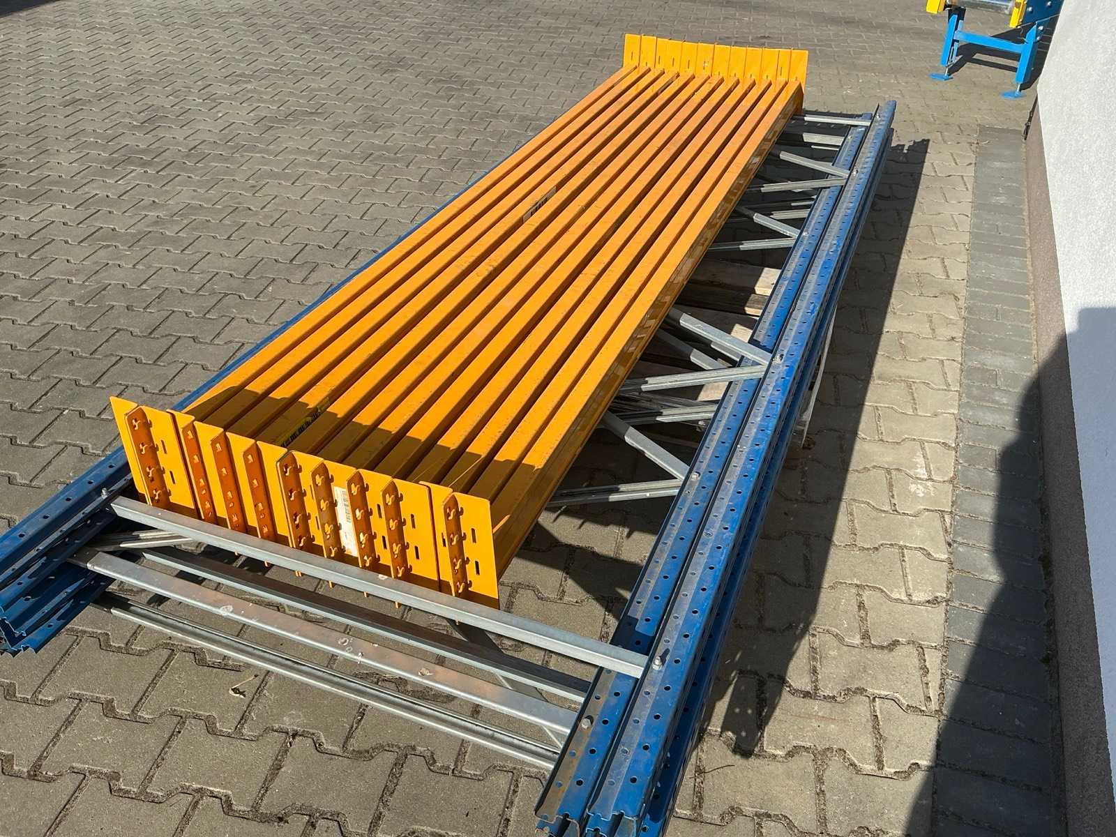 High-bay pallet racks steel blue approx. 18 stands, each total approx. 600x120t cm, uprights partly connected, approx. 84 trusses each approx. 270b cm, approx. 12 trusses each approx. 180b cm, wooden inserts, ATTENTION: Removal only possible via the window - inspection recommended for removal, no aerial platforms or aerial work platforms on site! Location 1st floor