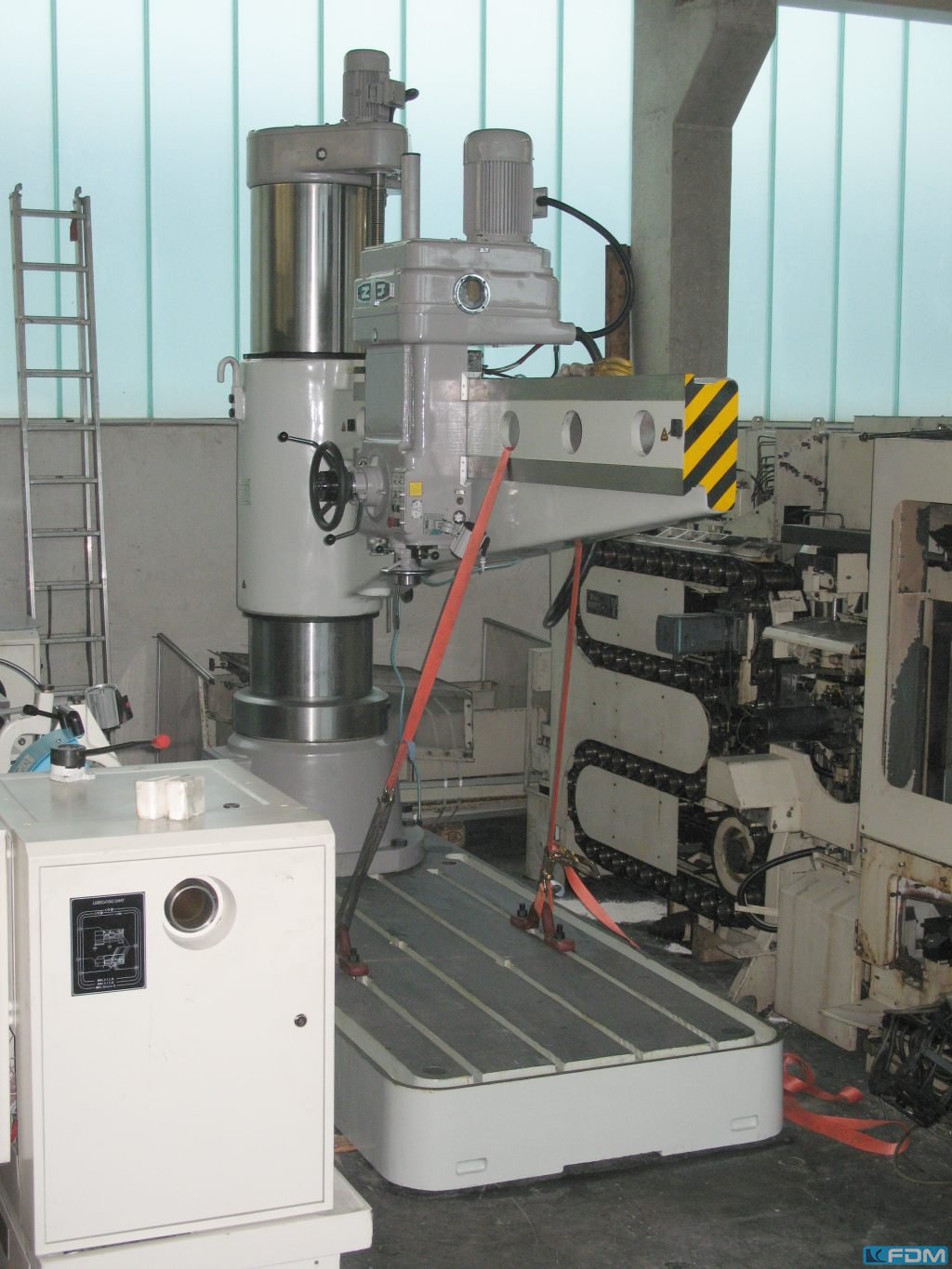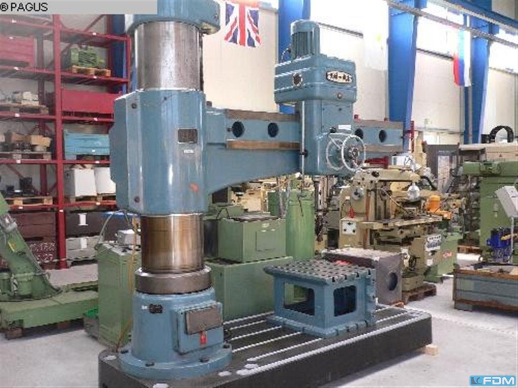 Equipped with: Otto Müller, M12, fast radial drilling machine, connection: 380 V – 50 Hz, mechanically switched speed, radially adjustable arm, vertical arm adjustment along column, spindle with hand feed, solid cast iron work table with T-slots, drill spindle holder (Morse): 30mm, longitudinal travel drill chuck (X-axis): 750 mm, height travel arm (Y-axis): 350 mm, spindle diameter: 55 mm, max drilling depth: 125 mm, speed: 2400 rpm, dimensions: 175x130x215cm (LxWxH), Power supply: 380V Auction-ID: A1-41991-41