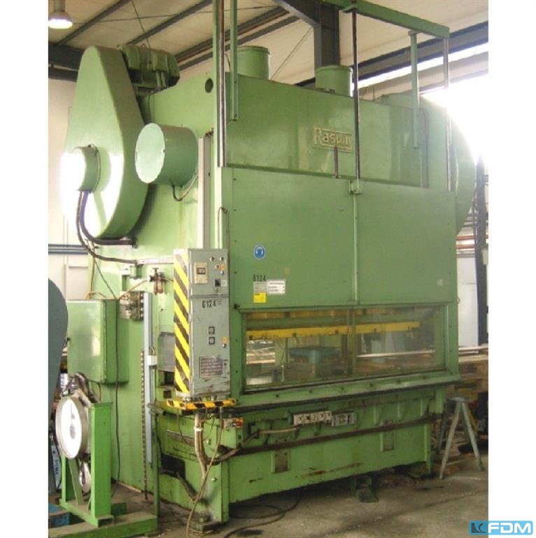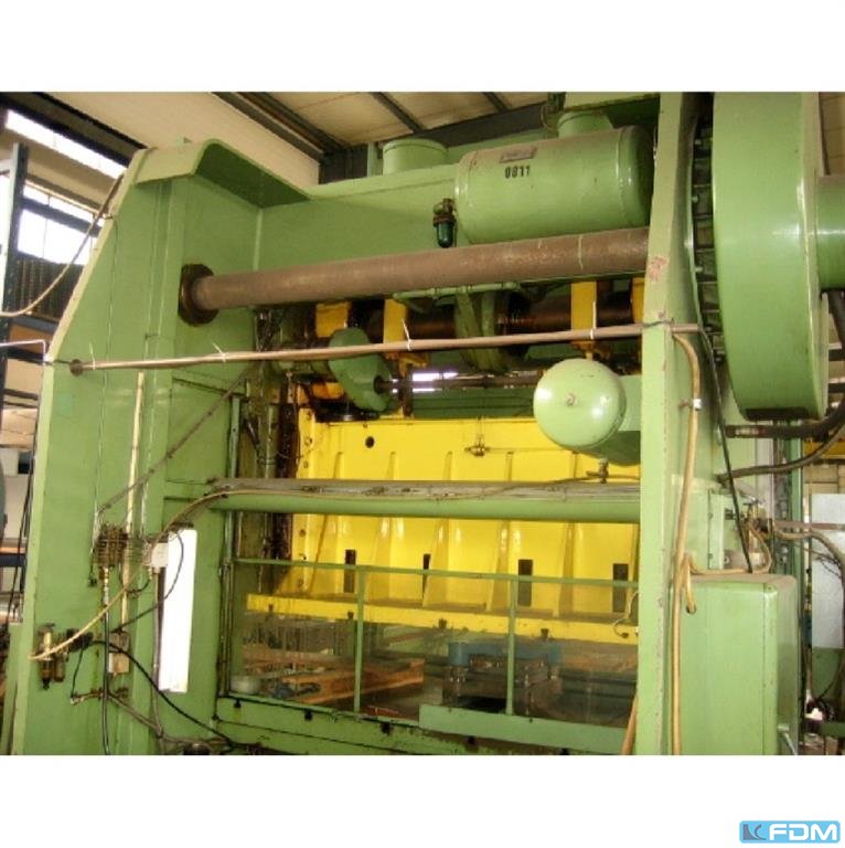 pressure:150 t throat:450 mm stroke:115 fix mm no. of strokes:45 /min distance table/ram, max. stroke up, adjustment up:400 mm table surface area:2250 x 1090 mm table height over floor:900 mm passage to the back:1900 mm ram surface:1900 x 900 mm ram adjustment:100 mm power requirement:16,0 kW weight:19,5 t Dimensions (WxDxH):3,0 x 2,3 x 3,9 m