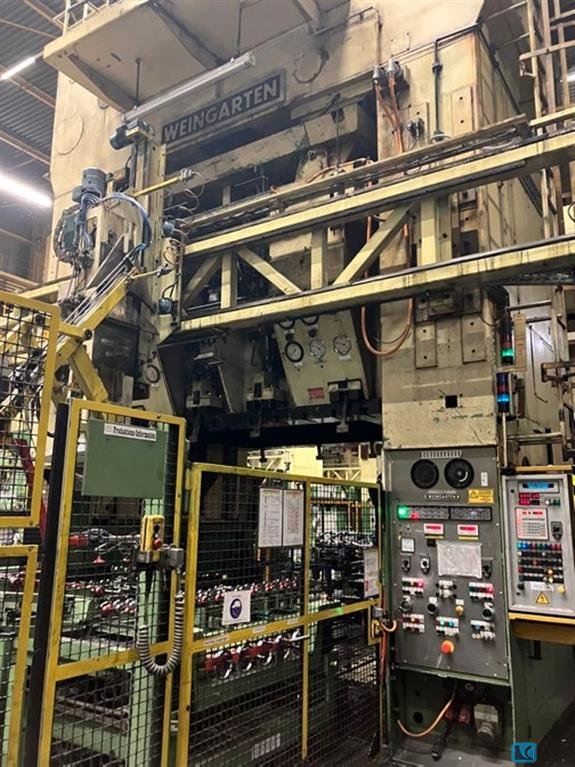 Total force (nominal):800 to Clamping surface (left-right):x mm Clamping surface (front-back):x mm table surface area:3200 X 2200 mm Total force (nominal):2-3-4-5- Presse - 600 to. to table surface area:2-3-4-5- Presse 3100 X1900 mm Last overhaul 2010/2020, consisting of: Circuit board washing system, manufacturer Neuhäuser, with 6 cleaning rollers, system no. 0905200, control unit by Siemens Blank automation, manufacturer Neuhäuser, type 19711594-00-0, year 2002, SN 369507/002, system no. FK42282, consisting of: destacking device, oiler, pallet changer, empty pallet discharge Gripper automation, manufacturer Olofström, type Doppin Loader 2000, SN 37719974886, system no. 0602300 Double-column press, manufacturer Weingarten, type ZS 1200.34 Year 1972, order no. 113 021, pressing force approx. 800 t, double action, stroke 850 mm, stroke adjustment 350 mm, height between table surface an ...