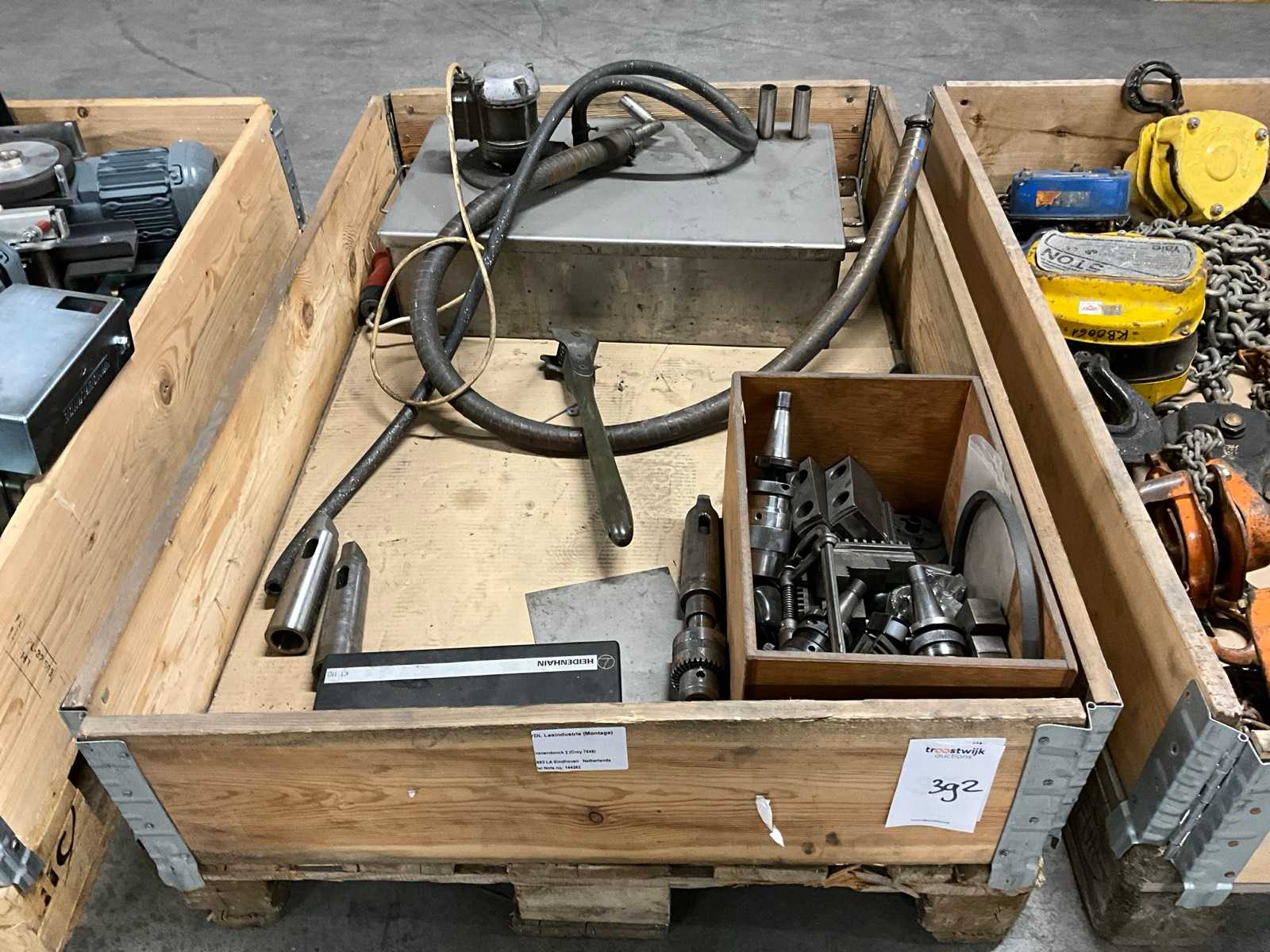 380 Volts; Tank Size: 560x360x190 mm. Includes: claw jaws, drill heads, milling head, reducer sleeves, grinding wheel grinder; without pallet box;
