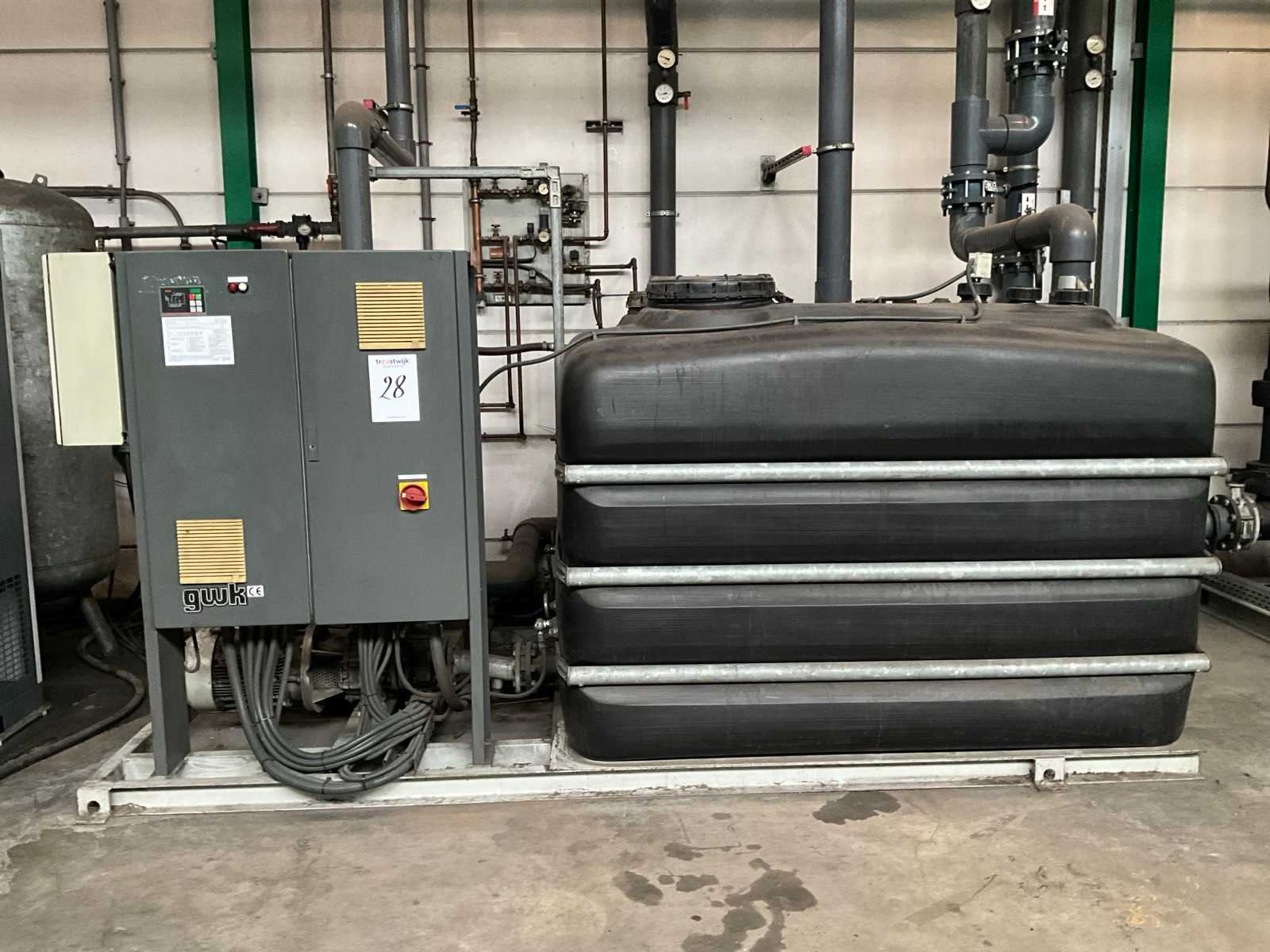 consisting of 1x cooling water cooling unit, equipped with 1x cooling compressor \"DWM Copeland, 2x cooling water tanks, 2x circulation pump, control box, floor area 2700x2400 mm, 1x condenser on the roof, equipped with 3x fan, condenser size (LxWxH) 5000x1700x1700 mm, Please note! pick up by appointment, piping not included, refrigerant has already been drained Auction-ID: A1-43992-31