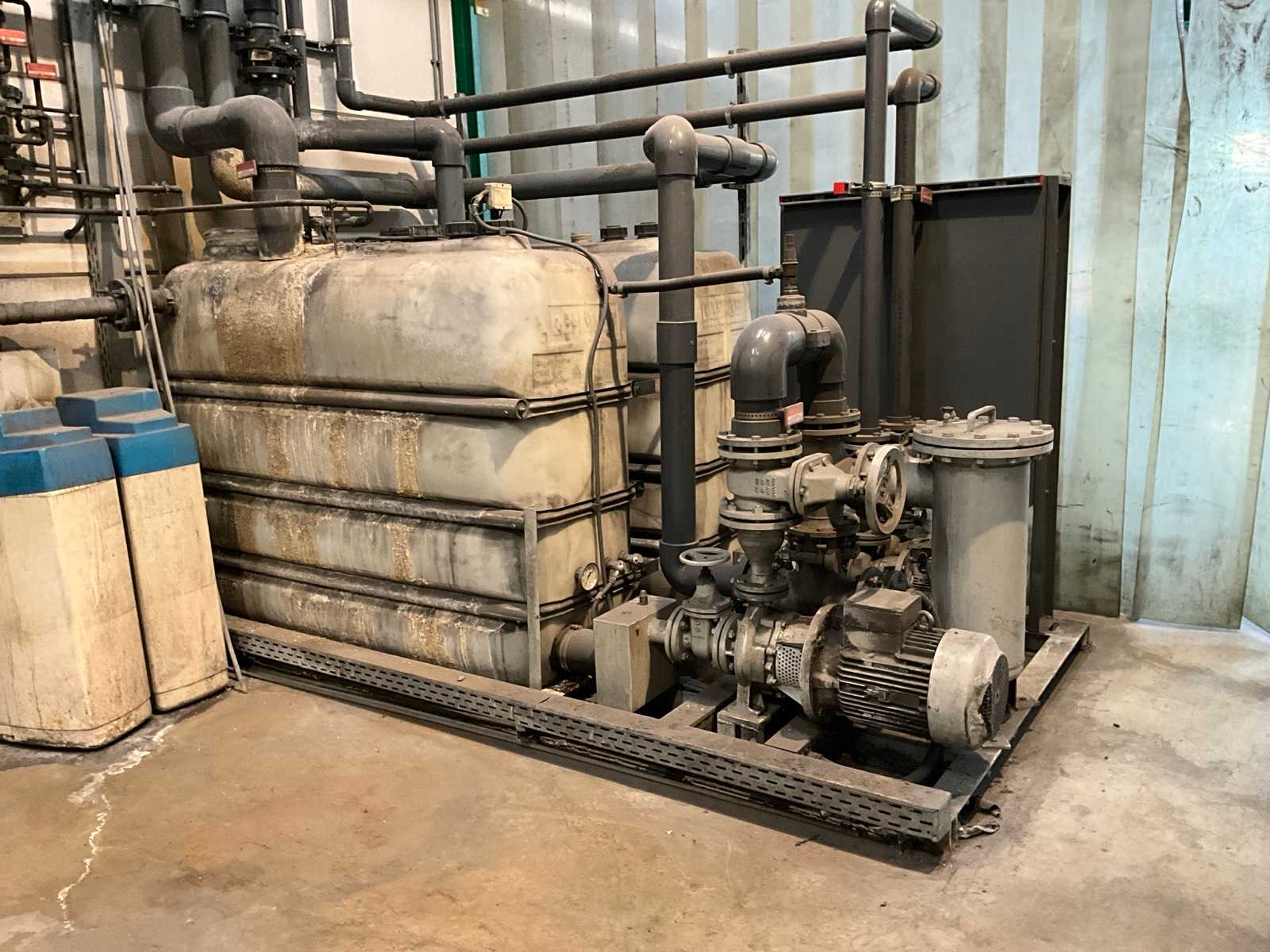consisting of 1x cooling water pump unit, equipped with 2x 3000 ltr cooling water tanks, 2x circulation pump, control box, floor area 3800x2500 mm, 1x condenser on the roof, equipped with 10x fan, condenser size (LxWxH) 9000x2550x2200 mm, Please note! pick up by appointment, piping not included, refrigerant has already been drained Auction-ID: A1-43992-28