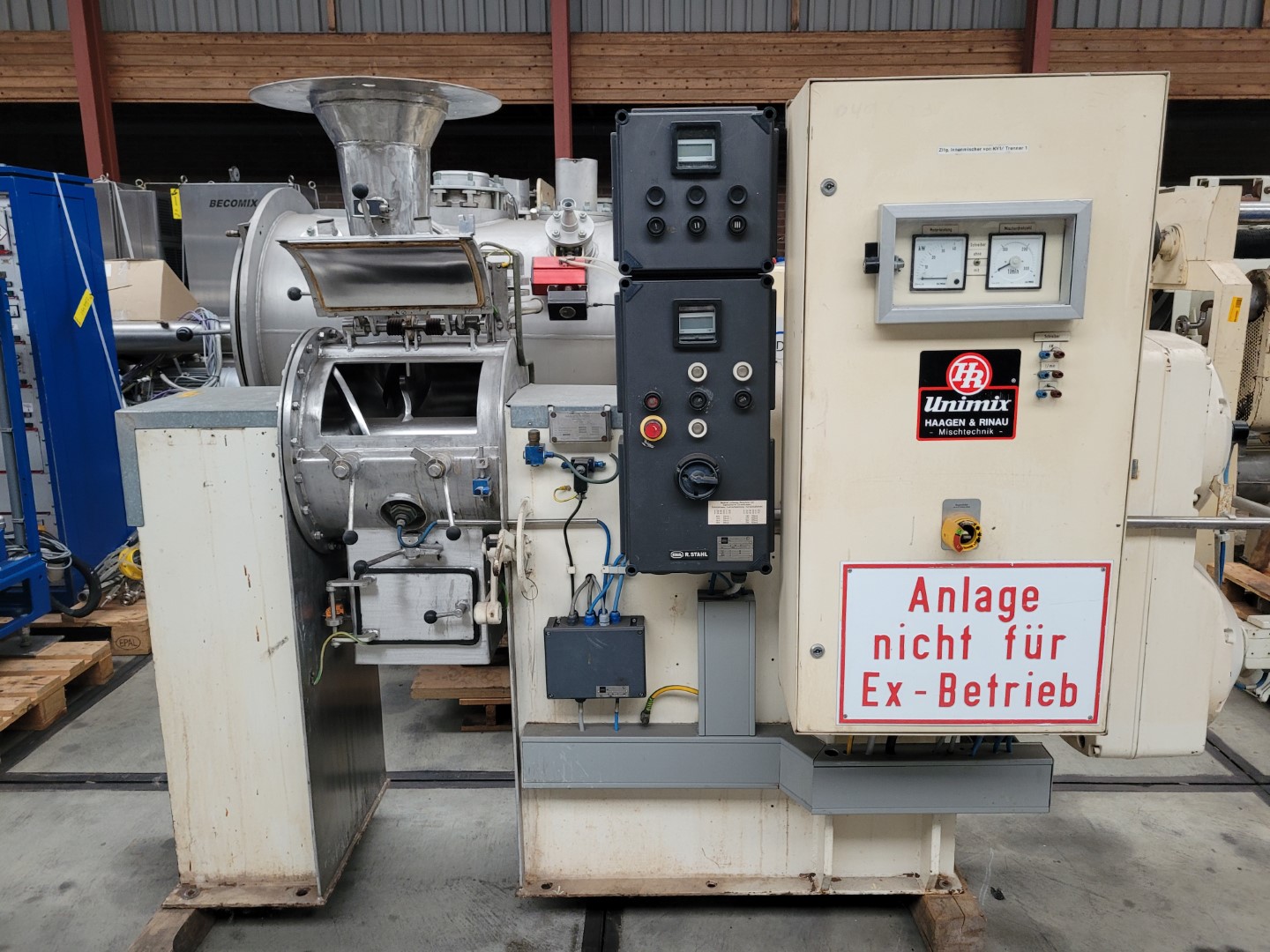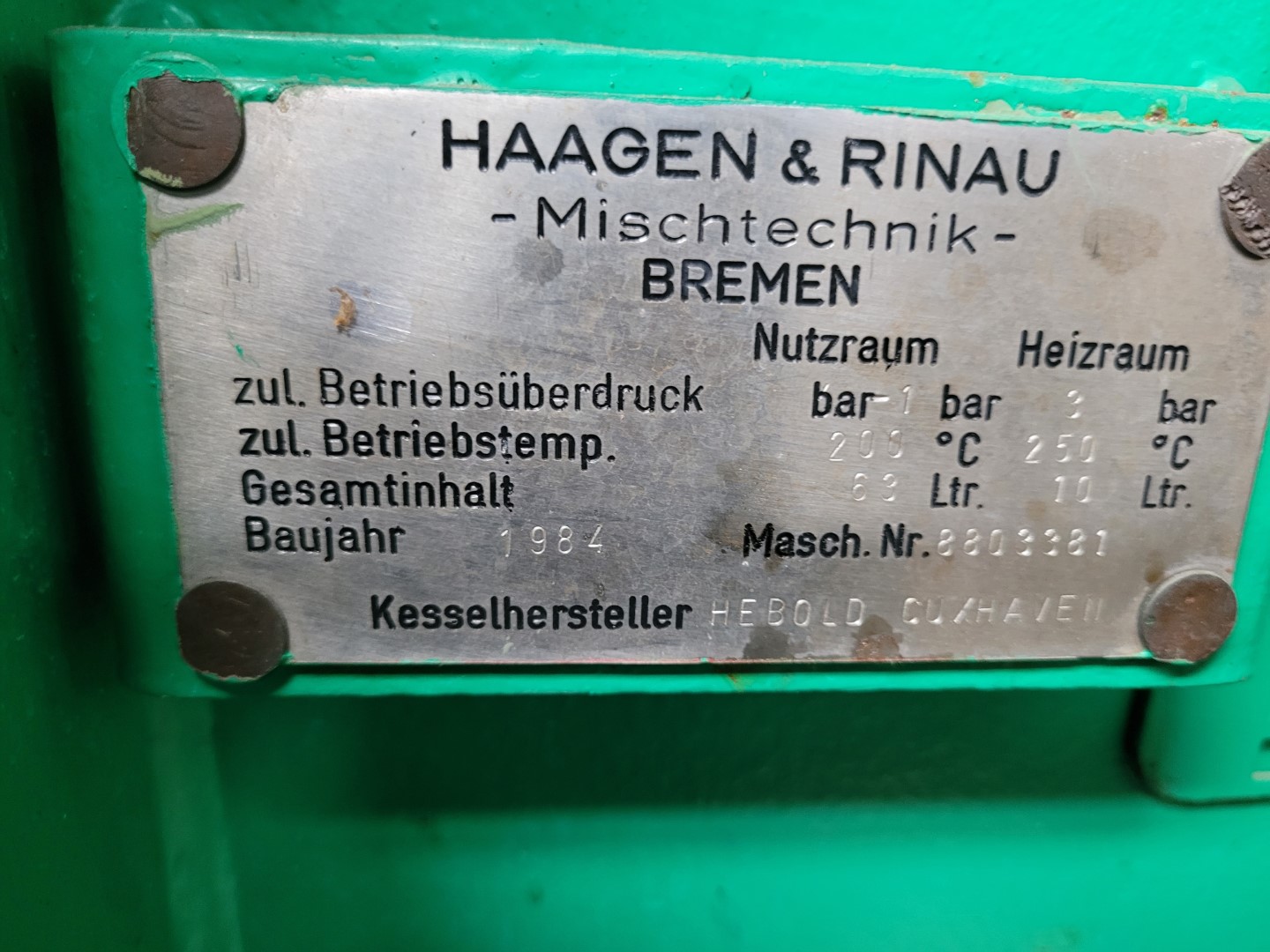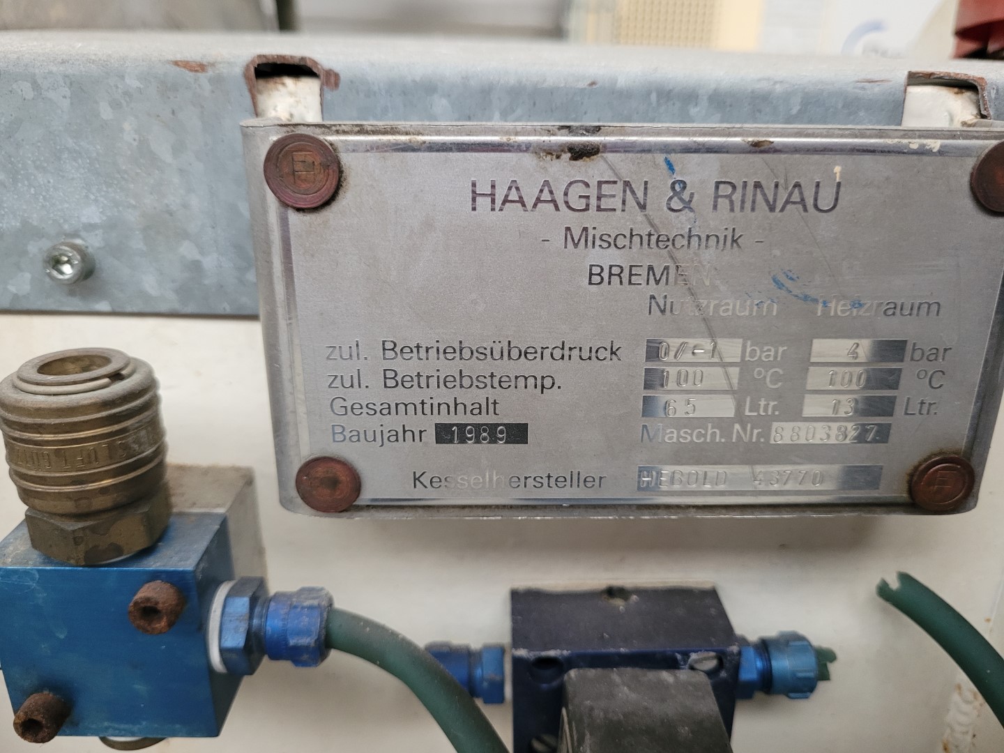 Laboratory processing plant UNIMIX Manufacturer: Haagen & Rinau Factory no.: 865 3779 Built: 1979 Permissible operating overpressure: container: 4 bar, tube side: 6 bar Total content: 5.5 l Usable volume: 3 l with speed-controlled agitator with speed-controlled homogenizer integrated heating Vertical stroke (water hydraulics) with temperature regulatioin with control system LWH: 750 x 360 x 850 mm