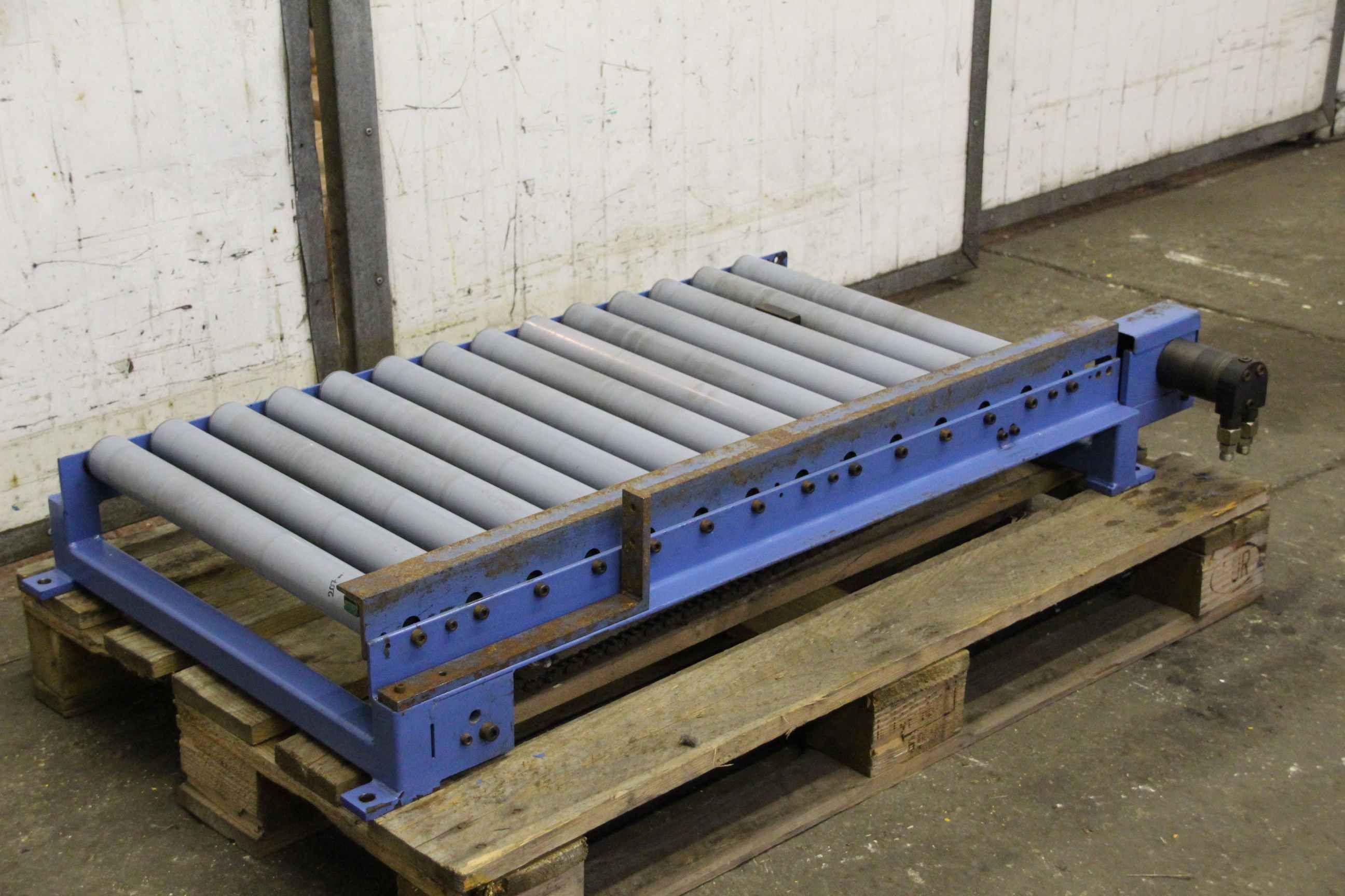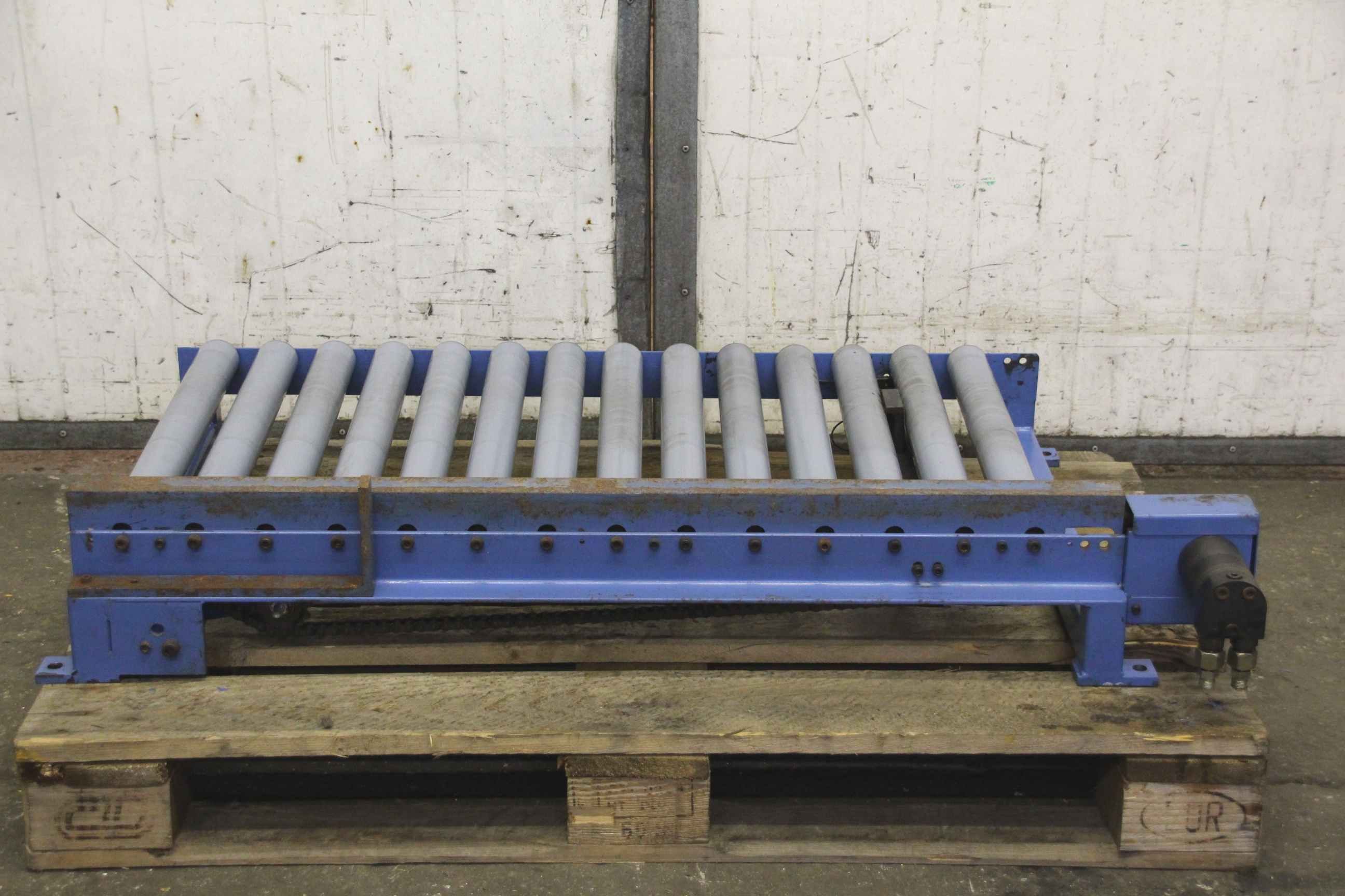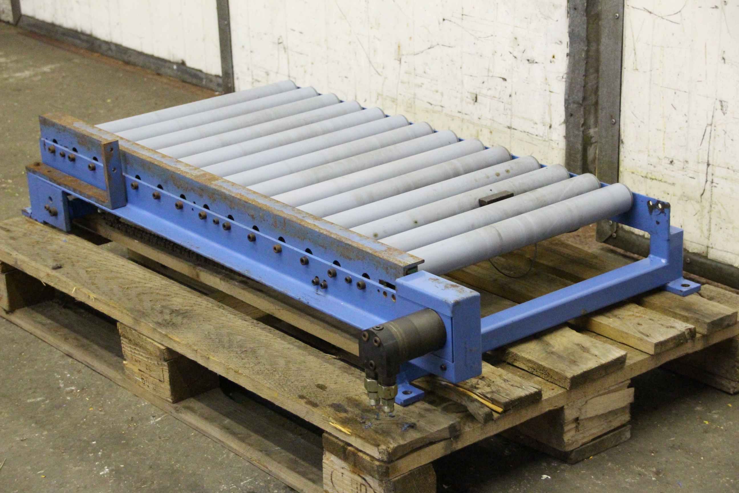 Properties: Condition: fully functional, with signs of wear Ideal for fast material transport Expertly dismantled and packed Pallet roller conveyor/ roller conveyor/ pallet conveyor technology Manufacturer: Claus Maschinenbau Condition: Used Drive type: Chain drive Plant consisting of: 12 segments 9x approx. 5.75 meters in length 1x approx. 5.30 meters in length 1x approx. 2.00 meters in length 1x approx. 0.95 meters in length Each element is equipped with its own motor. Total length: approx. 60 meters Total width incl. motor: approx. 1250 mm Total width without motor: approx. 1020 mm Conveying width: approx. 820 mm Roll diameter: approx. 80 mm Axes/roller spacing: approx. 80 mm Frame width: approx. 85 mm Frame height: approx. 185 mm Colour: blue Pallet guide included Including SEW motors 1.1 KW Includes feet - height adjustable Price per meter ...