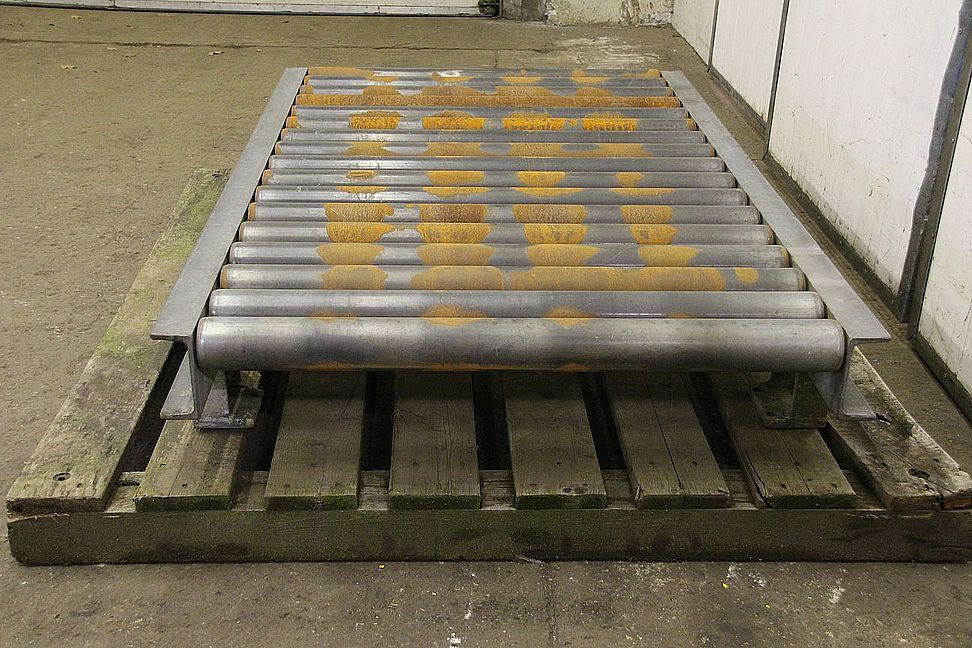 <b>Properties</b> Used pallet roller conveyor of the manufacturer of rack & roll GmbH Condition: Excellent condition with light wear Color: Silver Feet must be ordered separately Expertly disassembled and packed Pre-assembled on a length of 2,640 mm Including a drag reel per item Price per meter <b>Technical data Pallet roller conveyor dimensions approx.</b> Total length of an element: 2,640 mm Total width: 930 mm <b>Mass of the rollers and the frame about</b> Clamping length approx.: 835 mm Diameter approx.: 60mm Distance approx.: 150mm Material: Steel, galvanised Frame: 80x40mm Brake pulley diameter: 90 mm In stock: 140 metres <b>Pallet roller conveyor</b> Thanks to the superb craftsmanship of the pallet roller conveyor glides your material, even under high load, gently to the place of destination. ...
