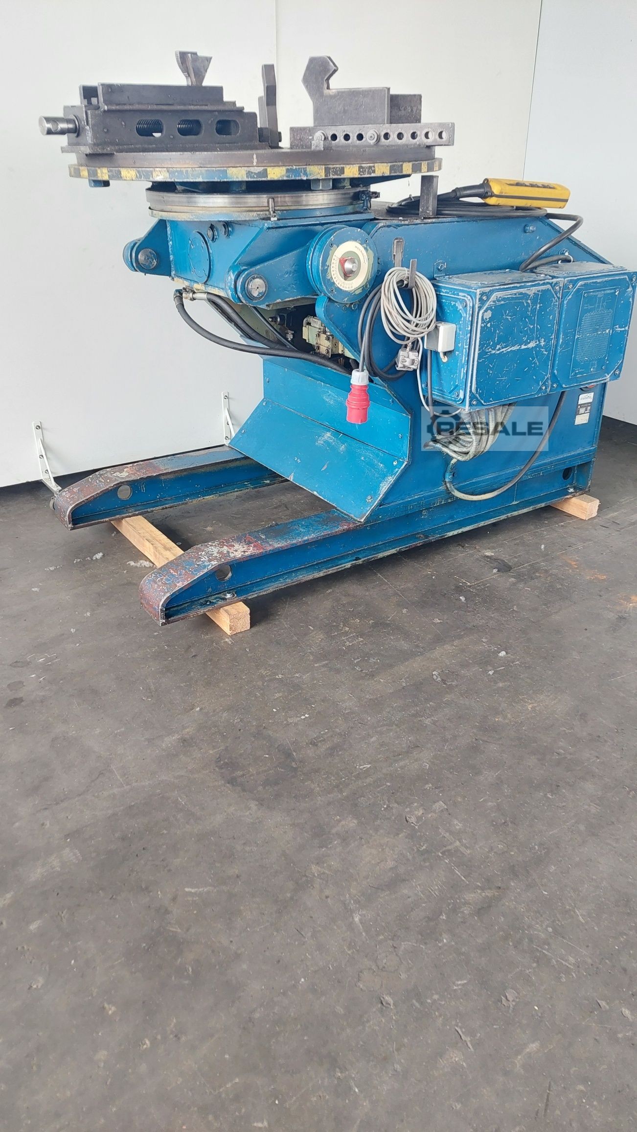 Offer 26128 Technical data: - Max. load capacity in horizontal position 5000 kg - Face plate diameter 1150 mm - Face plate motorized swivel 0 - 130 ° - Rotary movement electr. Infinitely variable - Right + Counterclockwise - Welding current transmission approx. 500 A - Drive 400 V - Table height in horizontal position approx. 1220 mm - Handheld remote control - Space requirement approx. W 1350 x H 1220 x D 1900 mm - Weight approx. 3500 kg - Adapter plate with clamping device for round material
