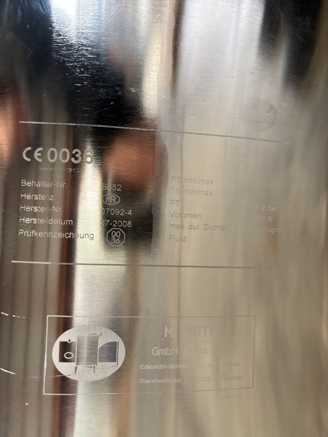 General SKU327X684 MakeM. Roth LocationBarneveld CEcheck Type280 l Pressure Working pressure4 Bar Vacuum possiblecheck Main Features MaterialStainless steel Volume280 Ltr. Motor0.37 KW Specified Features - Stirring vessel MaterialStainless steel 1.4404 (316L) Closed stirring vesselcheck Capacity280 l Vessel sizesDia. 600x1000 mm Dished bottomcheck With covercheck Top connectionscheck OutletDN30 Max. temperature144°C With propellor stirrercheck double Motor0,37 kW (230 V 1390 rpm, (Ex)) Speed mixing shaft211 rpm Information No.B850 Year of construction2008 Mounted on legscheck Floorspace0,75x0,75 m Total height2,70 m Weight340 kg Extra SpecificationsWith Endress+Hauser flow meterStirring vesselsM.rothStirring vessels > Stirring vesselsBrand > M.roth What you can expect from Foeth: -- Machine is in working condition -- At a reduced price compared to new - ...