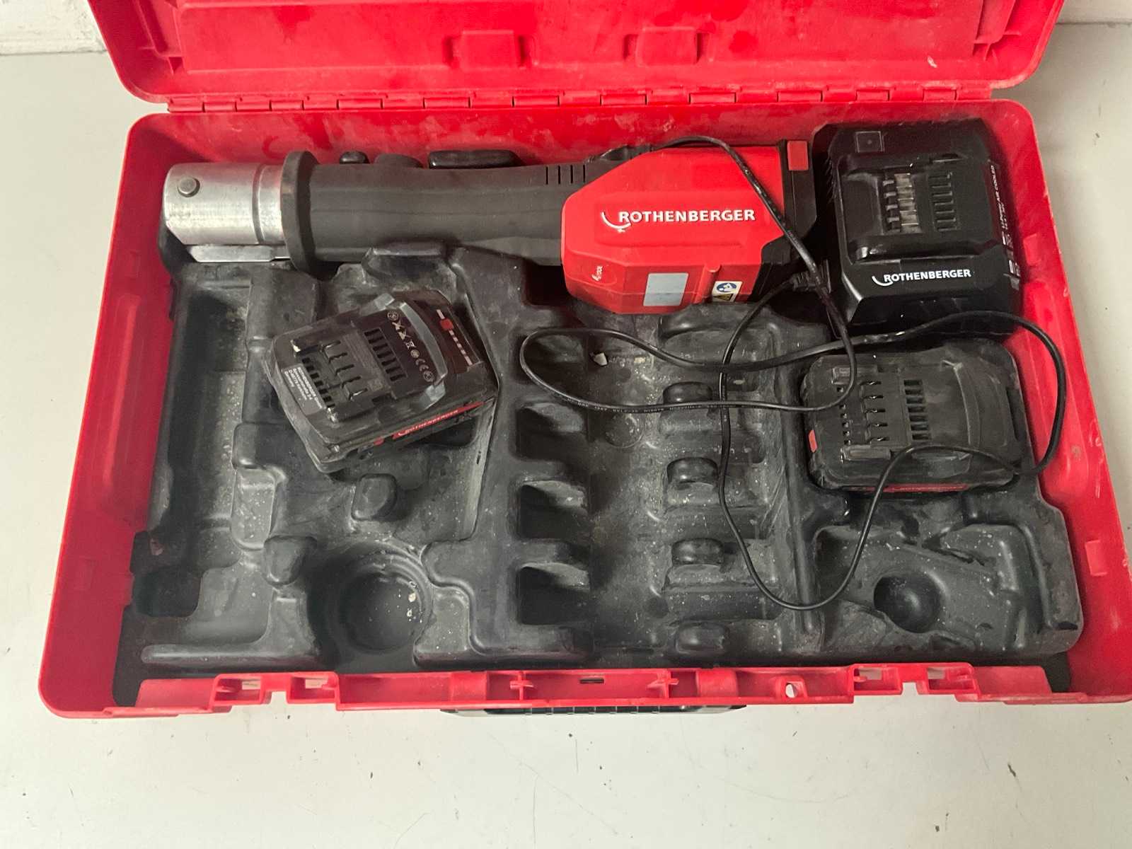 Thread cutting machine, pipe thread cutter -Manufacturer: Rothenberger, Thread cutting machine type Supertronic 2SE without thread cutting head -Pipe size: 1/2 to 2 inches -Spindle bore: Ø 68 mm -Operating voltage: 230 volts -Speed: 40 rpm -Foot switch: with emergency stop function -Equipment: Pipe cutter, internal deburrer -Dimensions: 500/480/H370 mm -Weight: 46.6 kg