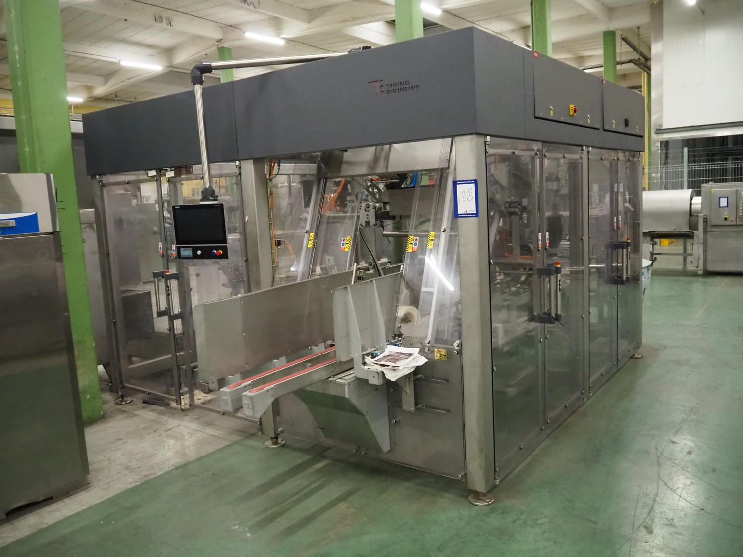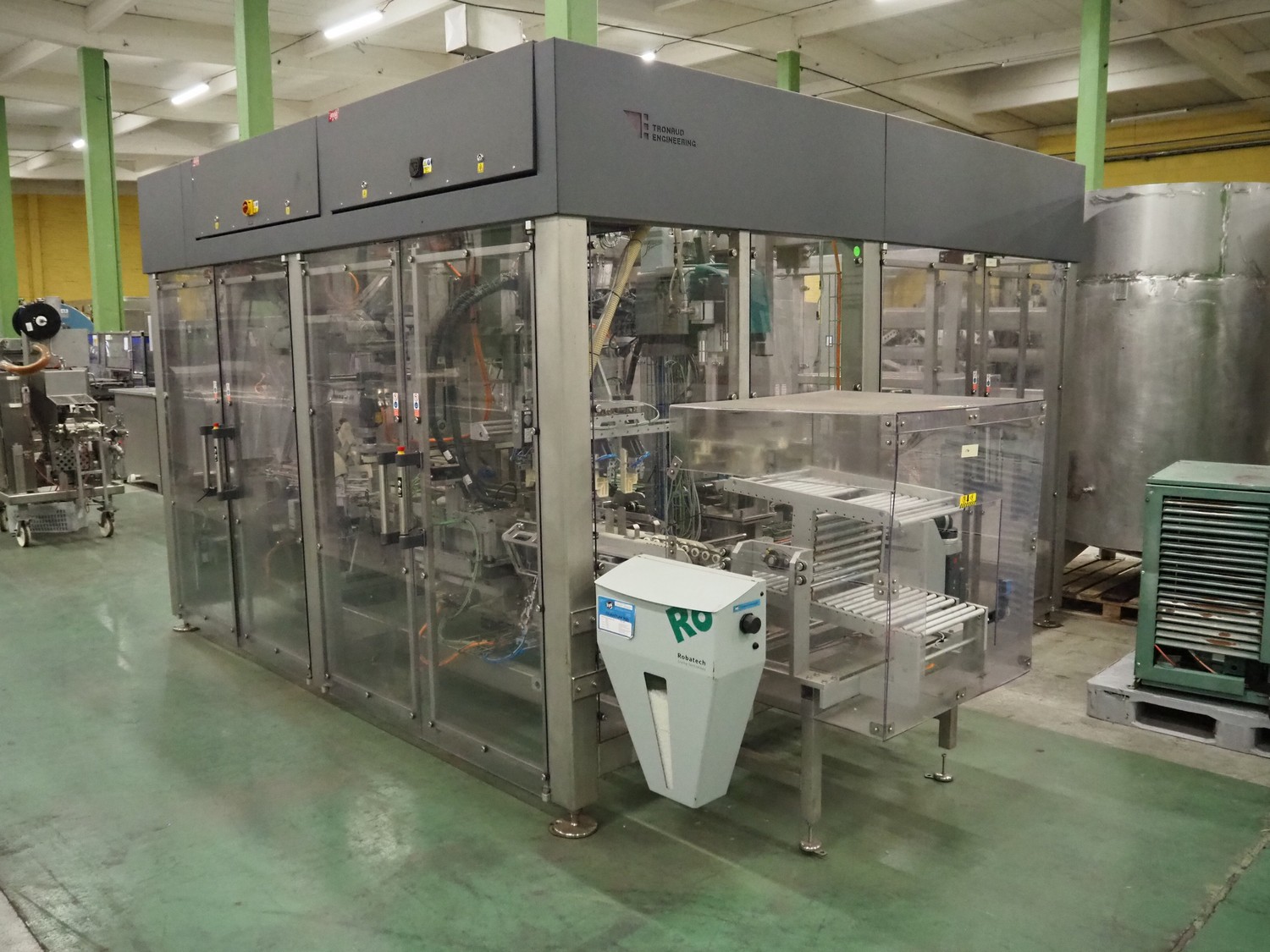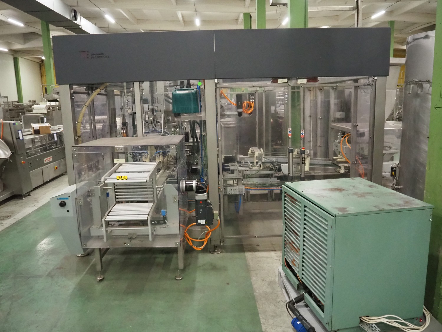 Tronrud Engineering case packer, type: CP30, serial number: TE1002350, year of construction: 2018, 400 V, 3 Ph, 50 Hz, 25 A, weight: 2700 kg, capacity: 30 cases / minute, plastic infeed belt, belt width: (2x) 30 mm, clearance: 340 mm x 380 mm, plastic outfeed belt, belt width: 330 mm, total dimensions: 4650 mm x 5650 mm x 2570 mm.