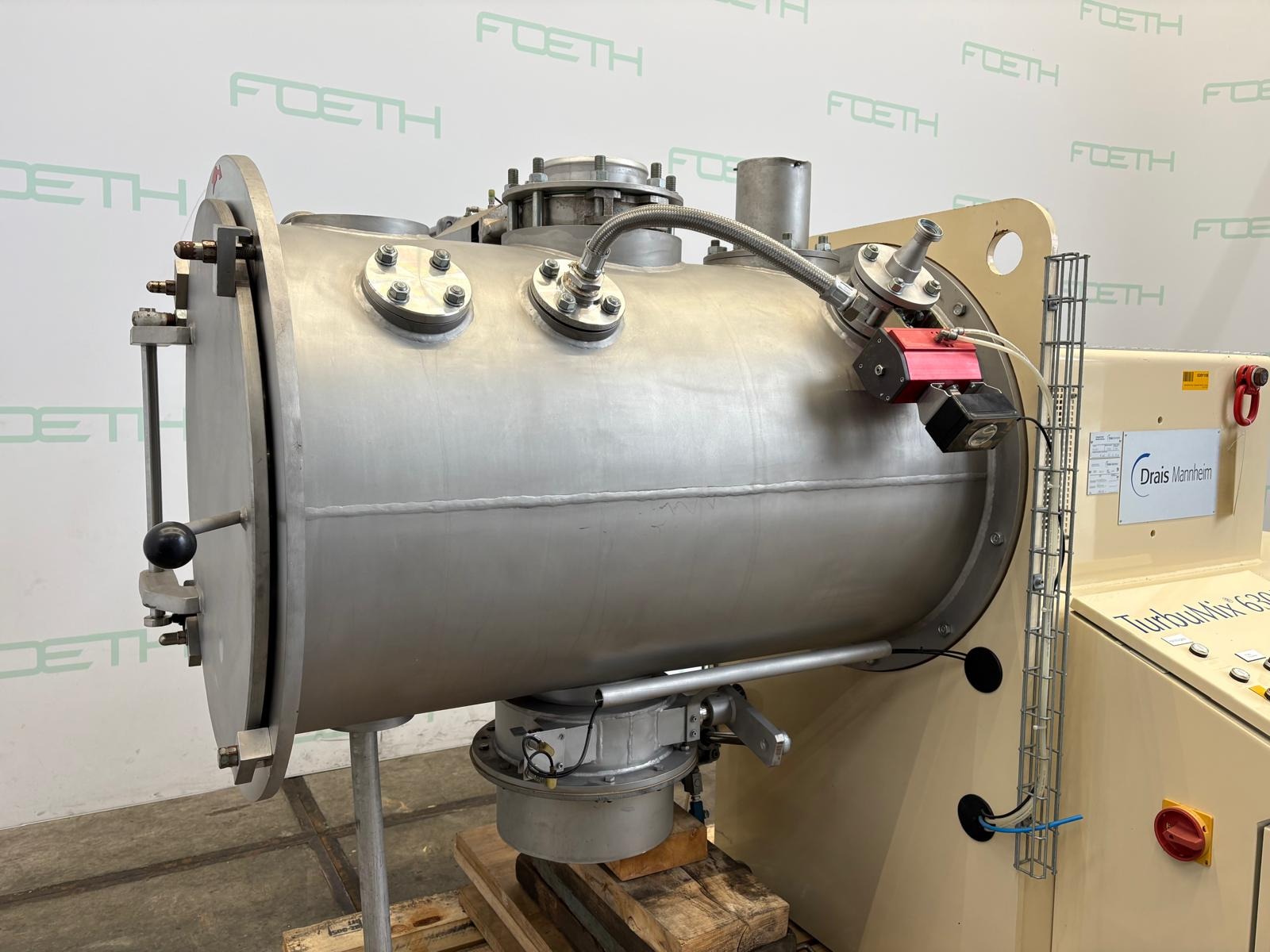 General SKU020Y108 MakeDrais Mannheim TypeTurbuMix TM-630E FM1 No.56082 Year of construction2000 LocationBarneveld Main Features MaterialStainless steel Volume630 Ltr. Motor25.5 KW Specified Features - Powder turbo mixer MaterialStainless steel 1.4541 (321), Stainless steel 1.4571 (316Ti) Powder turbo mixercheck T-armscheck Capacity630 l. Useful capacity189—470 l. Trough sizesø 800 x 1300 mm Top connectionsø 250 mm, ø 150 mm, ø 100 mm Inspection hatchø 800 mm Outletø 160 mm, ø 75mm Motor12,0/18,0 kW 400 V Speed mixing shaft± 63/126 rpm With lump breakercheck 2x Motor7,5 kW, 380—420/660—690 V Speed lumpbreaker1450 rpm Information With switchgearcheck Floorspace3,4 x 2,2 m Total height1,8 m Weight3700 kgPowder turbo mixersCatalysts & fillersFeed additivesDiscountOther pharmaceuticsCosmeticsFood additivesSugarAnimal feedOther feedConfectionerySol ...