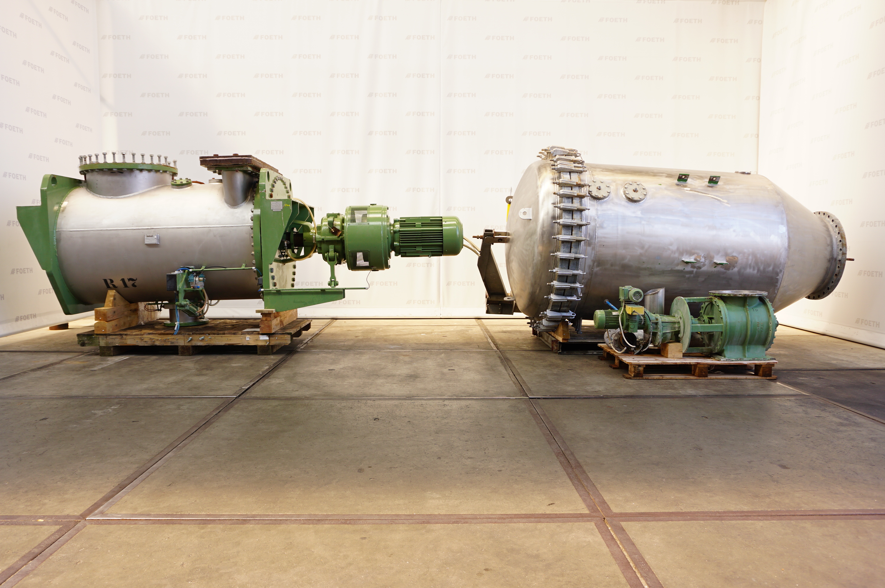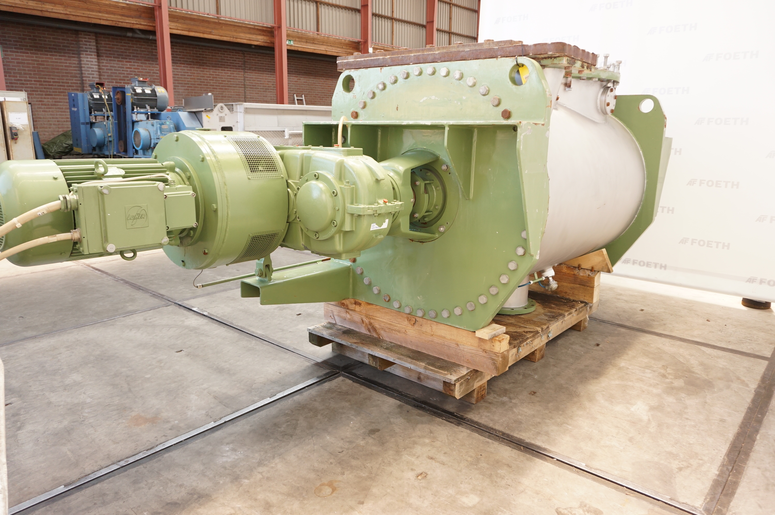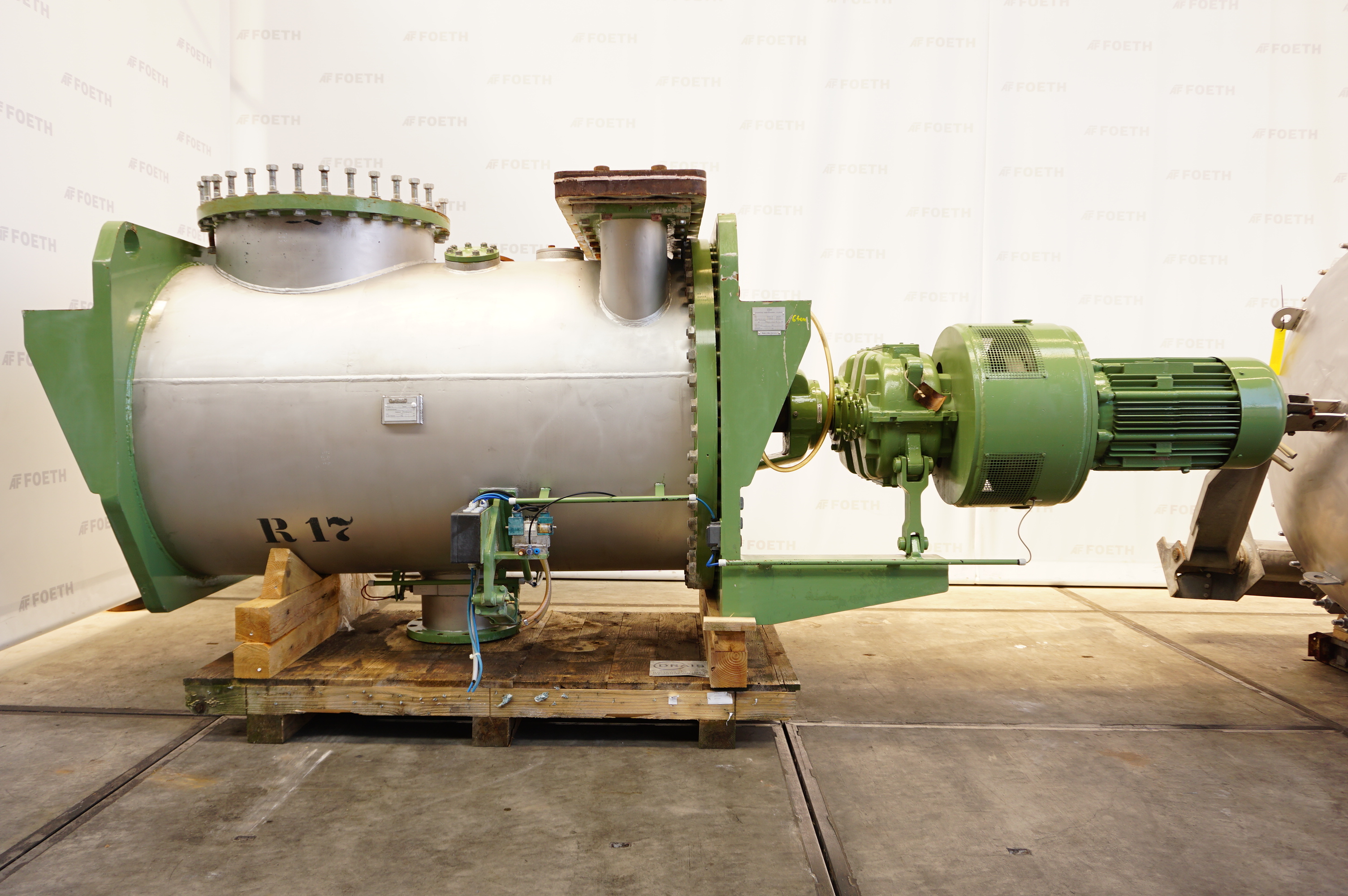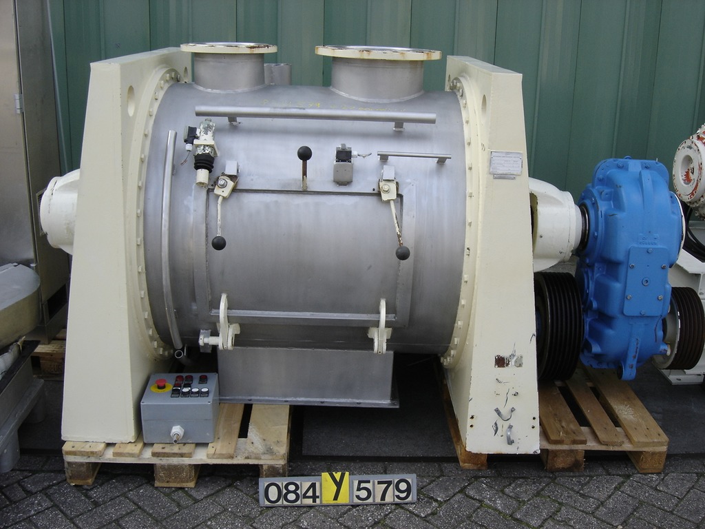 General SKU024W116 MakeDrais TypeTC-1600 FM I No.54940 Year of construction1994 LocationBarneveld Pressure Working pressure1 Bar Working pressure jacket6 Bar Main Features MaterialStainless steel Volume1600 Ltr. Motor50 KW Specified Features - Powder turbo mixer MaterialStainless steel 1.4571 (316Ti) Powder turbo mixercheck T-armscheck Capacity1600 Ltr Trough sizesdia. 1000x2000mm Inlet2x 500x500mm Outlet± dia. 150mm With jacketcheck (120 Ltr) Max. temperature164°C With adjustable packing glandscheck Motor50/50/50 KW, 400 Volt Speed mixing shaft30/60/90 Rpm With lump breakercheck (3x) Motor17,5/23,0 KW, 400 Volt Speed lumpbreaker1500/3000 Rpm Information With switchgearcheck Floorspace4,1x2,5 m Weight10.000 kgPowder turbo mixersCatalysts & fillersFeed additivesDiscountOther pharmaceuticsCosmeticsFood additivesSugarAnimal feedOther feedConfectionerySoli ...