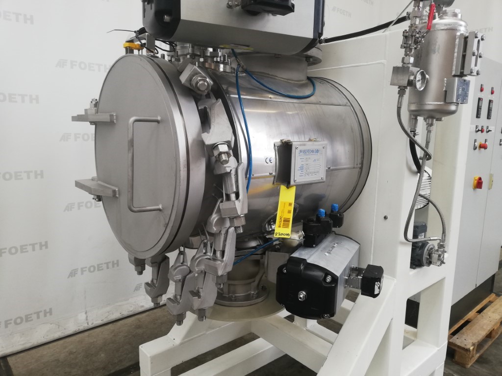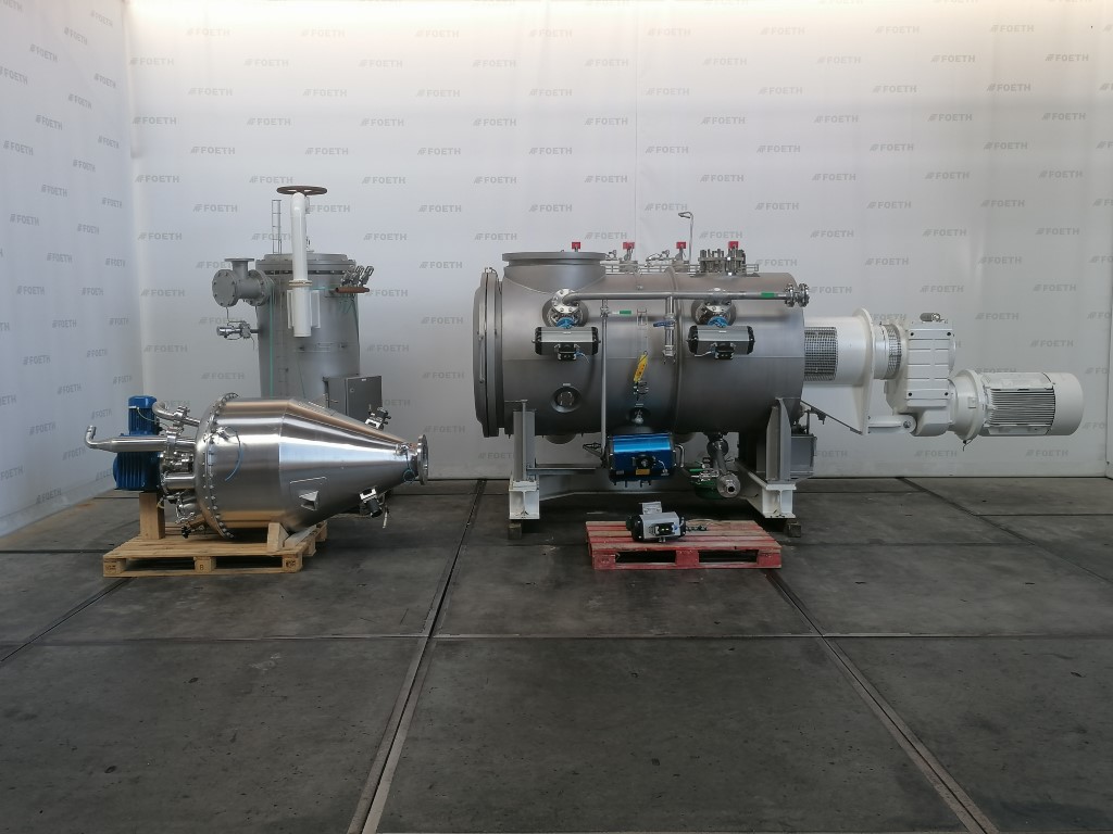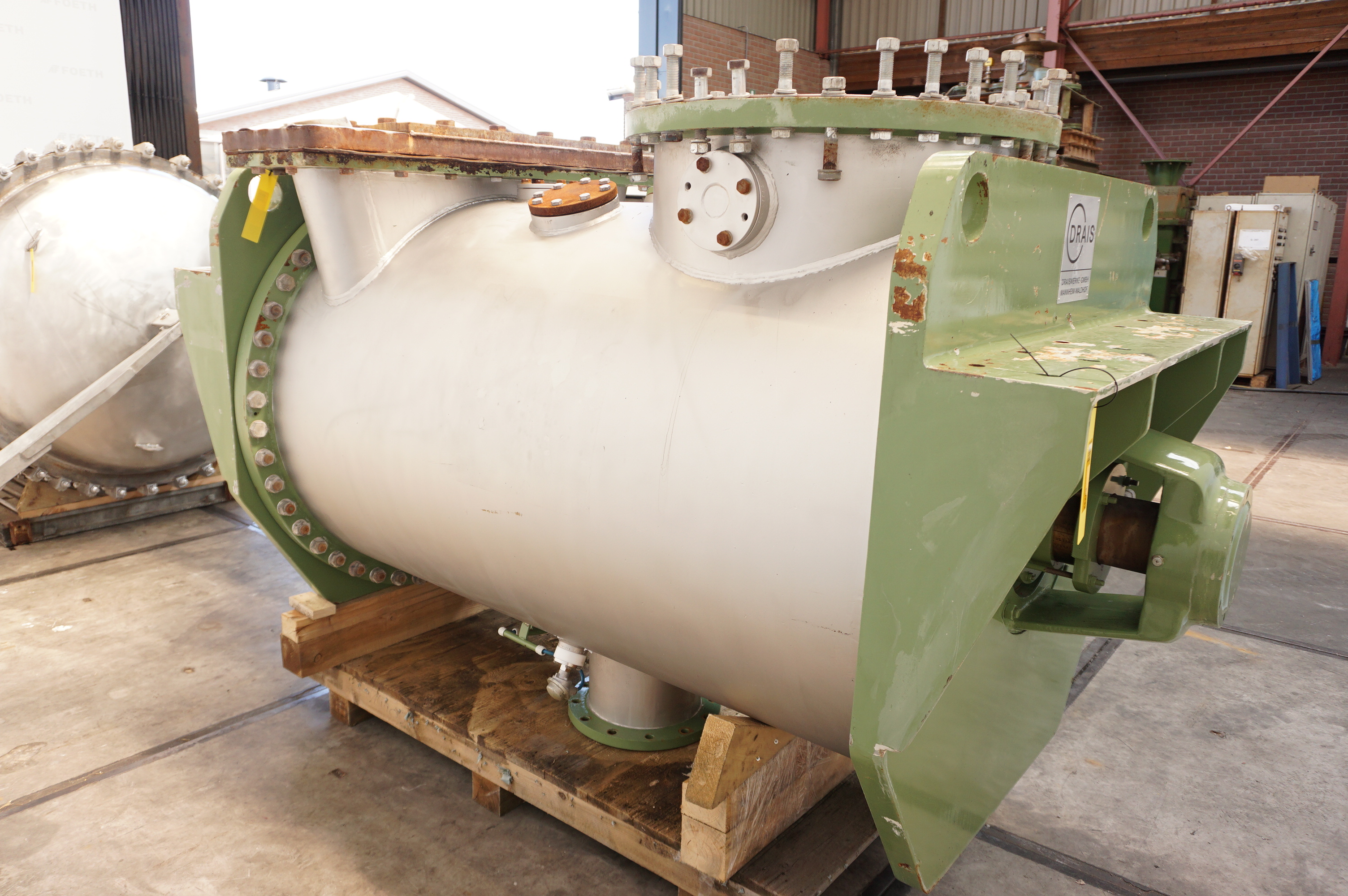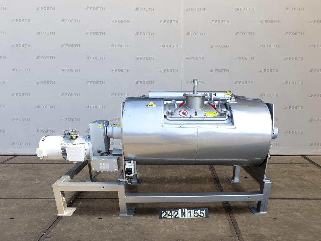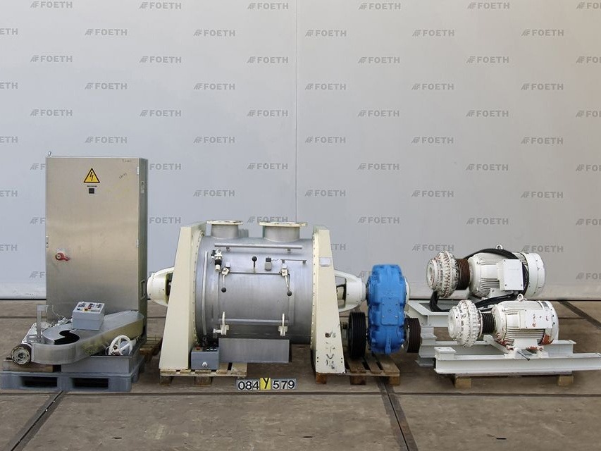 General SKU024W116 MakeDrais TypeTC-1600 FM I No.54940 Year of construction1994 LocationBarneveld Pressure Working pressure1 Bar Working pressure jacket6 Bar Main Features MaterialStainless steel Volume1600 Ltr. Motor50 KW Specified Features - Powder turbo mixer MaterialStainless steel 1.4571 (316Ti) Powder turbo mixercheck T-armscheck Capacity1600 Ltr Trough sizesdia. 1000x2000mm Inlet2x 500x500mm Outlet± dia. 150mm With jacketcheck (120 Ltr) Max. temperature164°C With adjustable packing glandscheck Motor50/50/50 KW, 400 Volt Speed mixing shaft30/60/90 Rpm With lump breakercheck (3x) Motor17,5/23,0 KW, 400 Volt Speed lumpbreaker1500/3000 Rpm Information With switchgearcheck Floorspace4,1x2,5 m Weight10.000 kgPowder turbo mixersCatalysts & fillersFeed additivesDiscountOther pharmaceuticsCosmeticsFood additivesSugarAnimal feedOther feedConfectionerySoli ...
