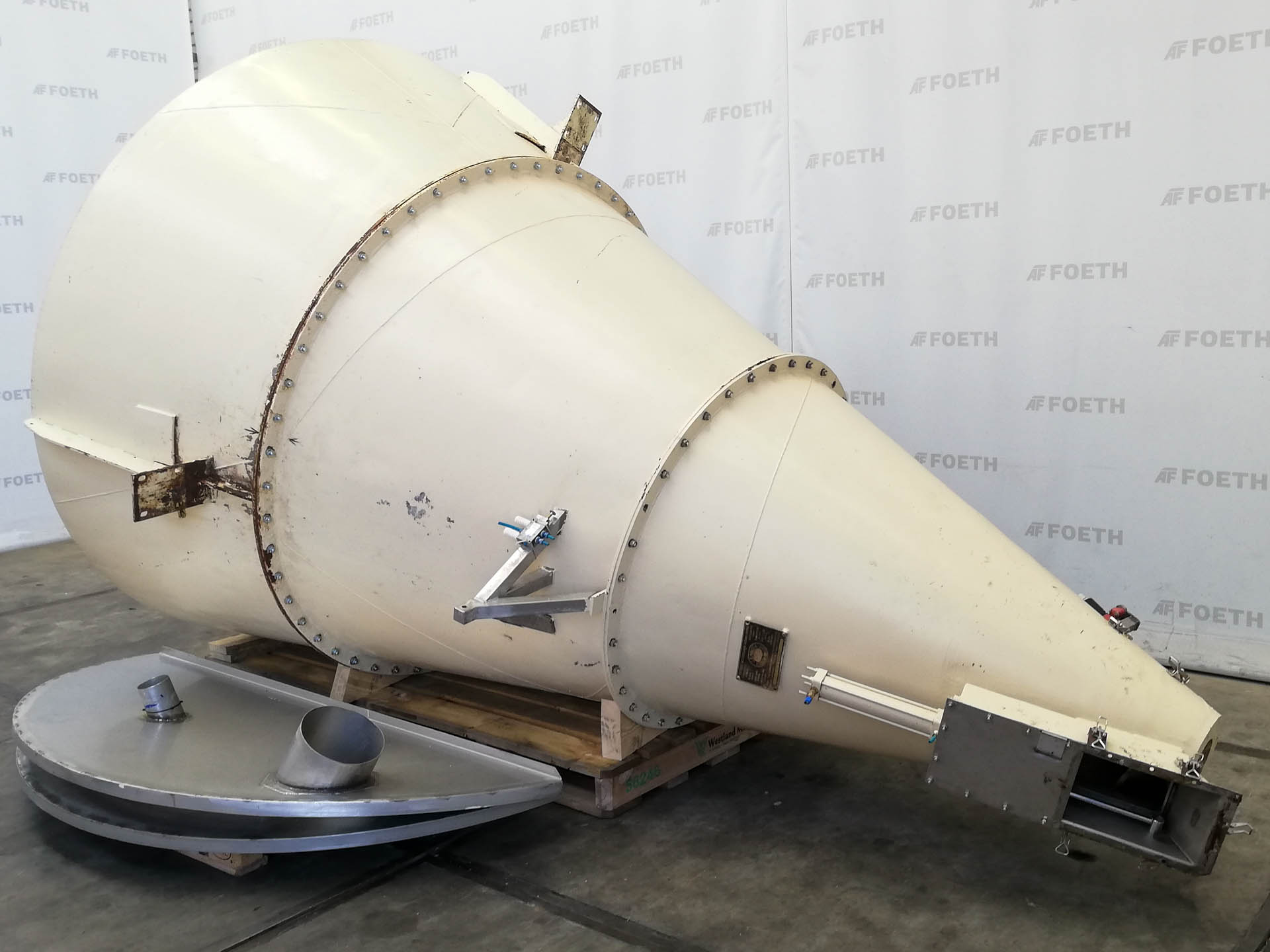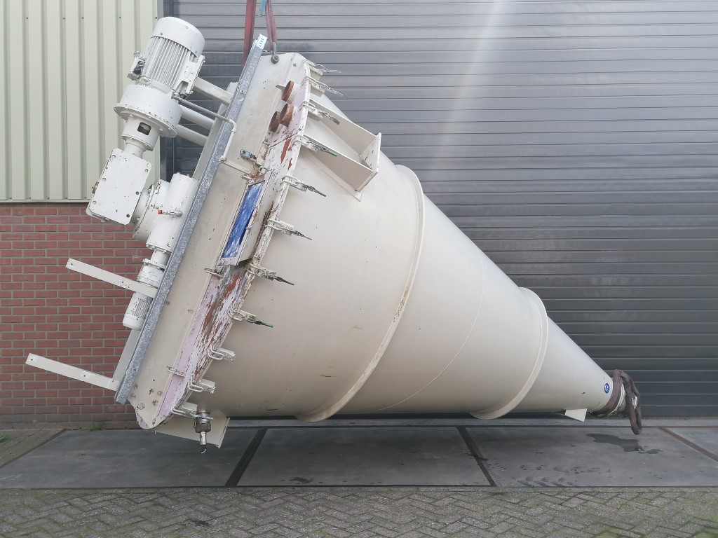 Holy V-mix, Nautamix, Vrieco-, NAUTA mixer, cone mixing N.M. Holy b.v. V-mix 25,000 PLR New machine of the mixer is on your products (E.g., particle size, bulk density) and environment (E.g. ATEX zoning) adapted. -Capacity: 25,000 litres water filling -Usable volume: approx. 22,500 litres depending on the product properties -Container, lid, swing arm, mixing screw, spout housing made of V2A -Traverse normal steel, is covered but to the tank interior with a V2A plate. -All lubricants are H1 & halal approved and certified