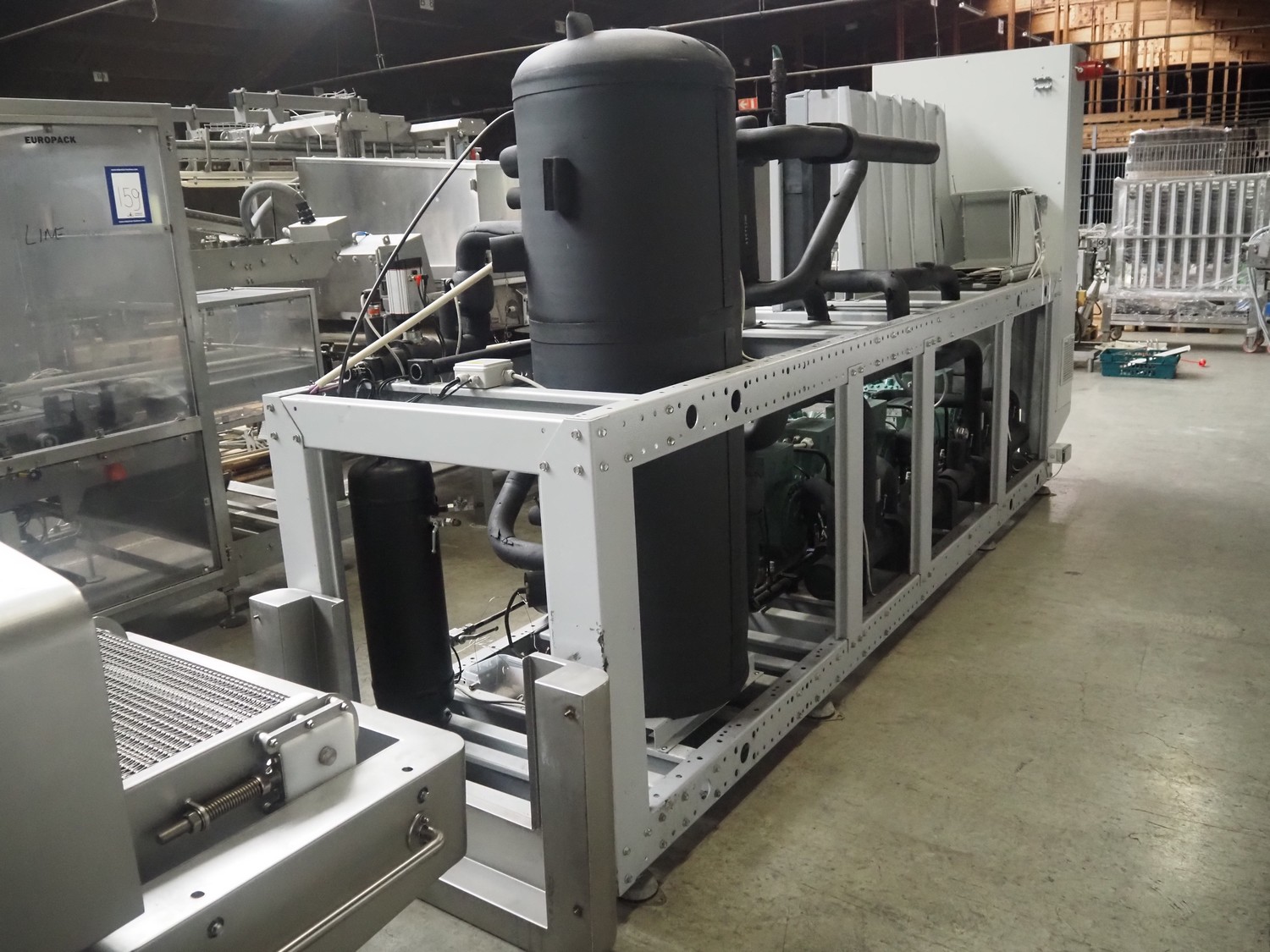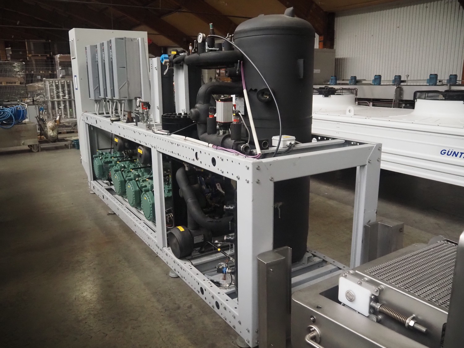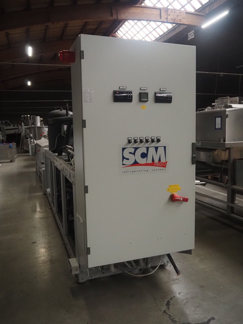 Complete cooling installation consisting of: SCM Frigo S.p.a. cooling compressor rack consisting of 5 Bitzer cooling compressors, type compressors: (3x) 4HTC-15K-40S and (2x) 4HTC-15K-40S, dimensions: 4450 mm x 1000 mm x 2000 mm, Güntner roof condenser, 3 fans, dimensions: 4450 mm x 1000 mm x 2200 mm, 31 evaporators, among others: AIA, Searle and Güntner, dimensions: (11x) 2300 mm x 350 mm x 550 mm, (4x) 2550 mm x 420 mm x 550 mm, (4x) 1500 mm x 400 mm x 520 mm, (1x) 1340 mm x 850 mm x 260 mm, (11x) 1400 mm x 1600 mm x 400 mm, switch cabinet, dimensions: 1000 mm x 1000 mm x 300 mm, pallet with parts.