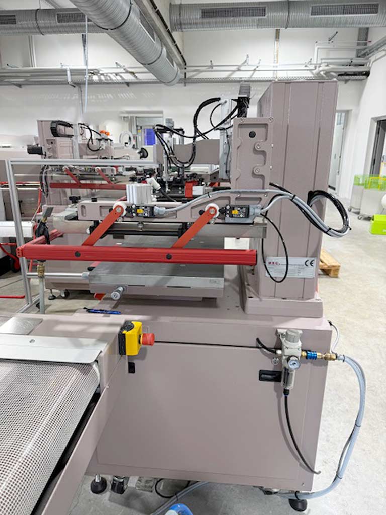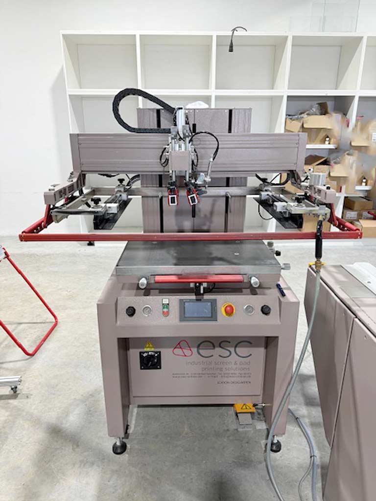 Four identical screen printing machines ESC are available. Rigid material thickness: 200mm, max. print format X/Y: 400mm/600mm, vacuum plate dimensions X/Y: 500mm/700mm, vacuum area dimensions X/Y: 405mm/600mm, max. frame dimensions X/Y: 600mm/940mm, frame profile range: 25mm-47mm, max. print material thickness: 200mm, working height: 960mm, frame lift: 270mm, printing speed range: 125mm-750mm/s, max. cycle rate: 600p/h, fine adjustment: +/-10mm, squeegee angle adjustment: +/-9°, working pressure range: 5bar-7bar. Machine dimensions X/Y/Z: approx. 1300mm/1100mm/1600mm, weight: approx. 500kg. Documentation available. An on-site inspection is possible. Individual sale possible.