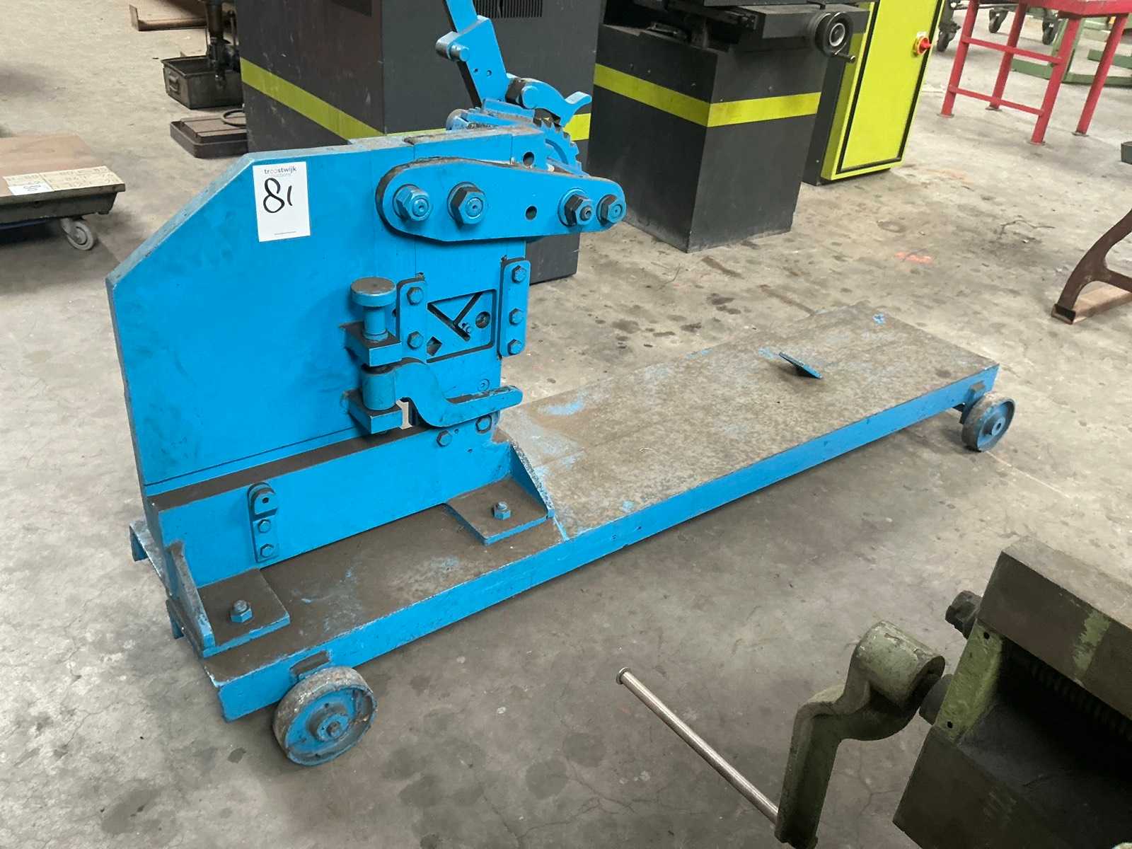 Profile steel shears with>br>- 1 foot release>br>- Support tables>br>- Rectangular notch>br>- Hole punch incl. tools>br>round steel 32 mm>br>square steel 30 mm>br>angle steel 80 x 80 x 8 mm>br>cutting capacity flat steel 80 x 13 mm >br>punching force 36 t>br>projection 170 mm>br>working stroke 28 mm>br>working height 980 mm>br>material thickness 28 x 13 mm>br>hole diameter in sheet thickness 25x10 / 30x8 mm>br>machine weight approx. 0.8 t>br> space requirement approx. 1.8 tbr 2 x 0.8 x 1.9 m >br>condition: unchecked (6)