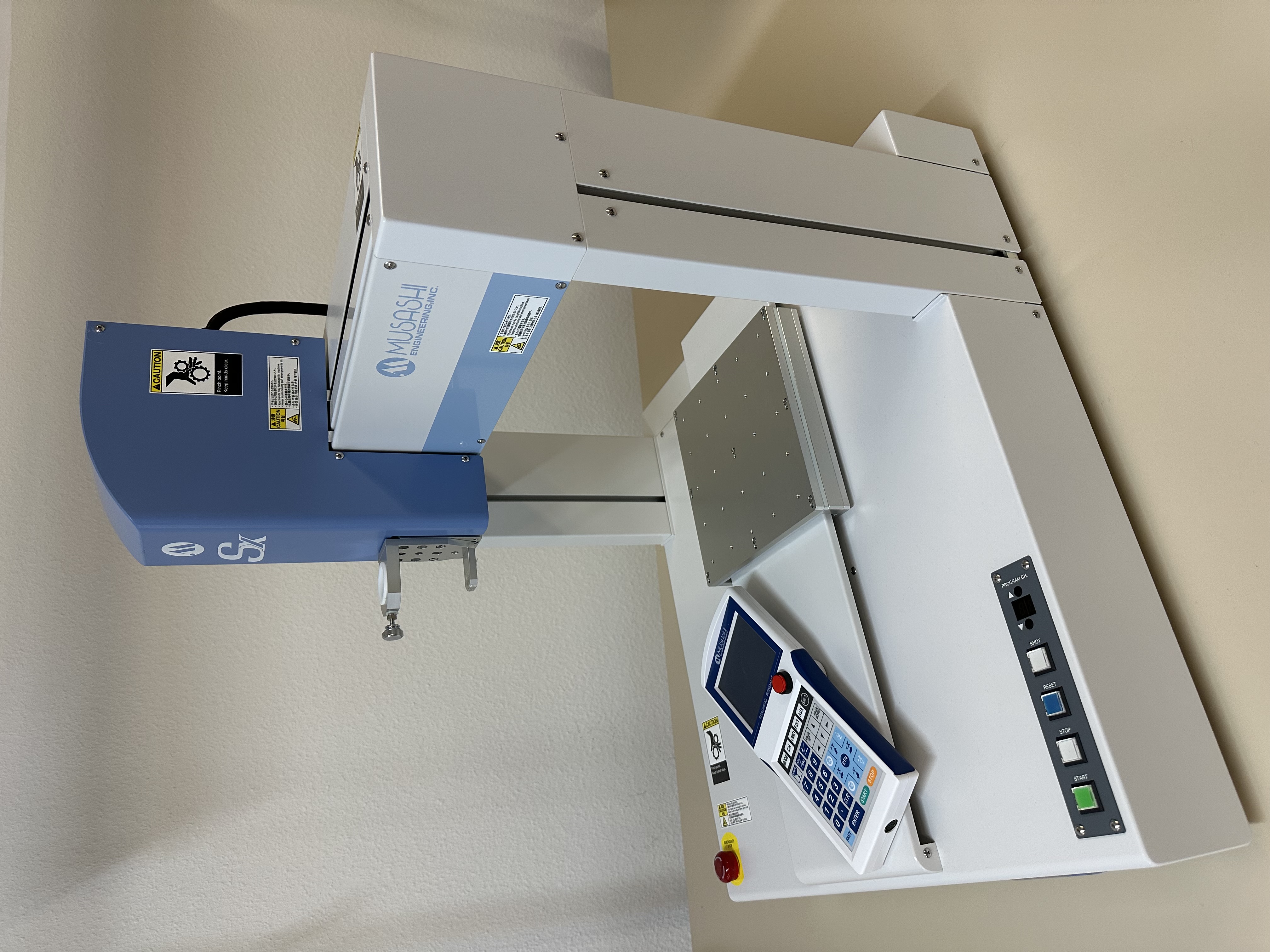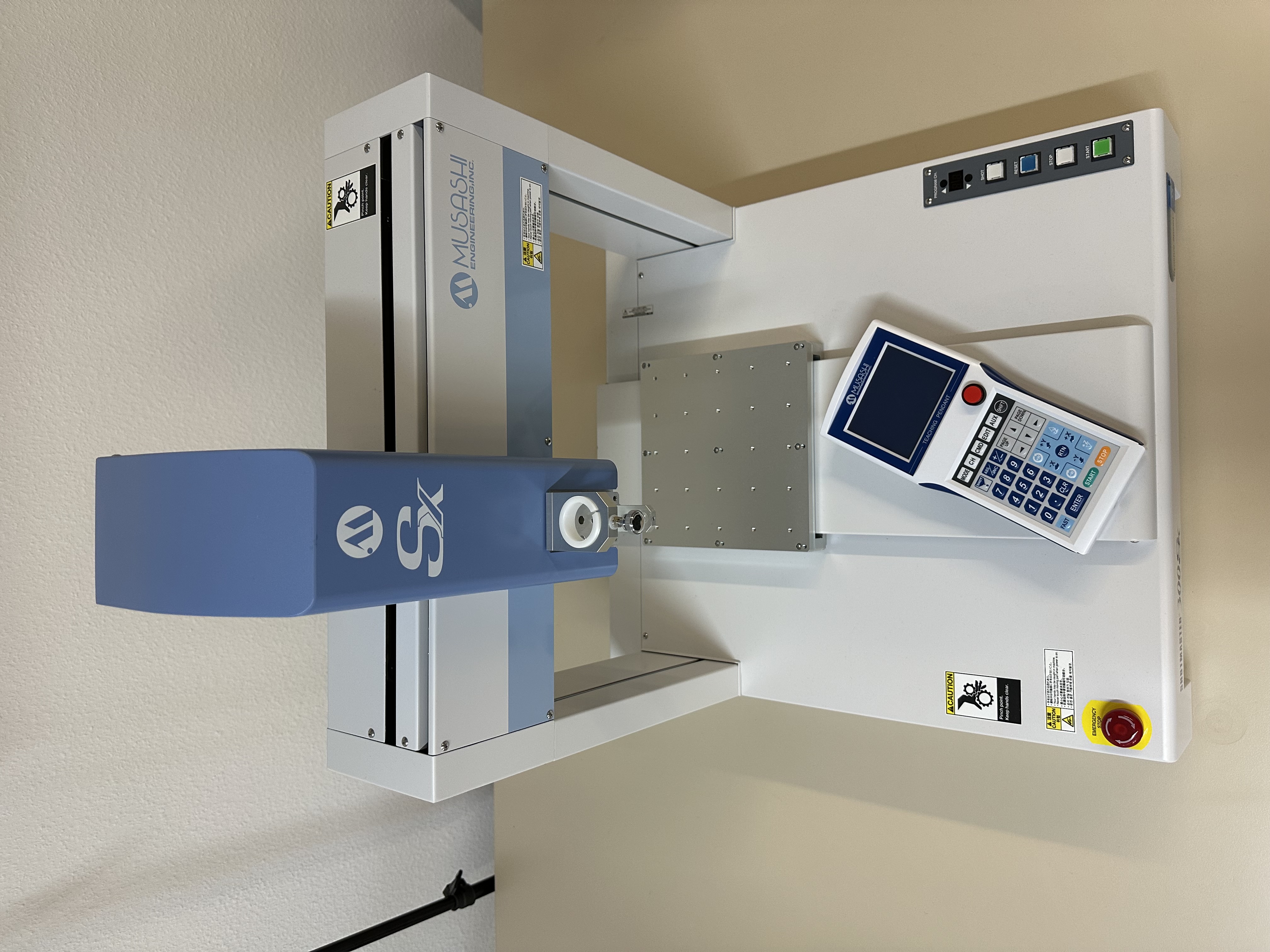 Manufacturer: Musashi Model: ShotMaster 300 SX Type of Machine : Dispensing robot Key features: • Operating speed: 800 mm/s • Positioning accuracy: ±0.01 mm • Synchro Speed function for consistent line width and reduced cycle time Teaching pendant: • Interactive user interface • Stopwatch function • Dispensing condition switching • Data transfer between robots • Language support: Japanese, English, Chinese Hardware configuration: • 26/26 external input/output • USB high-speed communication • Standard buttons: START, STOP, RETURN TO ORIGIN, DISPENSE • Z-axis brake function Find more here - / Contact us at -