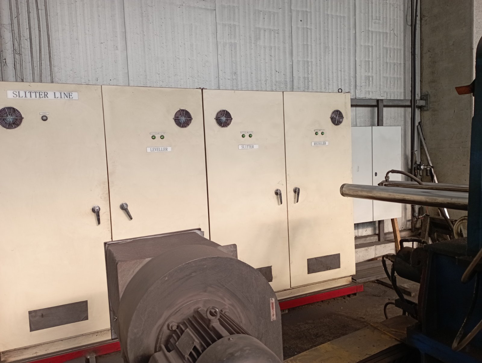Very compact cut to length and slitting line Single unit consisting out of: 1 - decoiler 5 ton, max diameter of coil: 1000 mm 2 - straightener 3 + 4 rolls, 90 mmnbsp;rolldiameter 3 - shear for cut to length 4 - slitting unit with 5 slitting knives 5 - operator cabinet with CNC control (frequency controlled)