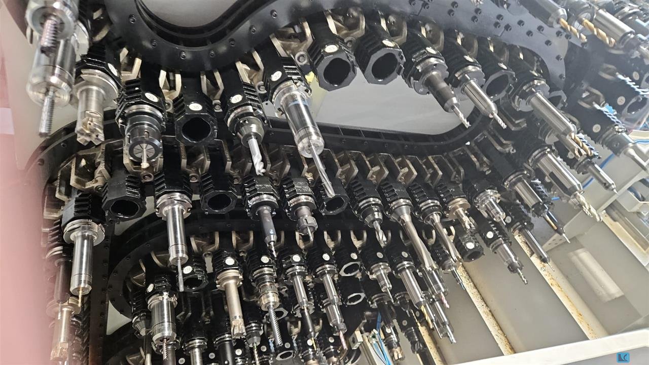 X1-/ X3-axis: 180mm, X2-axis: 180mm, Y1-/ Y3-axis: ±45mm, Z1-/ Z3-axis: 704mm, Z2-axis: 620mm, E2-axis: 720mm, rapid traverse X, Y, Z-axis: 30m/min, spindle 1: max. speed: 5000/min, spindle bore: 65mm, chuck diameter: 210mm, spindle 2: max. speed: 7000/min, spindle bore: 42mm, max. chuck diameter: 140mm, spindle nose diameter: 110mm, max. chuck jaw weight: 1.25kg, number of stations: 2x12, number of driven tool stations: 2x12, max. speed: 8000/min, power S3 25%: 4.3kW, torque S3 25%: 13.6Nm. Length: 2880mm, width: 2130mm, height: 1990mm, weight: 7.5t, operating hours: 16,597.7h. Including bar feeder Top Automazioni X-FILES S, year of manufacture 2020, 4x tool holders, straight, left-right square mount, external coolant, 4x machine interface: BT45A, 1x milling head 90°/BMT 45 Spinner, angled milling head/ BMT45/ ESX-25 right and left twin-spindle, Spinner flat coupling, ER25 max. speed: ...