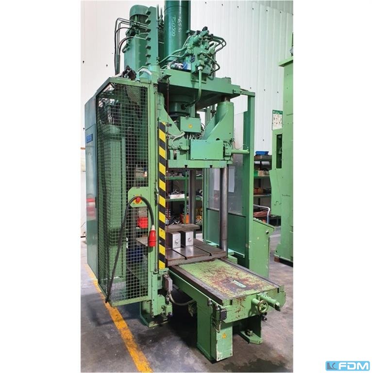pressure:70 t distance between columns:750 mm stroke:900 mm table surface area:700 x 1000 mm Distance table/ram, stroke up:900 mm table height over floor:680 mm ram surface:700 x 1000 mm side window:600 mm max. tool weight:5,0 t max. capacity of swivelling ram plate:2,0 t Speed down:0 - 50 mm/s Speed up:0 - 48 mm/s Working speed:0 - 8 mm/s oil volume:140 l power capacity:9,5 kW weight:8,0 t Dimensions (WxDxH):2,2 x 1,2 x 3,7 m