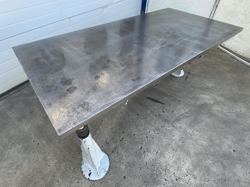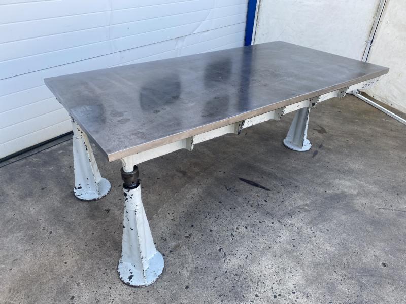 Straightening and welding plate, cast steel-grey cast iron, heavily ribbedheavyheavy, straightening plateLength: 1985 mmWidth: 1000 mmThickness with ribs: 220 mmWorking height: 860 mmPanel thickness: approx. 35 mm throughout- 4 pieces height-adjustable feetWeight 1050 kg; used