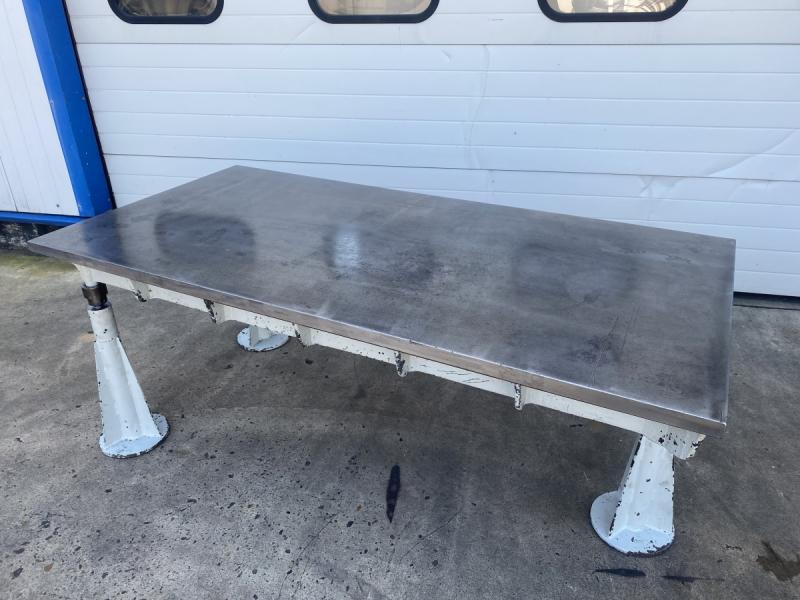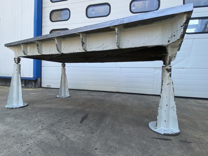 Straightening and welding plate made of steel, solid materialMachined steel plate from a tool rackLength 2980 mmWidth 1380 mmThickness 74 mm- Full steel plate- Surface milled- 4 pieces screwed trailer blocks- Plate provided with some symmetrical holesWeight approx. 2380 kg; used