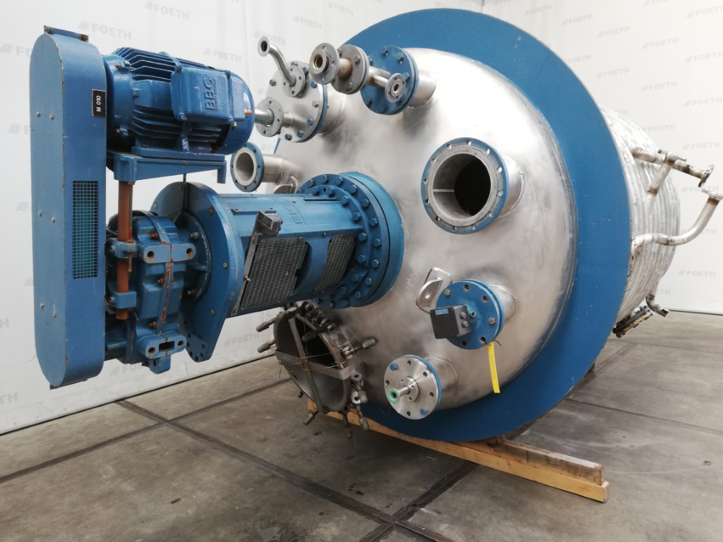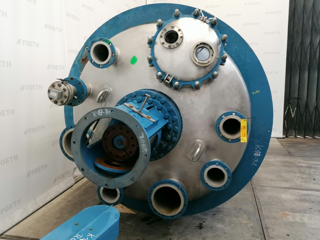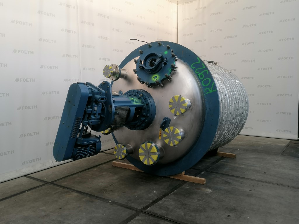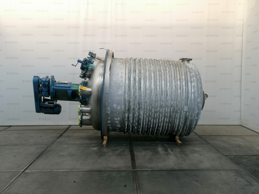 General SKUR0922 MakeW. Stoecklin AG (CH) Type6300 ltr. LocationBarneveld Pressure Working pressure3.2 Bar Vacuum possiblecheck Working pressure jacket16 Bar Main Features MaterialStainless steel Volume6300 Ltr. Motor13 KW Specified Features - Stainless Steel Reactor Reactorcheck Capacity8500 Ltr (nett. 6300 Ltr) Vessel sizesdia.2000mm x3050mm Dished bottomcheck Dished top sidecheck ManholeDN600 Top connections5x DN150, 2x DN250 Outletdia.125mm Half coil jacketed(280 Ltr) Max. temperature-30/200 degr.C. With paddle stirrerEkato EM100 Motor13,5 kW, 380 Volt (EX) Speed mixing shaft6,9-69 rpm Stainless Steel Reactors MaterialStainless steel 1.4435 (316L) Information No.1333 Year of construction1985 Floorspace2,5x2,5 M Total height3,9 M Weight5000 Kg ATEX compatiblecheckStainless Steel ReactorsCatalysts & fillersSolventsDetergent & surf.Other pharmaceutics ...
