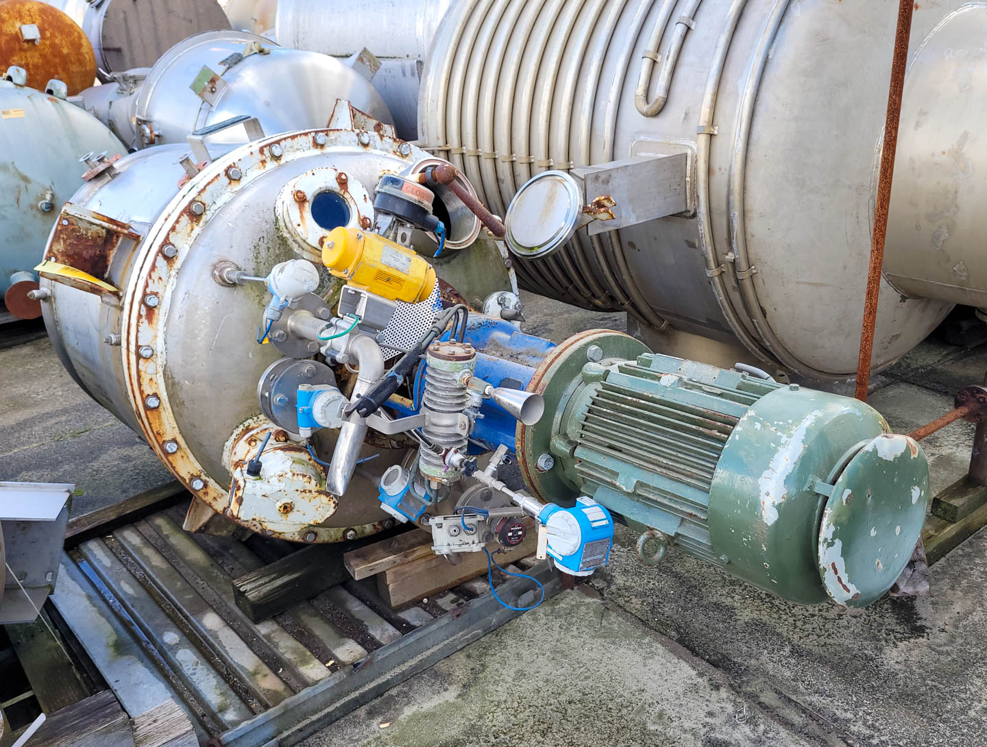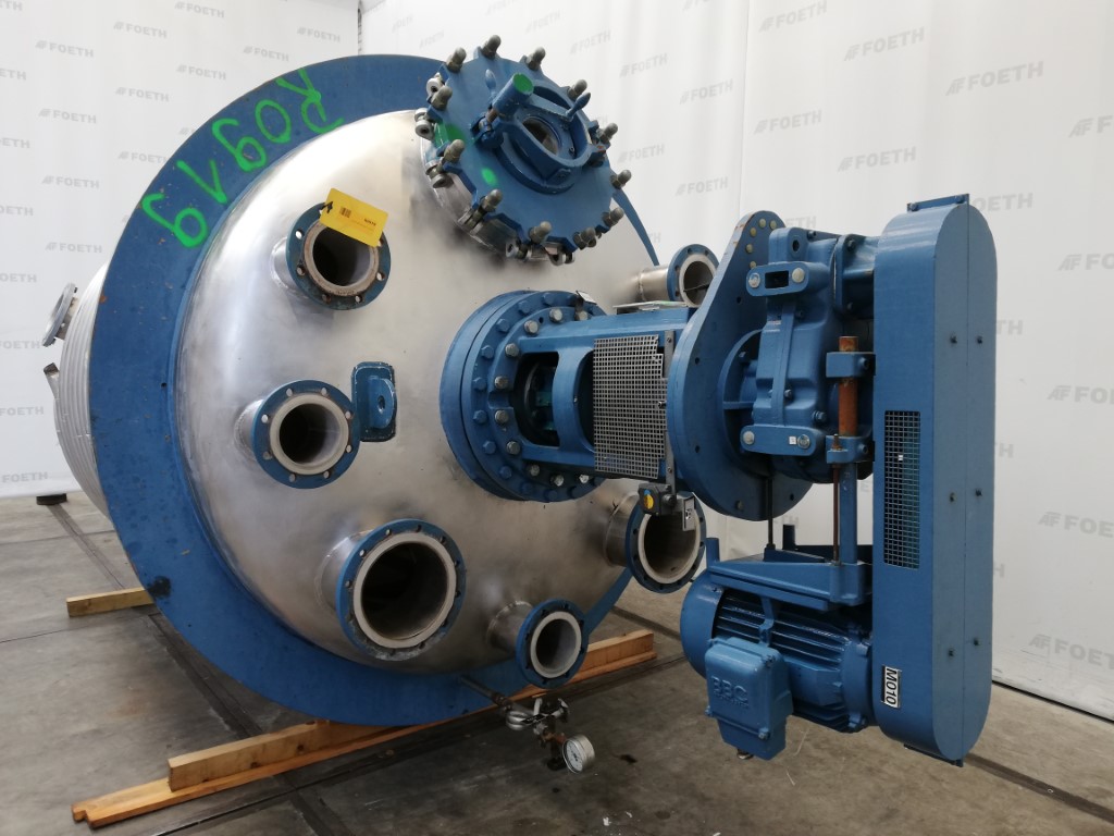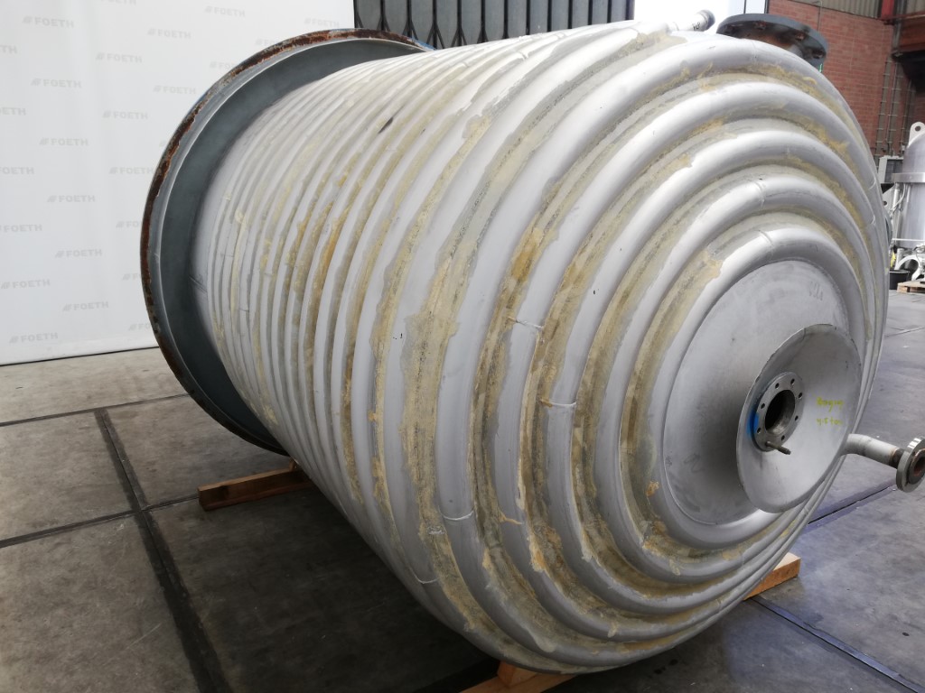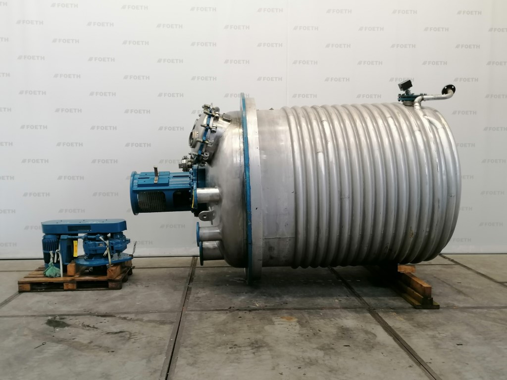 General SKUR0922 MakeW. Stoecklin AG (CH) Type6300 ltr. LocationBarneveld Pressure Working pressure3.2 Bar Vacuum possiblecheck Working pressure jacket16 Bar Main Features MaterialStainless steel Volume6300 Ltr. Motor13 KW Specified Features - Stainless Steel Reactor Reactorcheck Capacity8500 Ltr (nett. 6300 Ltr) Vessel sizesdia.2000mm x3050mm Dished bottomcheck Dished top sidecheck ManholeDN600 Top connections5x DN150, 2x DN250 Outletdia.125mm Half coil jacketed(280 Ltr) Max. temperature-30/200 degr.C. With paddle stirrerEkato EM100 Motor13,5 kW, 380 Volt (EX) Speed mixing shaft6,9-69 rpm Stainless Steel Reactors MaterialStainless steel 1.4435 (316L) Information No.1333 Year of construction1985 Floorspace2,5x2,5 M Total height3,9 M Weight5000 Kg ATEX compatiblecheckStainless Steel ReactorsCatalysts & fillersSolventsDetergent & surf.Other pharmaceutics ...