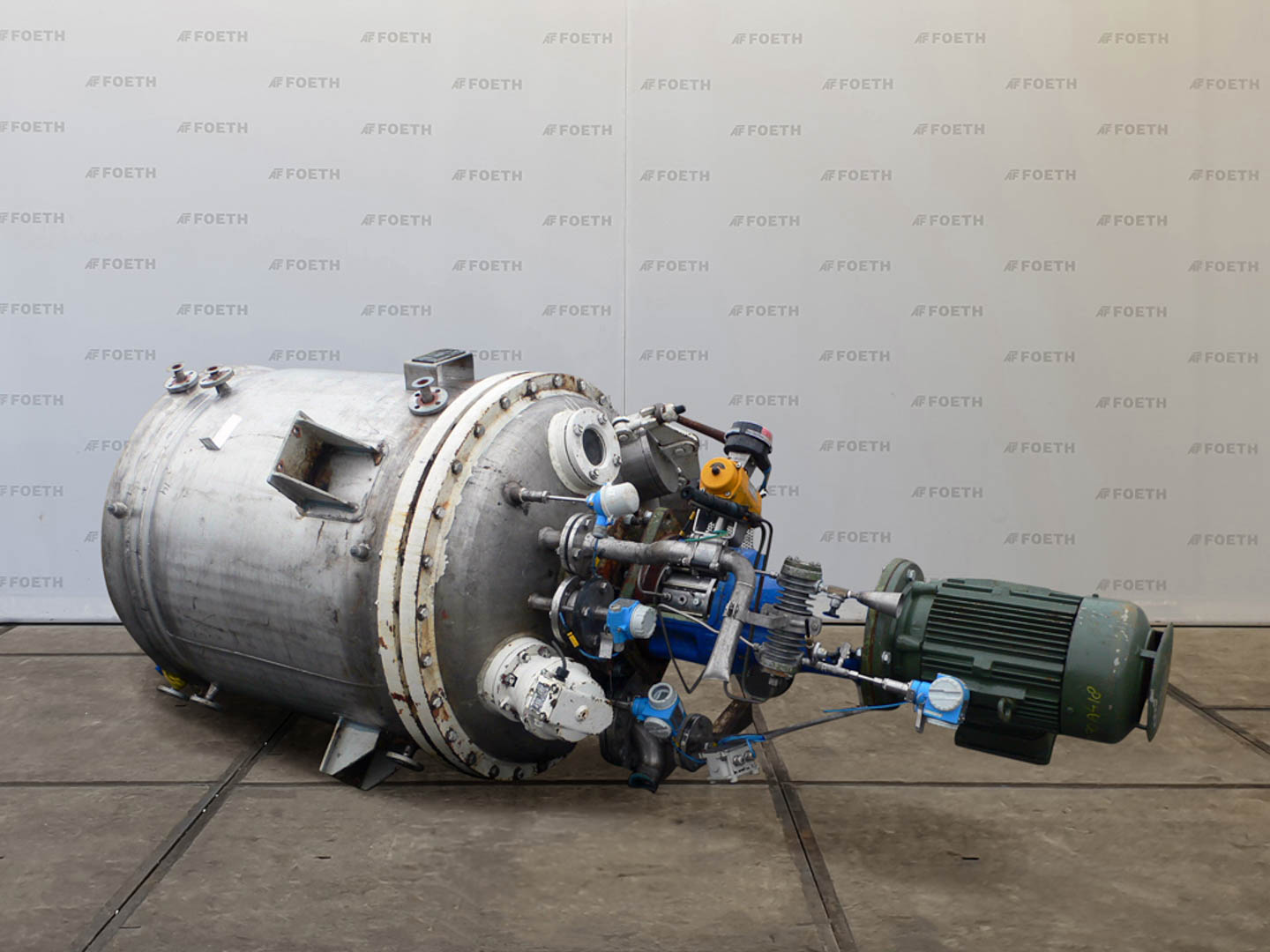 General SKUR0919 MakeWalter Stoecklin AG (CH) Type6300 LocationBarneveld Pressure Working pressure3.2 Bar Vacuum possiblecheck Working pressure jacket16 Bar Main Features MaterialStainless steel Volume6300 Ltr. Motor13 KW Specified Features - Stainless Steel Reactor Reactorcheck Capacity8500 ltr (nett 6300 ltr) Vessel sizesdia. 2000x3050mm Dished bottomcheck Dished top sidecheck ManholeDN600 Top connections2x DN250, 5x DN150 Outletdia. 125mm Half coil jacketed(280Ltr) Max. temperature-30/200 degr.C. With paddle stirrerEkato EM 100-D Motor13 kW, 380 Volt, (EX) Speed mixing shaft6.9/69 rpm Stainless Steel Reactors MaterialStainless steel 1.4435 (316L) Information No.1331 Year of construction1983 Floorspace2,4x2,4 M Total height4,9 M Weight4500 Kg ATEX compatiblecheckStainless Steel ReactorsCatalysts & fillersSolventsDetergent & surf.Other pharmaceuticsCo ...