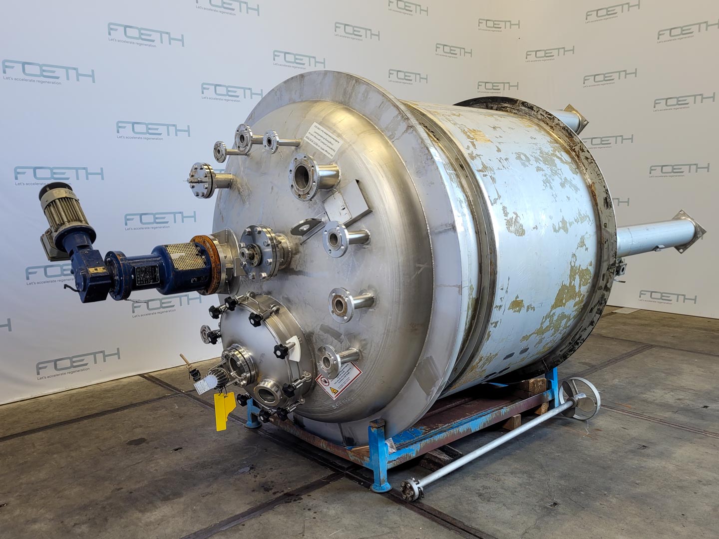 General SKUR0811 MakeCMR Brevetti Ravinet (Ita) LocationBarneveld Type2500 ltr Pressure Working pressure3.2 Bar Vacuum possiblecheck Working pressure jacket16 Bar Main Features MaterialStainless steel Volume2500 Ltr. Motor3.6 KW Specified Features - Stainless Steel Reactor Reactorcheck Capacity3610 ltr (nett. 2500 ltr) Vessel sizesdia.1600mm x 2170mm Dished bottomcheck Dished top sidecheck ManholeDN500 Top connections3x DN200, 4x DN100, OutletDN100 Half coil jacketed(140 ltr( Max. temperature-30/200 degr.C With propellor stirrercheck Motor3.6 kW, 380 Volt(EX) Speed mixing shaft235 rpm Stainless Steel Reactors MaterialStainless steel 1.4571 (316Ti) Information No.2010 Year of construction1989 Floorspace2,2x2,2 M Total height3,4 M Weight1700 Kg ATEX compatiblecheckStainless Steel ReactorsCatalysts & fillersSolventsDetergent & surf.Other pharmaceuticsCosm ...