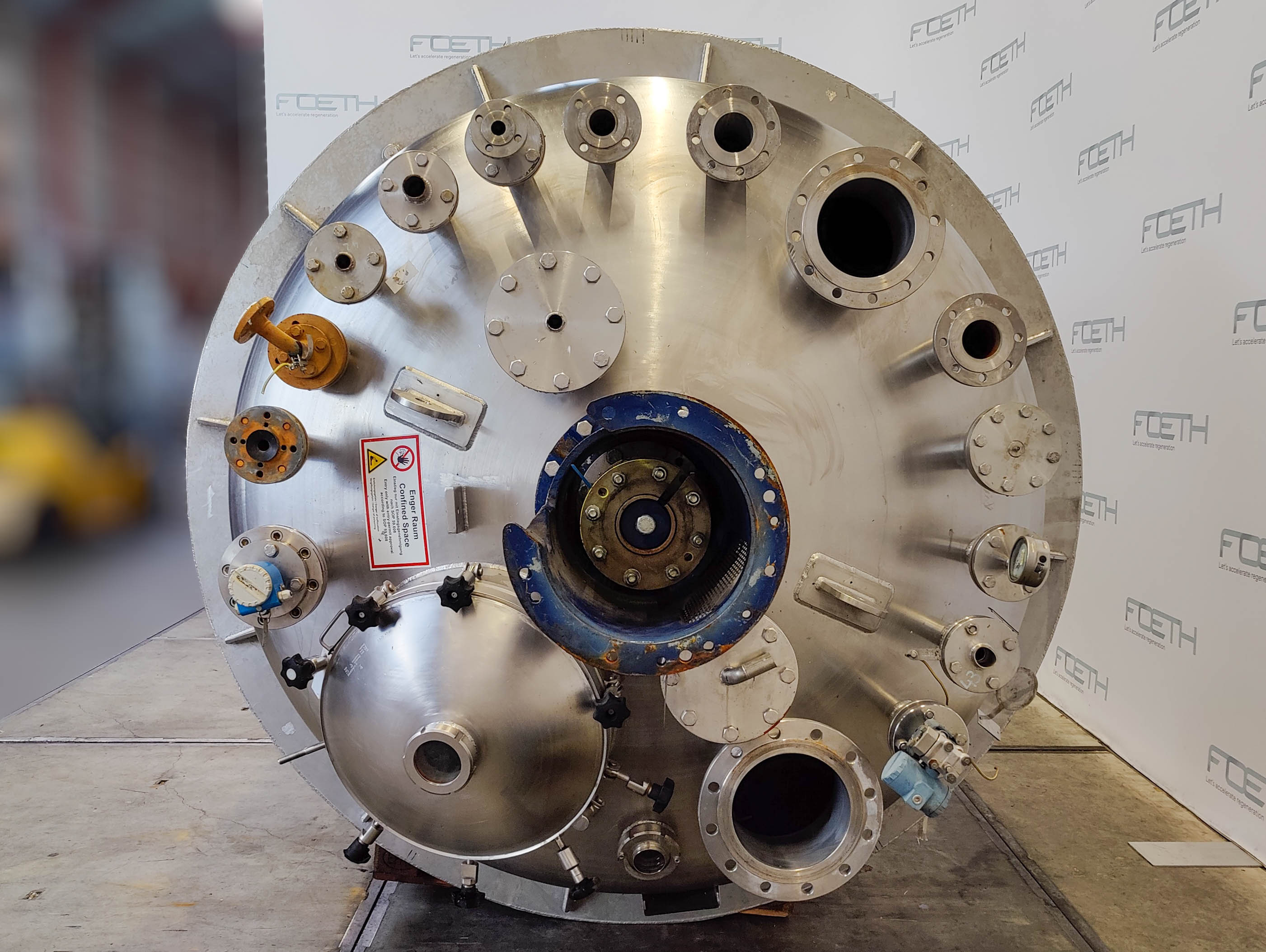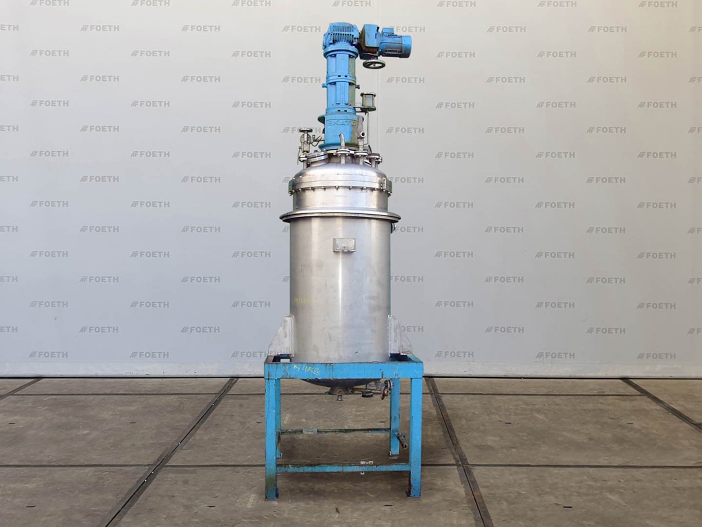 General SKUR0919 MakeWalter Stoecklin AG (CH) Type6300 LocationBarneveld Pressure Working pressure3.2 Bar Vacuum possiblecheck Working pressure jacket16 Bar Main Features MaterialStainless steel Volume6300 Ltr. Motor13 KW Specified Features - Stainless Steel Reactor Reactorcheck Capacity8500 ltr (nett 6300 ltr) Vessel sizesdia. 2000x3050mm Dished bottomcheck Dished top sidecheck ManholeDN600 Top connections2x DN250, 5x DN150 Outletdia. 125mm Half coil jacketed(280Ltr) Max. temperature-30/200 degr.C. With paddle stirrerEkato EM 100-D Motor13 kW, 380 Volt, (EX) Speed mixing shaft6.9/69 rpm Stainless Steel Reactors MaterialStainless steel 1.4435 (316L) Information No.1331 Year of construction1983 Floorspace2,4x2,4 M Total height4,9 M Weight4500 Kg ATEX compatiblecheckStainless Steel ReactorsCatalysts & fillersSolventsDetergent & surf.Other pharmaceuticsCo ...
