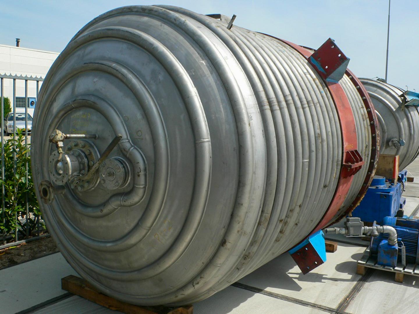 General SKU016G073 MakeJackson Apparatenbouw N.V. Mouscron No.91-082 Year of construction1991 LocationBarneveld Pressure Working pressure0.5 Bar Working pressure jacket6 Bar Main Features MaterialStainless steel Volume21450 Ltr. Motor7.5 KW Specified Features - Stainless Steel Reactor Reactor(1x) Capacity21.450 Ltr (useful capacity 18.000 Ltr) Vessel sizesdia. 2800x2685mm Dished bottomcheck Dished top sidecheck Manholedia. 500mm Top connections3x dia. 80mm + 2x dia. 100mm Outletdia. 125mm Half coil jacketedcheck Max. temperature200/350 Degr. C. (vessel/half coil) With paddle stirrermake Fluid, type FKL-80 Motor7,5 KW, 380/660 Volt (Ex) Speed mixing shaft± 44 Rpm Stainless Steel Reactors MaterialStainless steel 1.4301 (304) Information Floorspace3,3x3,3 M Total height6,5 MStainless Steel ReactorsCatalysts & fillersSolventsDiscountDetergent & surf.Other pha ...