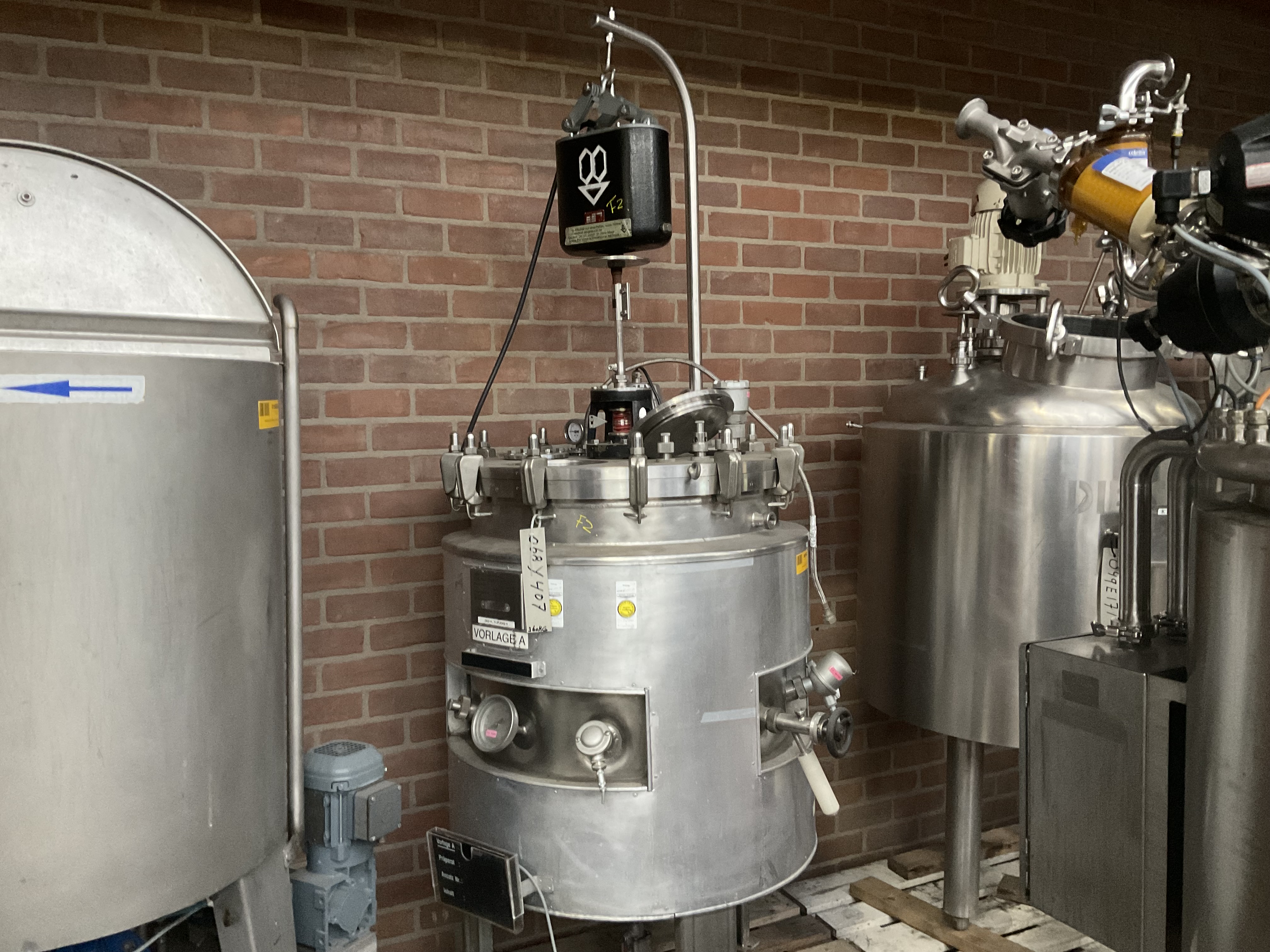 General SKU028B135 MakeHanag Oberwil No.11940/4 Year of construction1993 Mounted on legscheck Specified Features - Stainless Steel Reactor Material finishPolished inside Pressure Working pressure3.2 Bar Vacuum possiblecheck Working pressure jacket6 Bar Vacuum possible jacketcheck Main Features MaterialStainless steel Volume1600 Ltr. Motor2.5 KW Stainless Steel Reactors Reactor(1x) Capacity1600 Ltr Vessel sizesdia. 1200 x 1296mm, Insulated vessel Dished bottomcheck Dished top sidecheck Manhole/hand hole dia. 200mm Top connections2x dia. 40mm + dia. 50mm Outletdia. 40mm With jacketcheck Max. temperature-10/+160 Degr. C. With paddle stirrercheck Motor2,5 kW (400 V, 1450 rpm) Speed mixing shaftvariable (± 19-150 Rpm) MaterialStainless steel 1.4435 (316L) Information LocationBarneveld With switchgearcheck Floorspace1,9 x 1,4 m Total height3,8 m Weight180 ...