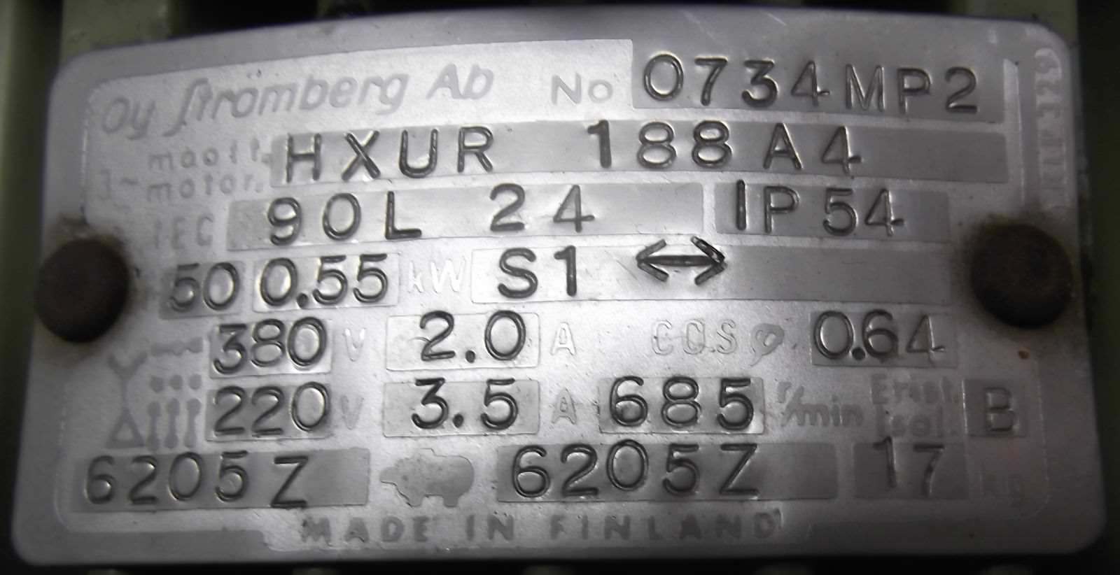 Electric motor, three-phase motor -Power: 0.55 kW -Speed: 685 rpm -Shaft: Ø 24 mm -Construction: B3 -Protection class: IP 54 -Dimensions: 320/175/H220 mm -Weight: 17 kg