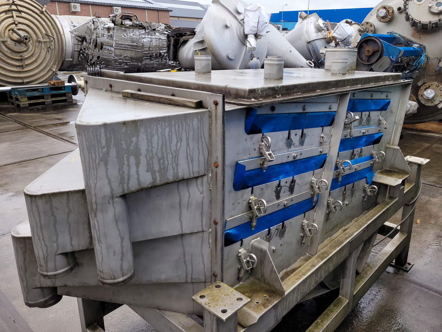 General SKU034C093 LocationBarneveld MakeSuperior B.V. Beusichem TypeZM-1500/750/4 No.5483 Main Features MaterialStainless steel Surface1.1 m2 Size length1500 mm Sizes width750 mm Specified Features - Vibro sieve Vibro sievecheck Sieve surface1,1 m² Number of sieve decks:3 Sieve sizes1500 x 750mm With covercheck InletDia: 200mm OutletDia: 100 mm (4x) Drive excentercheck Motor2x 1,3 kW, 220/380 Volt MaterialStainless steel 1.4301 (304) Information Year of construction1986 Mounted on stainl. st. framecheck Floor space2,4 x 1,2 m Total height1,7 m Weight650 kg Extra Specificationssieve decks are not included Feed additivesPaper & otherOther pharmaceuticsOrganicsE-waste & metalSugarVibro sievesAnimal feedOther feedSolid pharmaceuticsPlastic & rubberMinerals & inorganicPlastic & polymersRubberOther chemicalStarchGeneric medicinesPowdered foodsConsumer wasteSuperi ...
