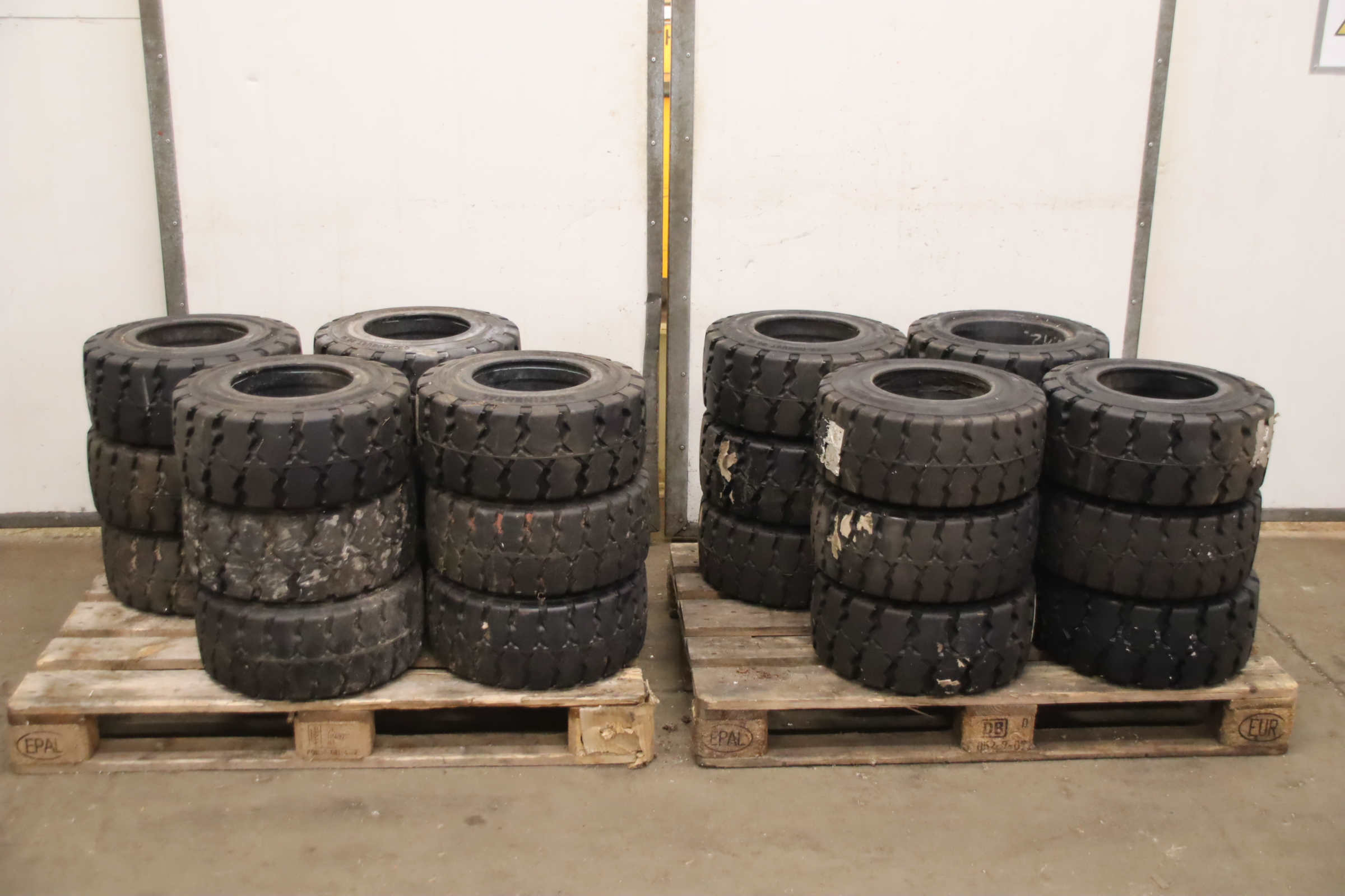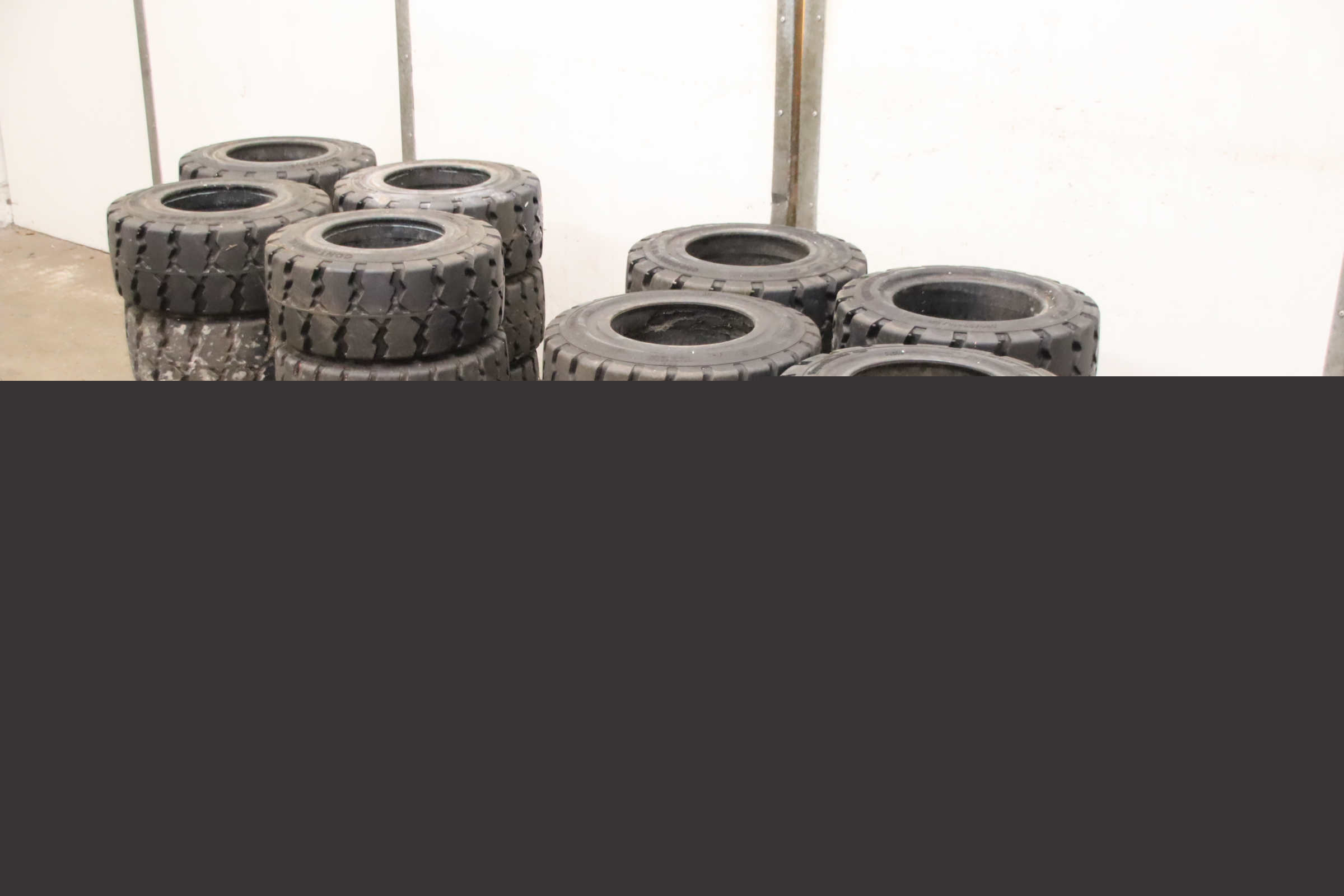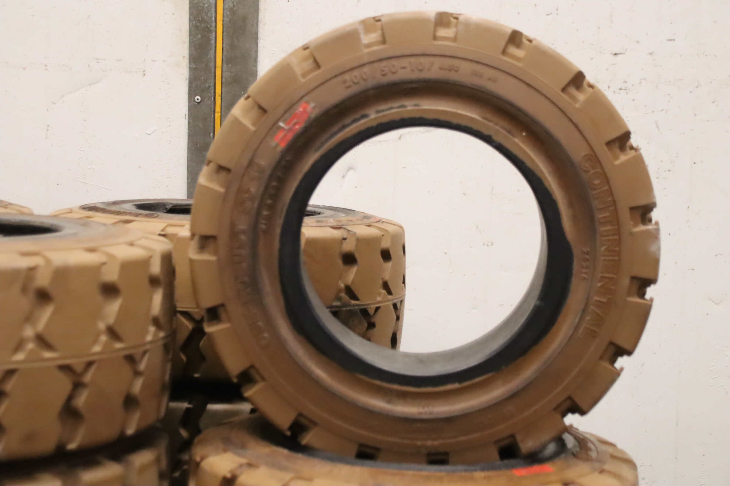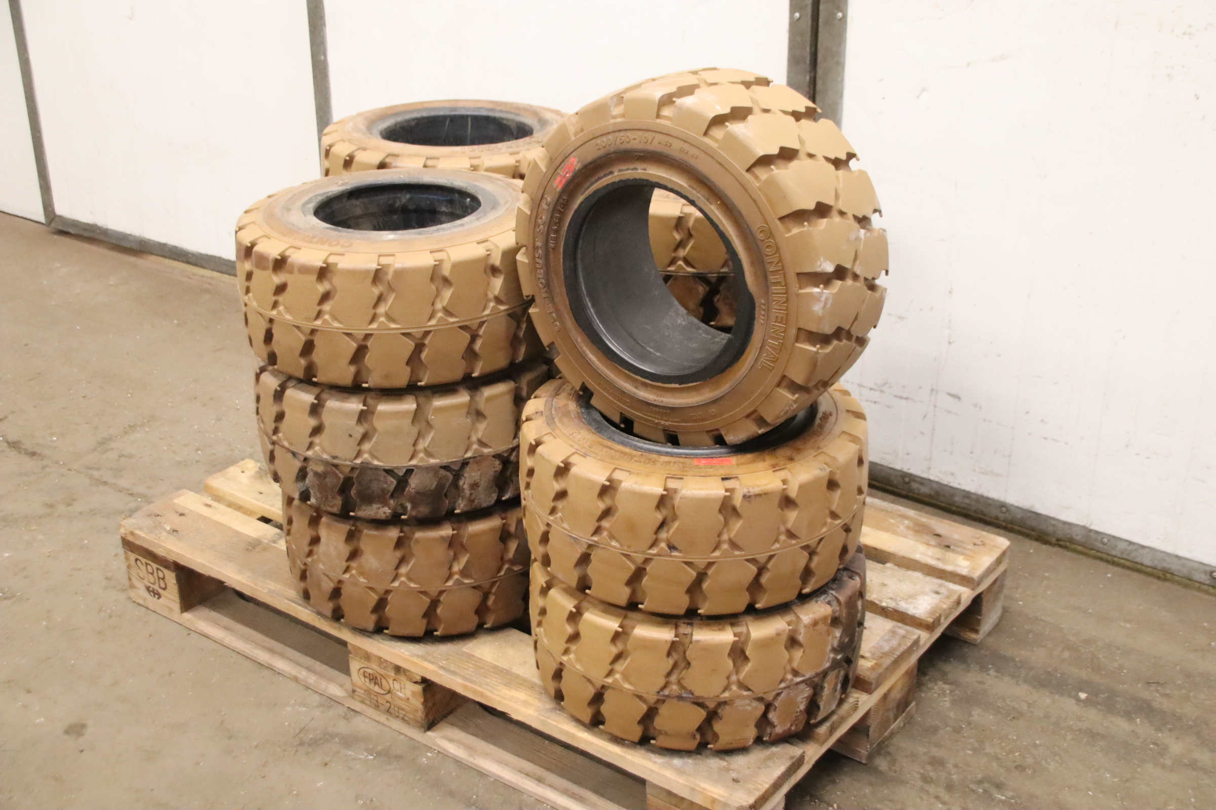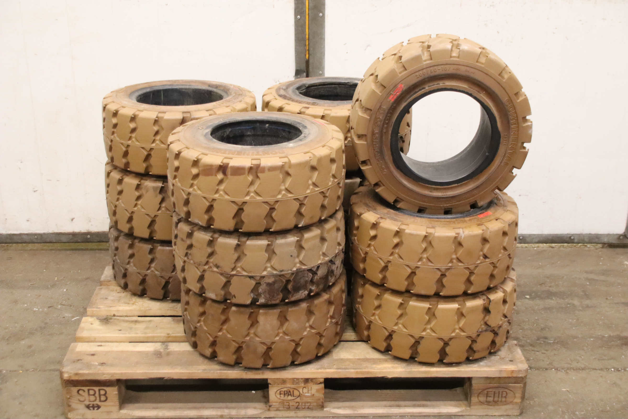 Tires, solid rubber tires, forklift tires -Manufacturer: Continental, solid rubber tire CSE-Robust Super Elastic SC 15 -Tire size: 200/50-10/ 6.50 SC 15 RIM 6.50 F-10 -Quantity: 24 pieces available -Dimensions: Ø 450 x 200 mm -Weight: 23 kg/pc.