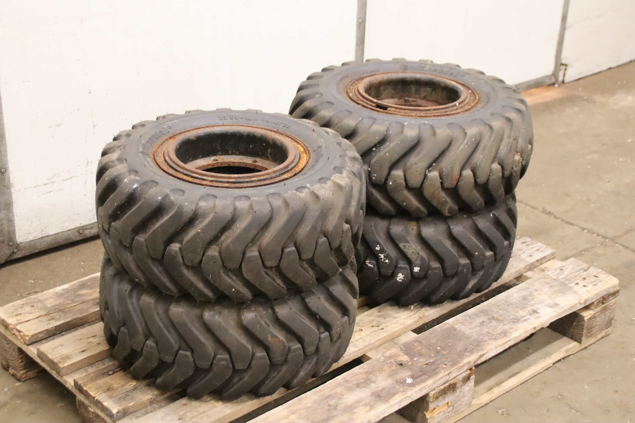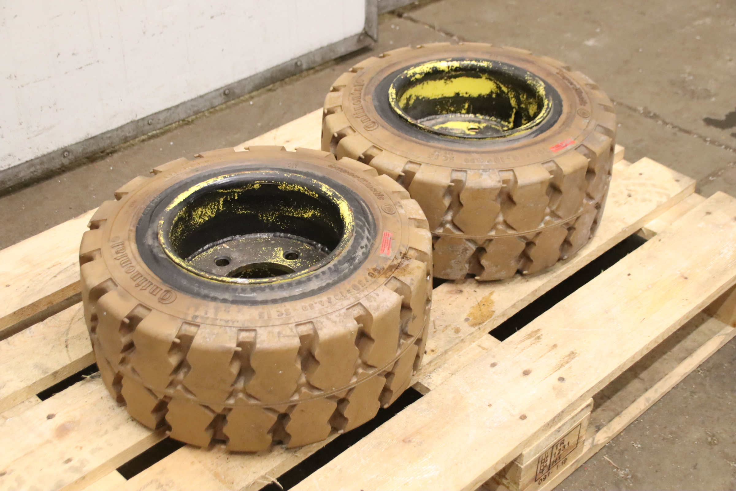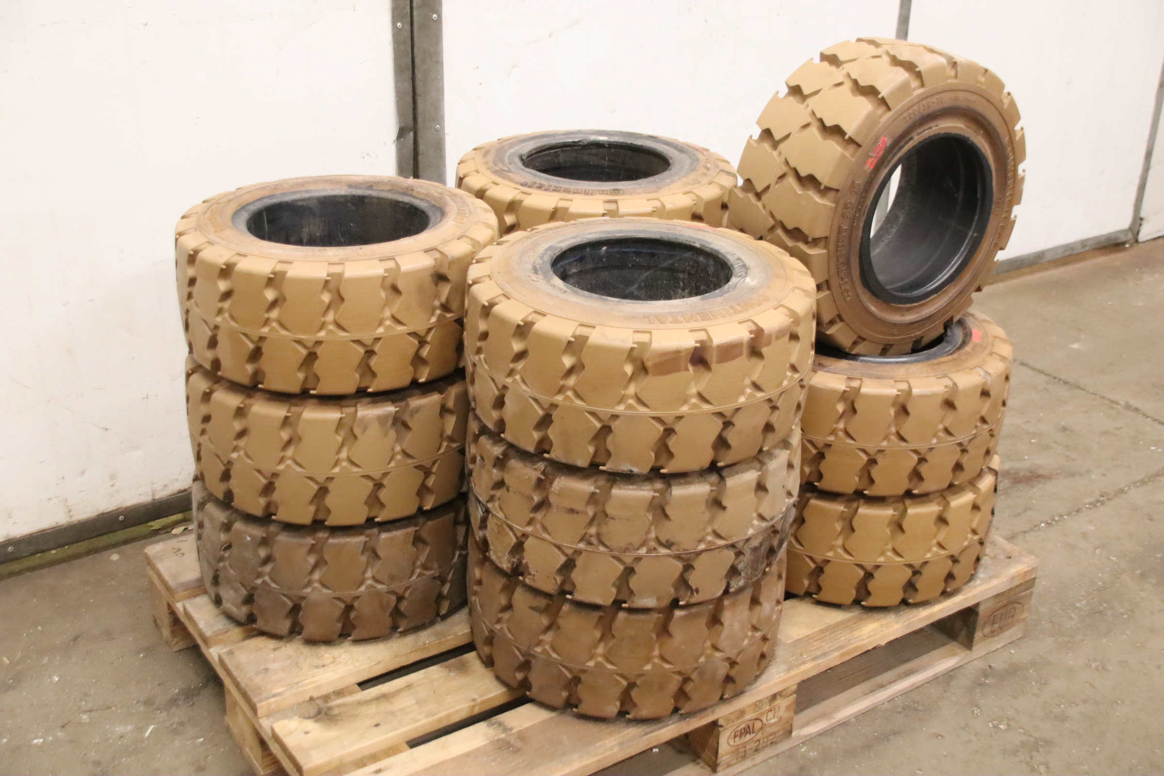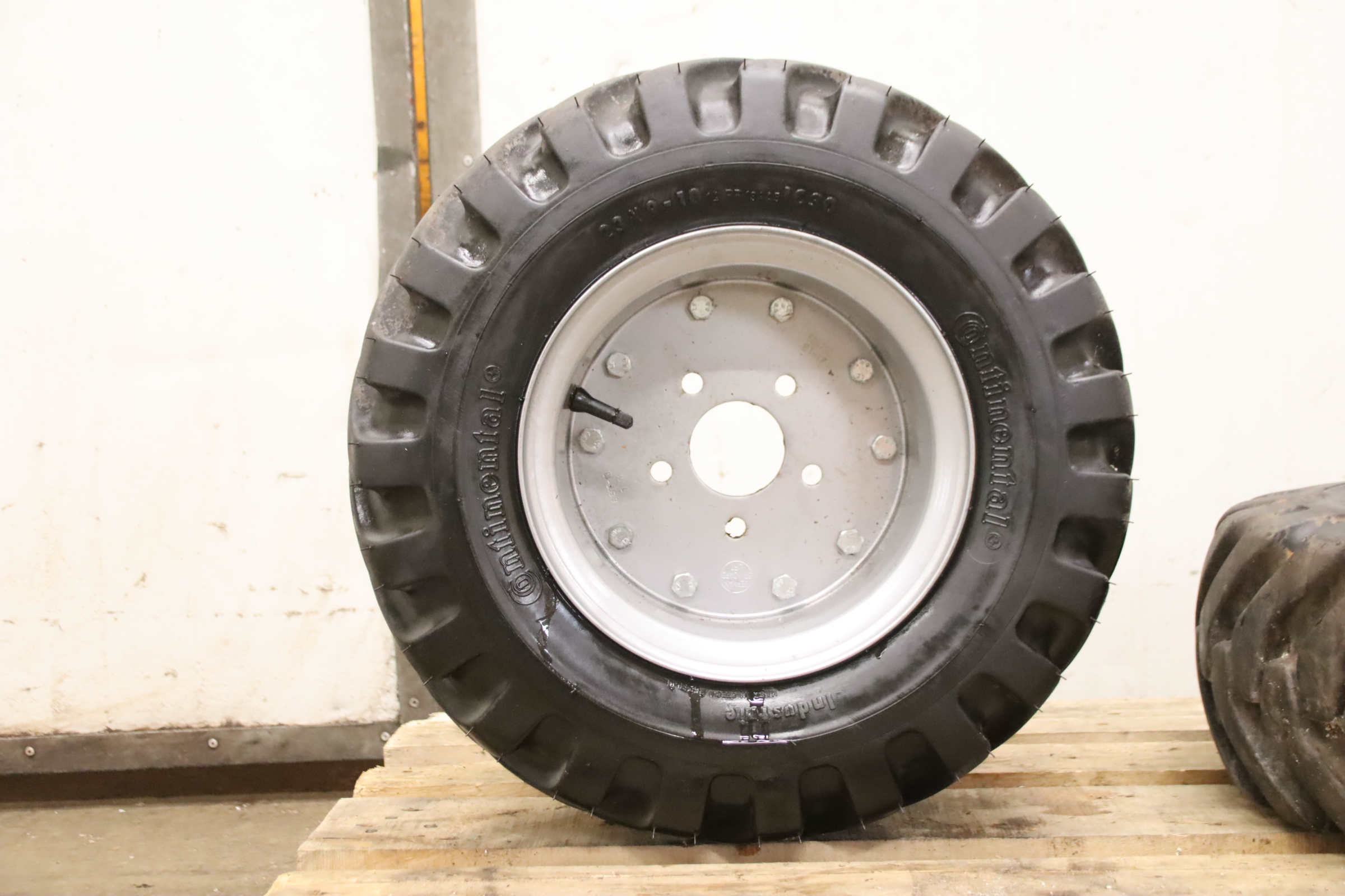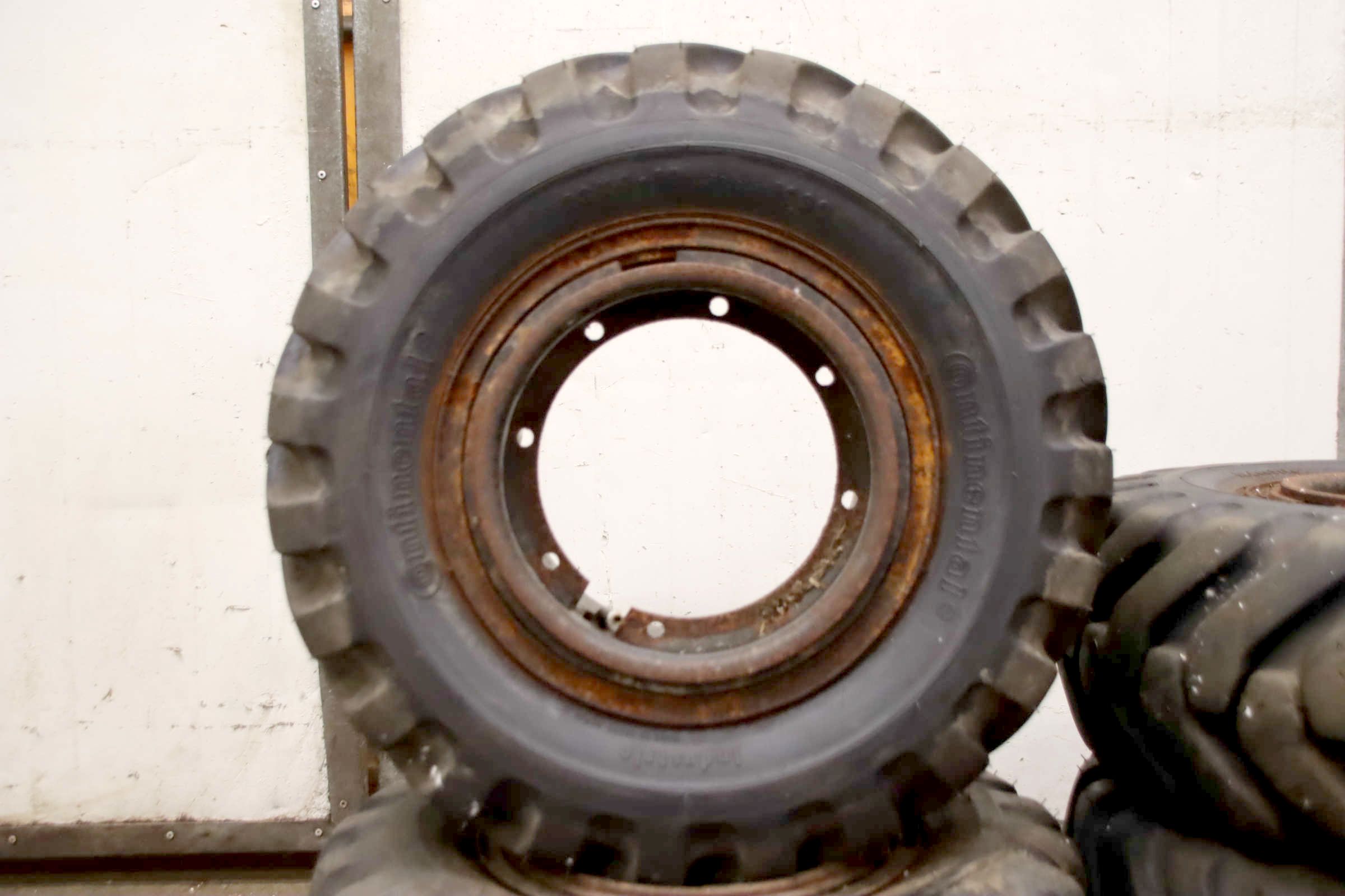 Tires, solid rubber tires, forklift tires -Manufacturer: Continental, Tires with rim, 4 pieces -Tire size: 23x9-10 PR 134A5 IC30 -Bolt circle: Ø 210 x 11 mm -Hub bore: Ø 190 mm -Delivery/Price: complete -Dimensions: Ø 530 x 220 mm -Weight: 46 kg/unit