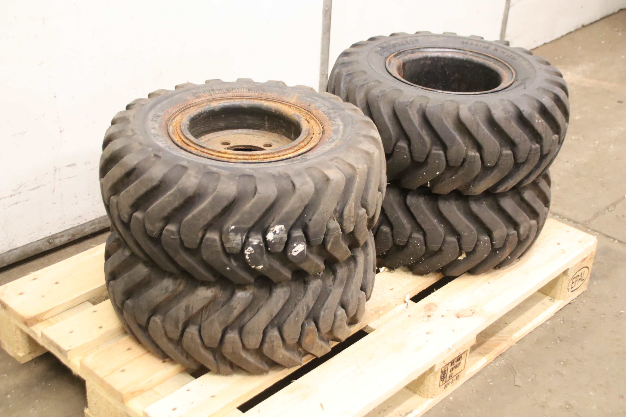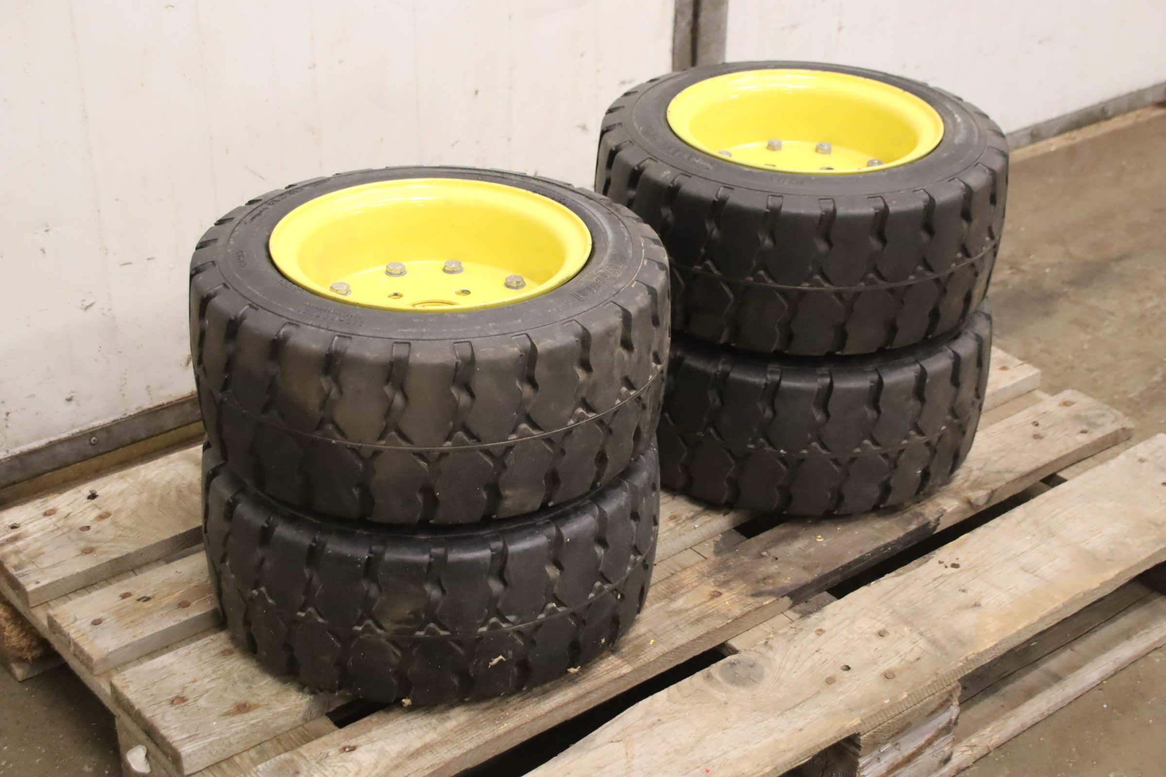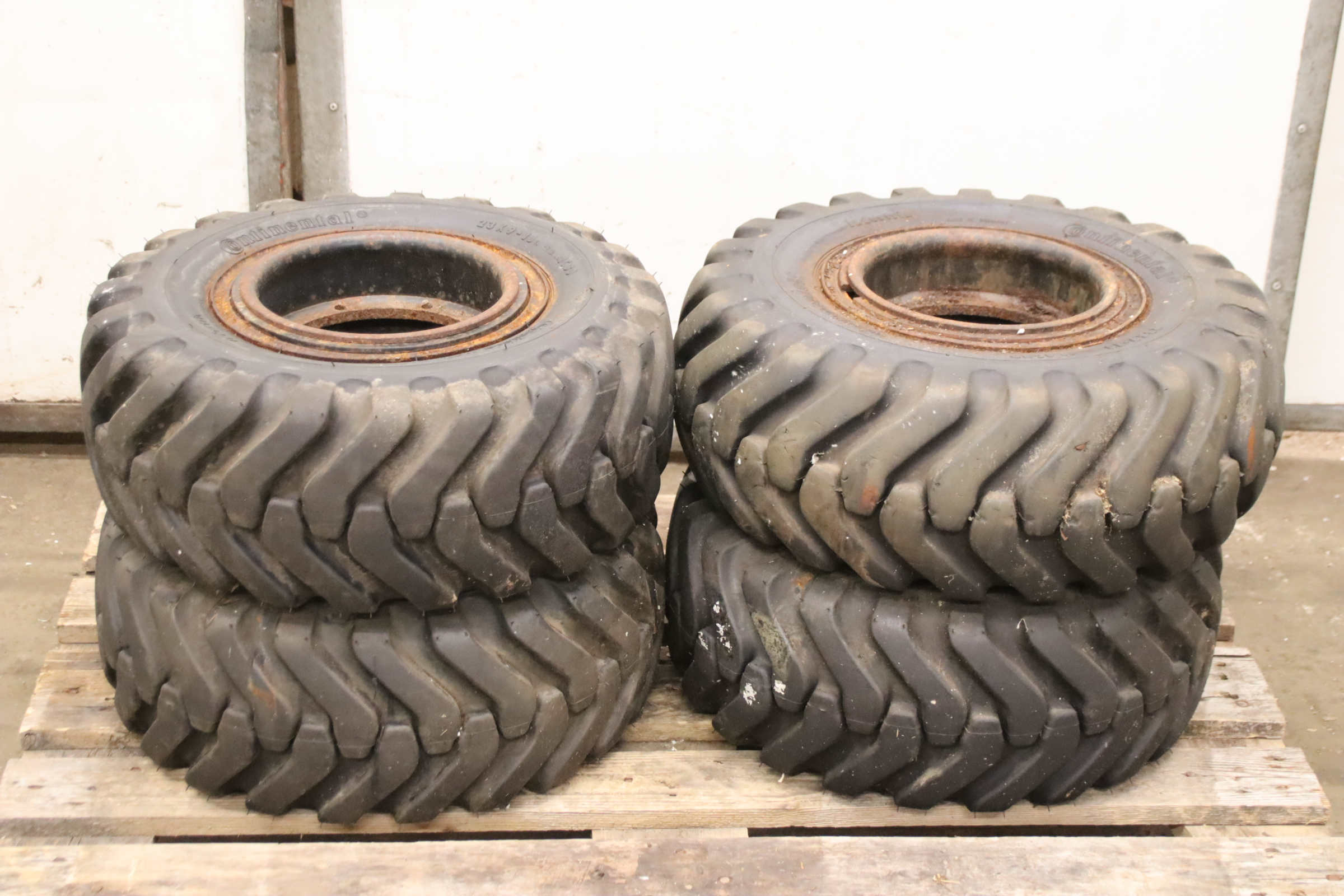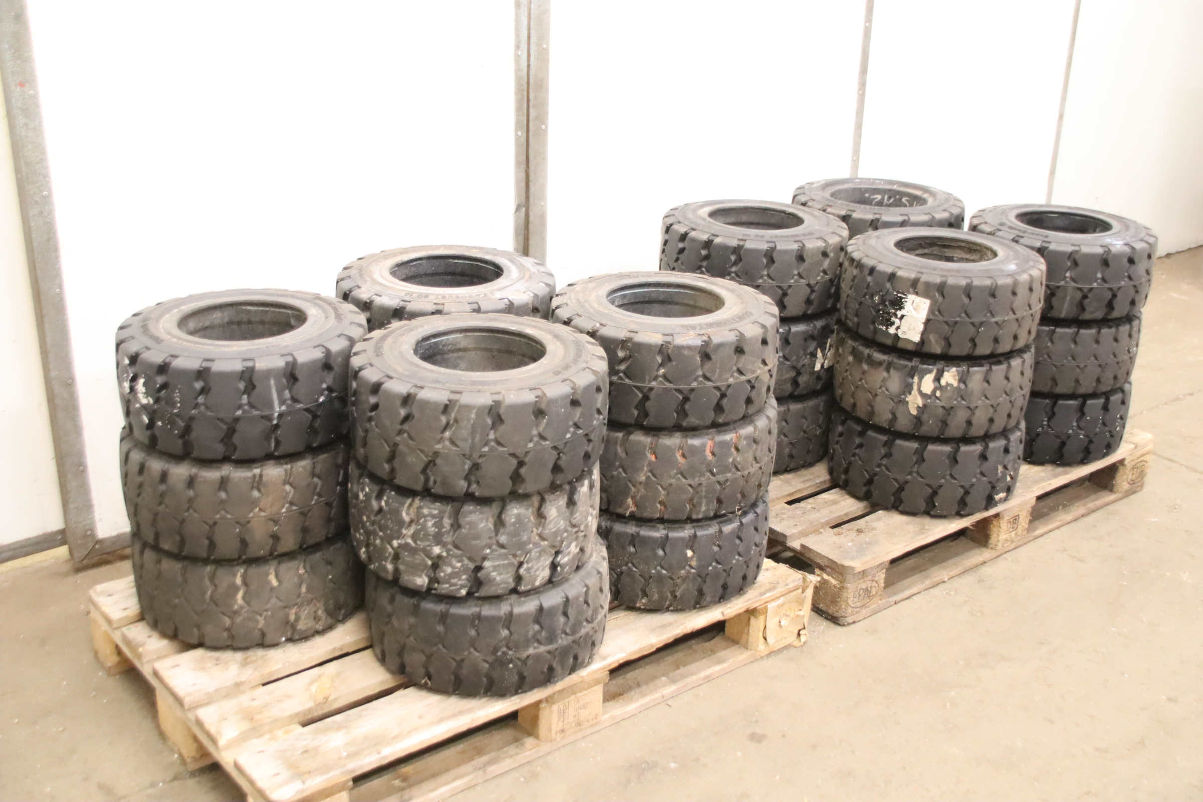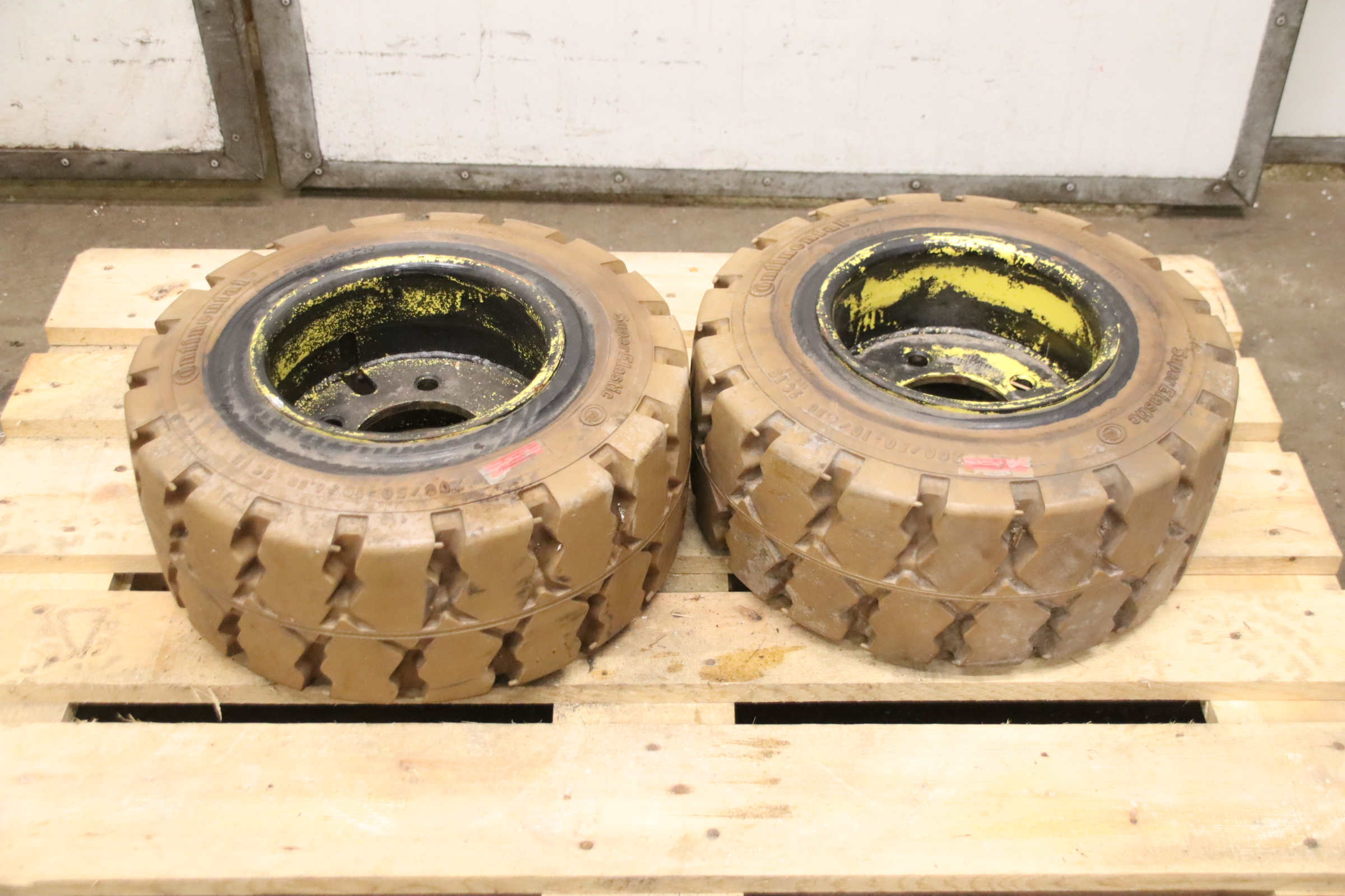 Tires, solid rubber tires, forklift tires -Manufacturer: Continental, Tires with rim, 4 pieces -Tire size: 23x9-10 PR 134A5 IC30 -Bolt circle: Ø 210 x 11 mm -Hub bore: Ø 190 mm -Delivery/Price: complete -Dimensions: Ø 530 x 220 mm -Weight: 46 kg/unit