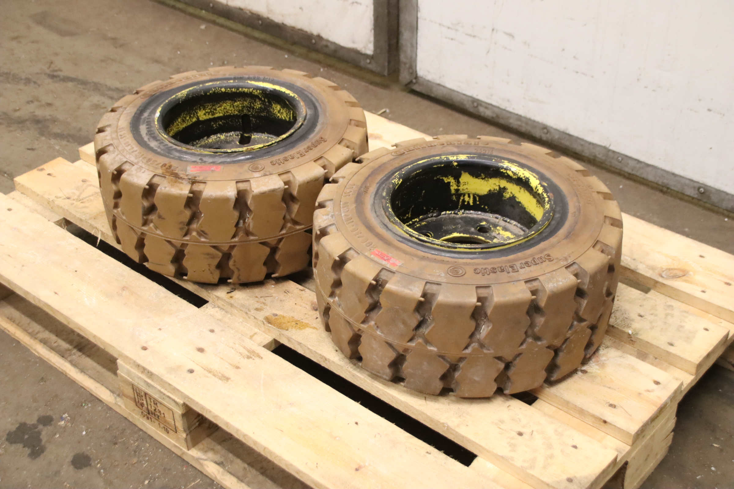 Tires, solid rubber tires, forklift tires -Manufacturer: Continental, tire CSE-Robust SC 15 with rim from GSL aerial work platform -Tire size: 23x9-10 PR 134A5 IC30 -Rim: 6.50F-10 604700 ET-17 -Bolt circle: Ø 115 x 15 mm -Hub bore: Ø 65 mm -Delivery/Price: complete -Dimensions: Ø 560 x 215 mm -Weight: 43 kg/pc.