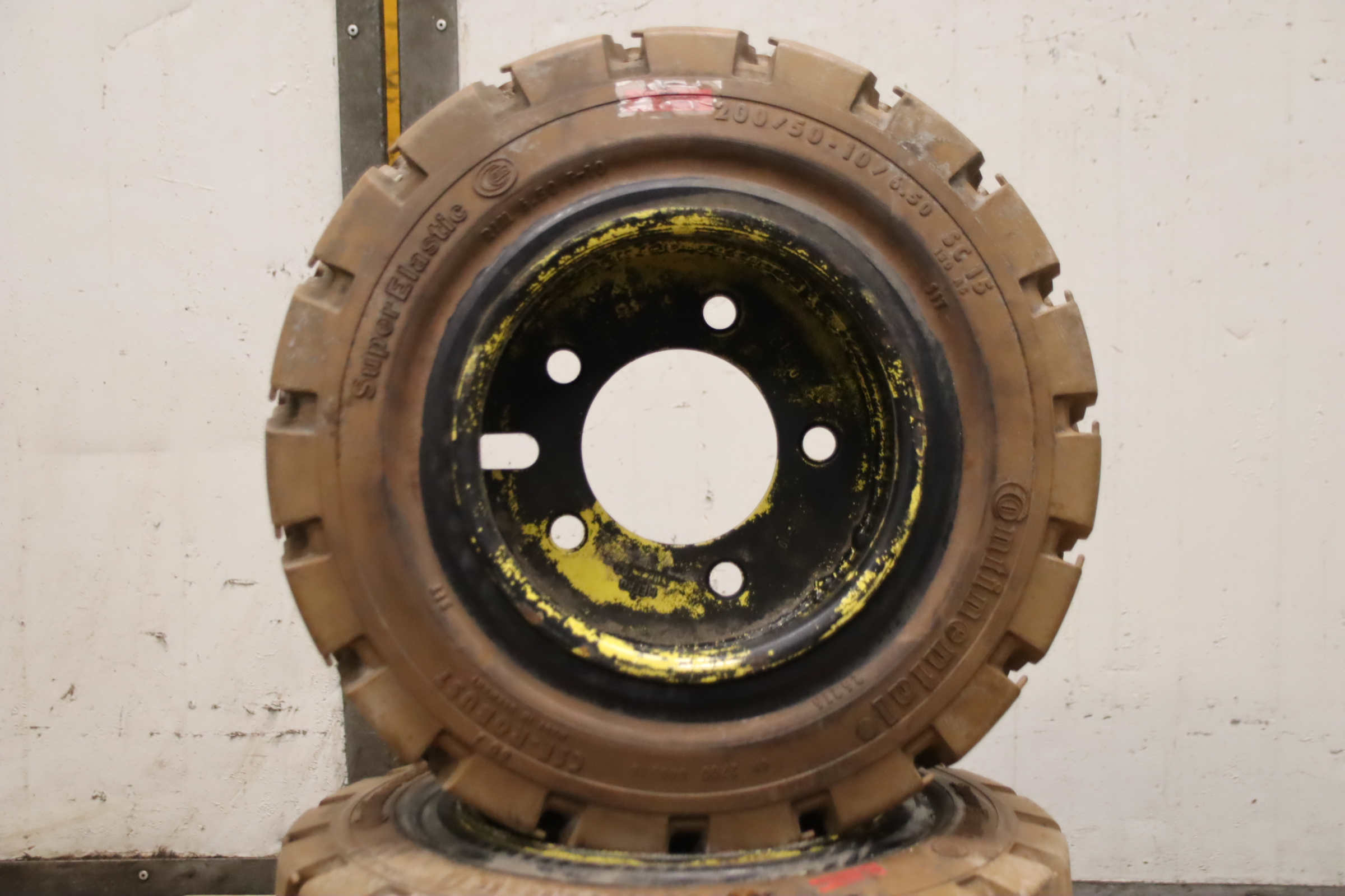 Tires, solid rubber tires, forklift tires -Manufacturer: Continental, solid rubber tire CSE-Robust Super Elastic SC 15 abrasion-resistant -Tire size: 200/50-10/ 6.50 SC 15 RIM 6.50 F-10 -Bolt circle: Ø 145 x 18 mm -Hub bore: Ø 110 mm -Submission/Price: complete -Dimensions: Ø 460 x 200 mm -Weight: 35 kg/pc.