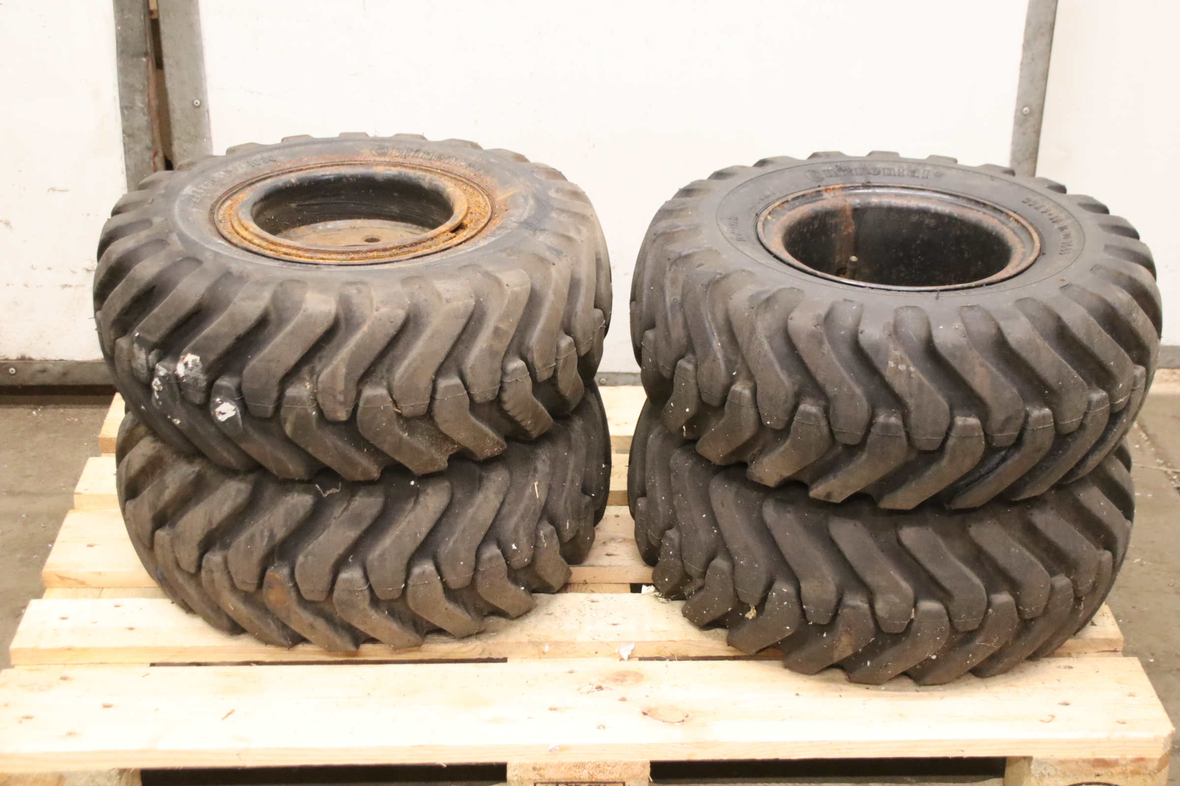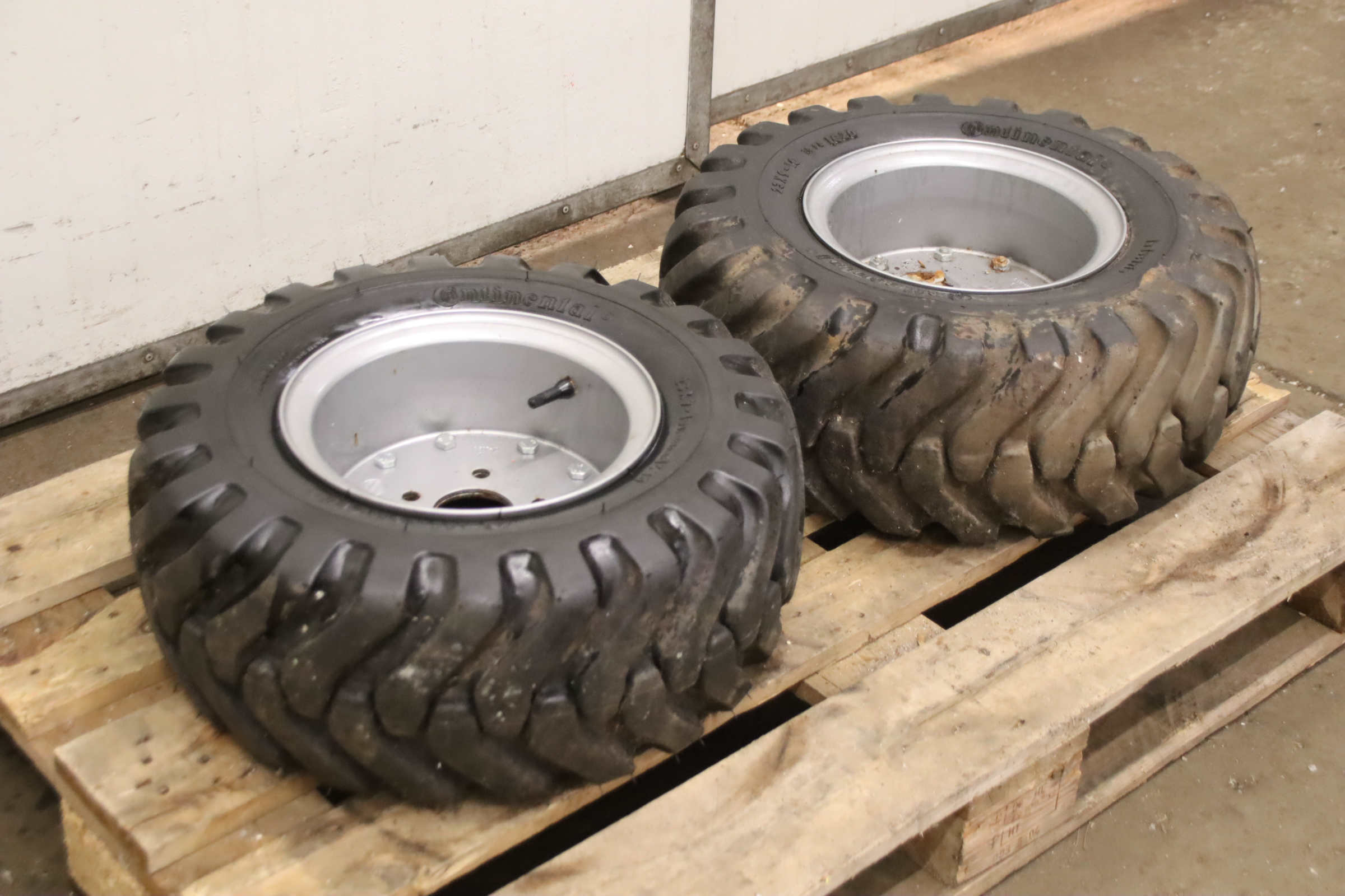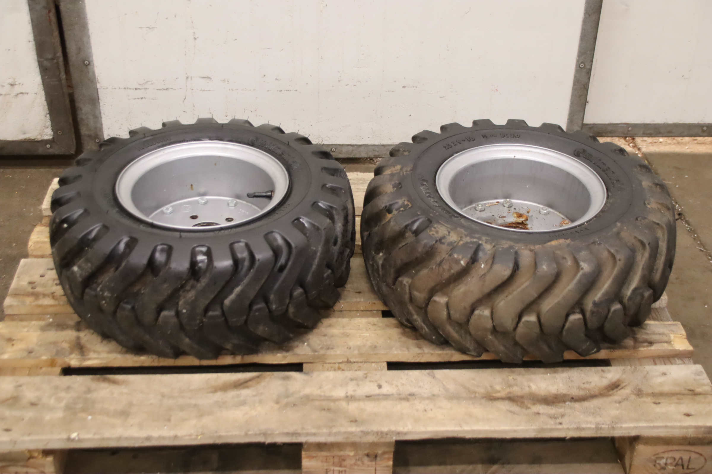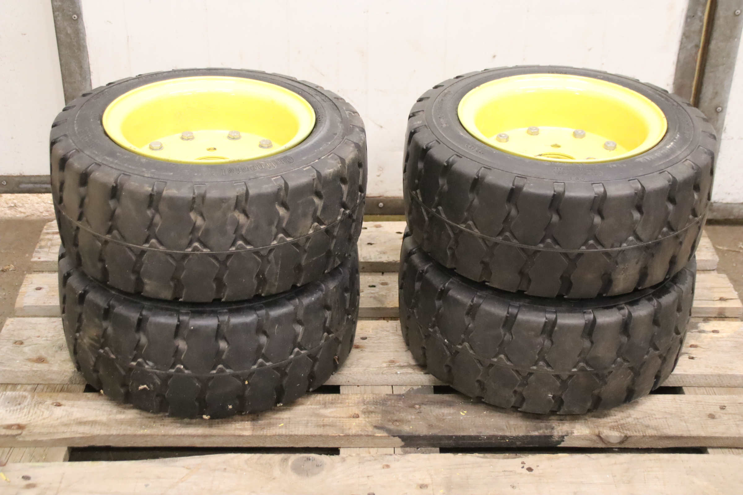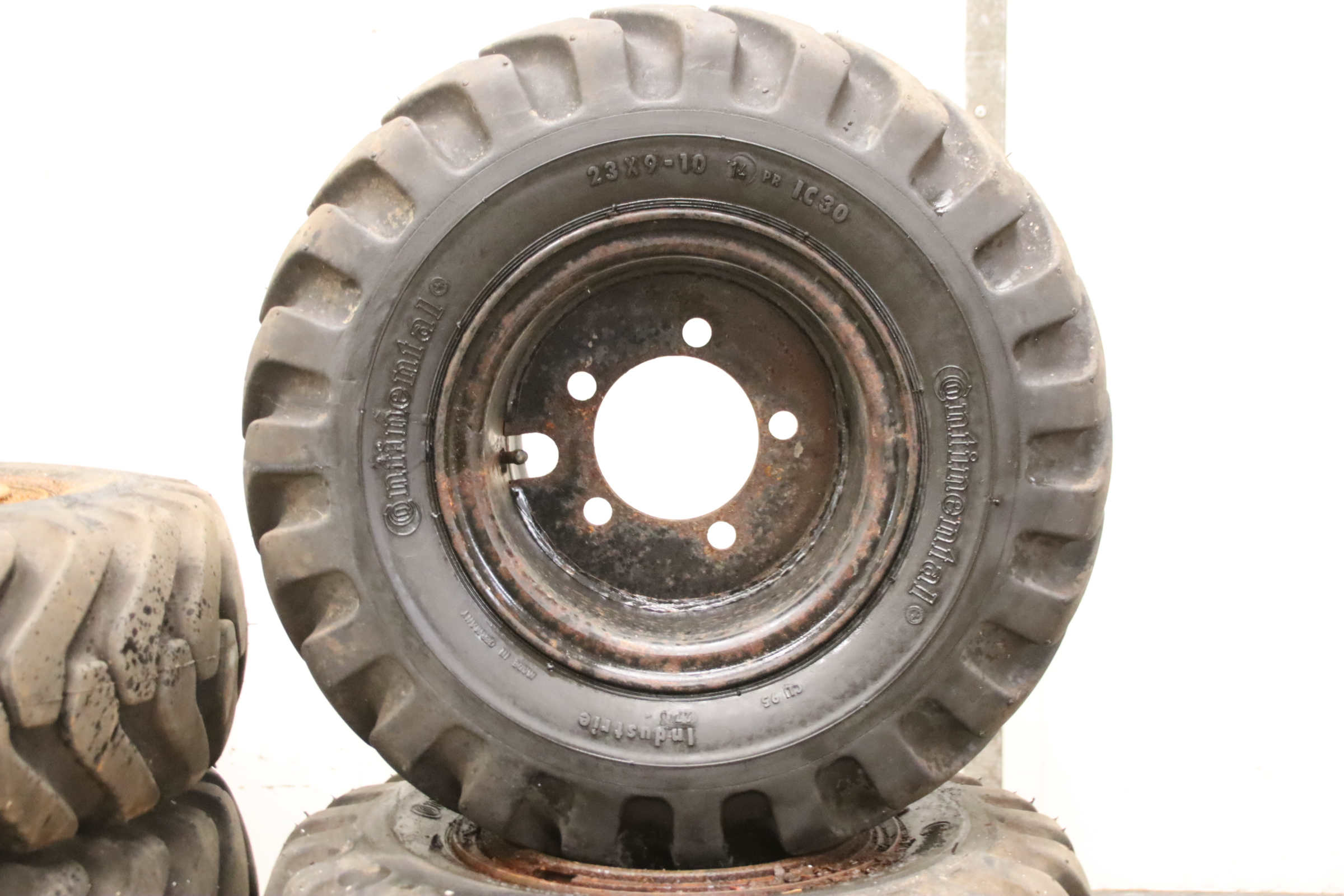 Tires, solid rubber tires, forklift tires -Manufacturer: Continental, Tires with rim, 4 pieces -Tire size: 23x9-10 PR IC30 -Bolt circle: Ø 147 x 19 mm -Hub bore: Ø 110 mm -Delivery/Price: complete -Dimensions: Ø 530 x 220 mm -Weight: 53 kg/unit