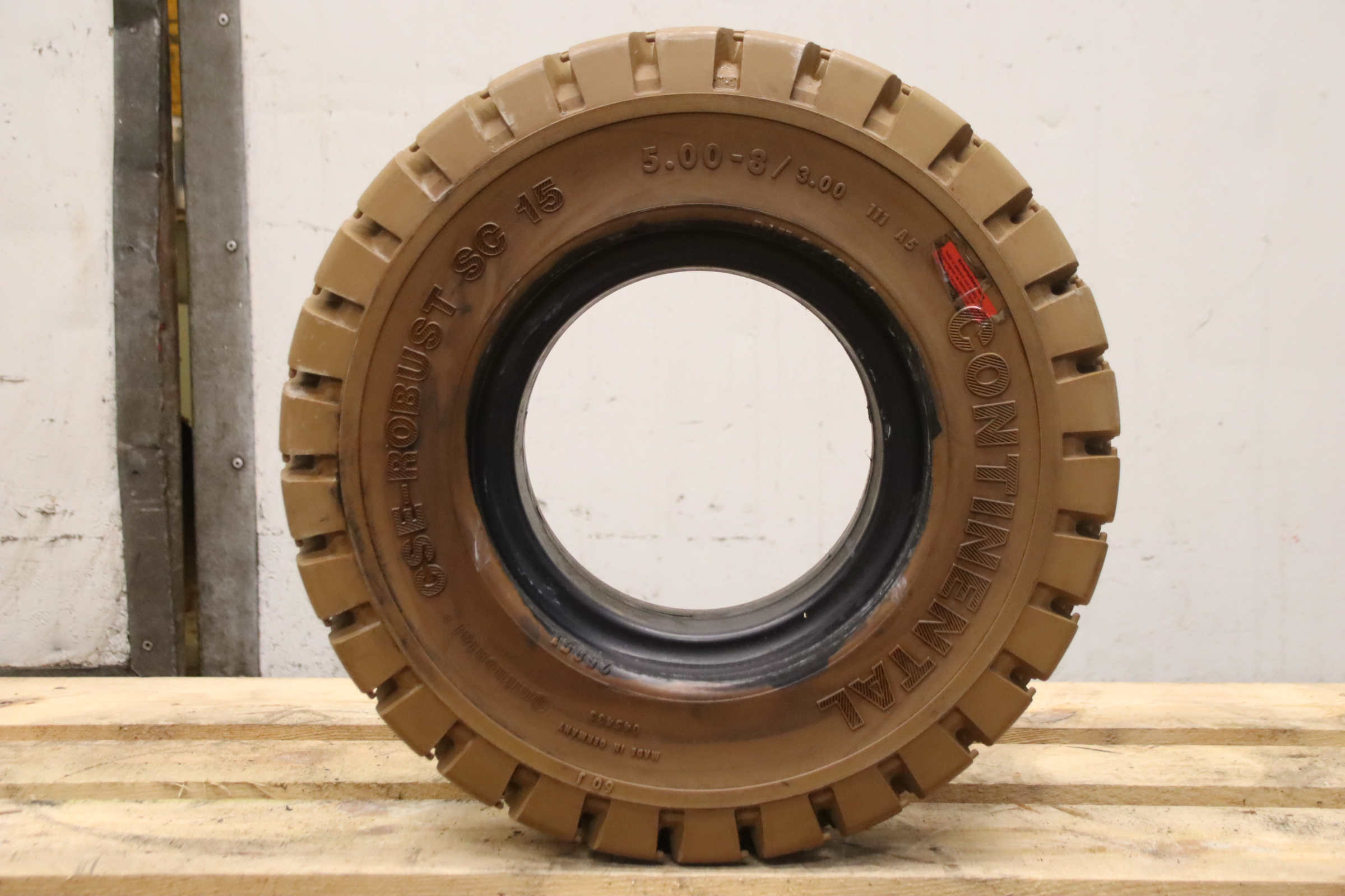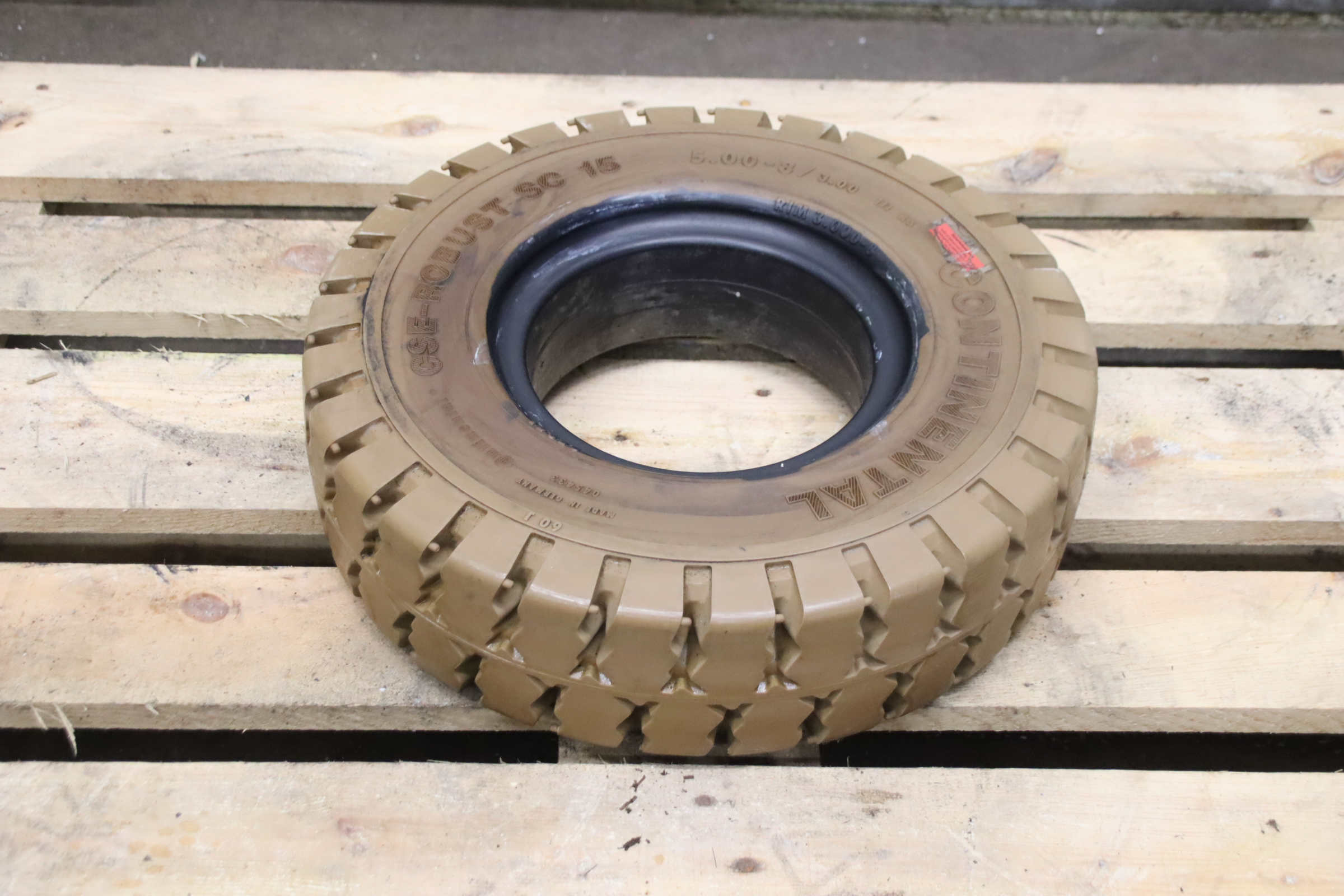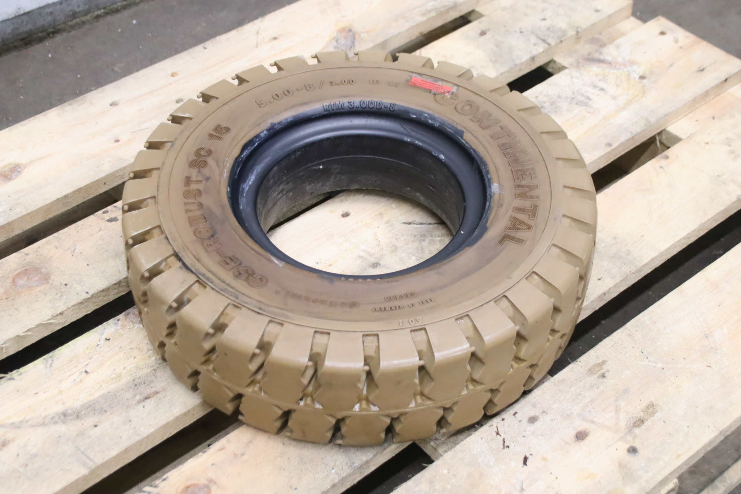 Tires, solid rubber tires, forklift tires -Manufacturer: Continental, solid rubber tire CSE-Robust SC 15 abrasion-resistant -Tire size: 5.00-8/3.00 111 A5 SC 15 RIM 3.00D-8 -Quantity: 1 piece available -Dimensions: Ø 460 x 130 mm -Weight: 17 kg