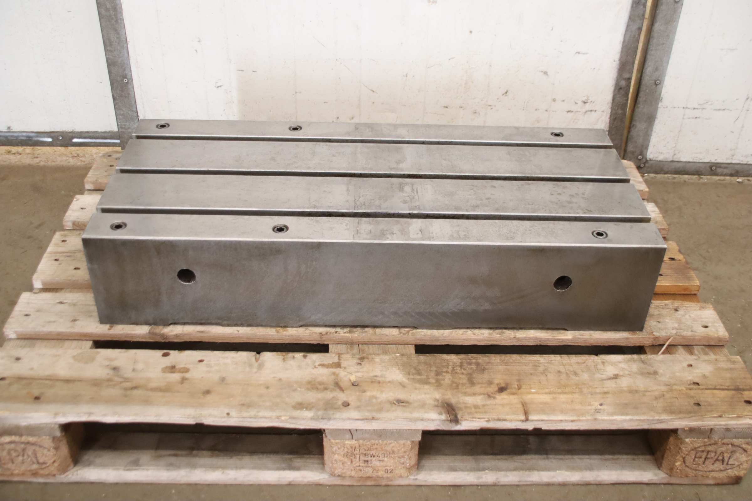 Welding Table, Straightening Table, Straightening Plate, Work Table, Clamping Table Work Table, Clamping Table, Welding Table, Machine Table GEORG 5400 mm Box profile: 160 x 90 mm Height: 760 mm Center groove over 8 profiles 40 x 25 mm Dimensions: 6350 x 1000 x 760 mm Weight approx. 4 ton
