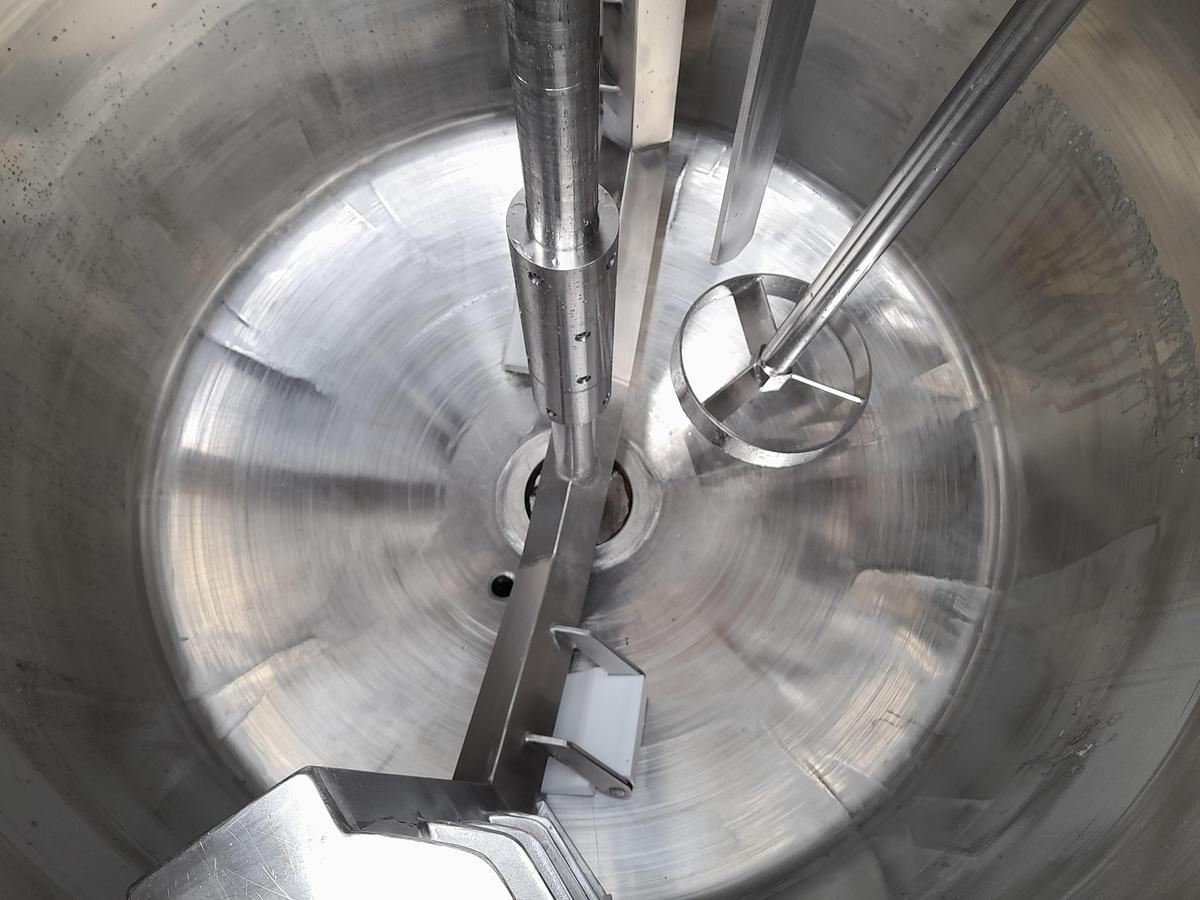 500 litre, Stock number: T4031, Litre: 500, Material: Stainless acid proof steel AISI 316, In stock: Yes, Amount in stock: 1 pc., Item: Tank, Standing: 3 pcs. legs, Bottom: Conical, Double jacket: Yes, Insulated: Yes , Outer cladding: Fully welded stainless, Tank cover: Half hinged lid, Agitator: Yes, 2 pcs., Agitator type: Anchor with scrape and propeller, Agitator placement: From the top, Motor Anchor: 0,55 kW - 230/400 Volt - 25 rpm., Motor Propeller: 1,5 kW - 220/380 Volt - 925 rpm., Inner diameter: Ø 800 mm., Outer diameter: D 920 mm., Total height: H 2000 mm., Manufacturer: Kofa, Year: 1998