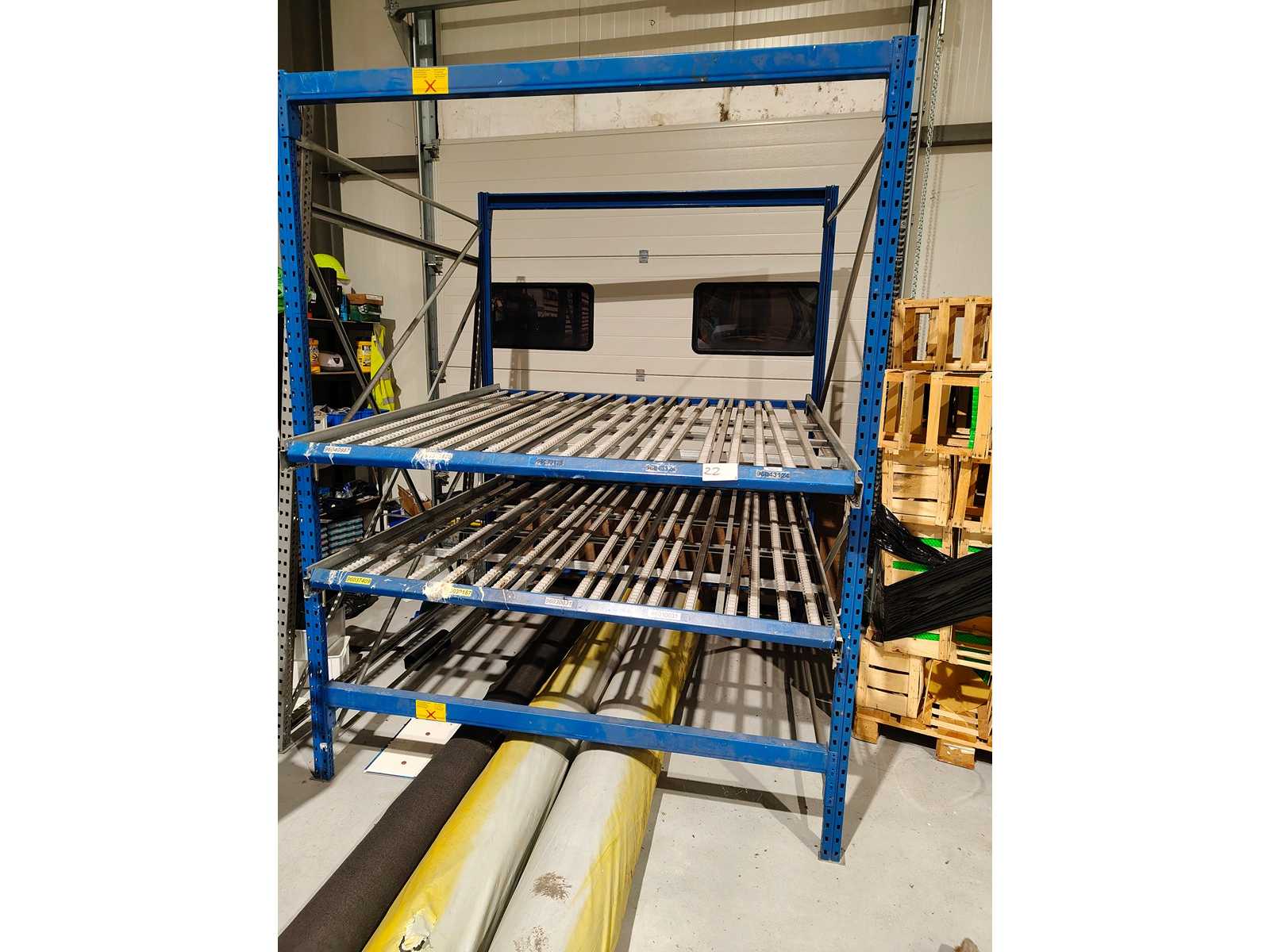 Storage shelf, supply rack Manufacturer: BITO Outer dimensions: width x depth x height (approx. 200 x 140 x 200 cm) 5 shelves with roller strips 4 roller wheels Lower floor is straight, and 4 upper floors with slant and shaft plates is disassembled and ready for collection