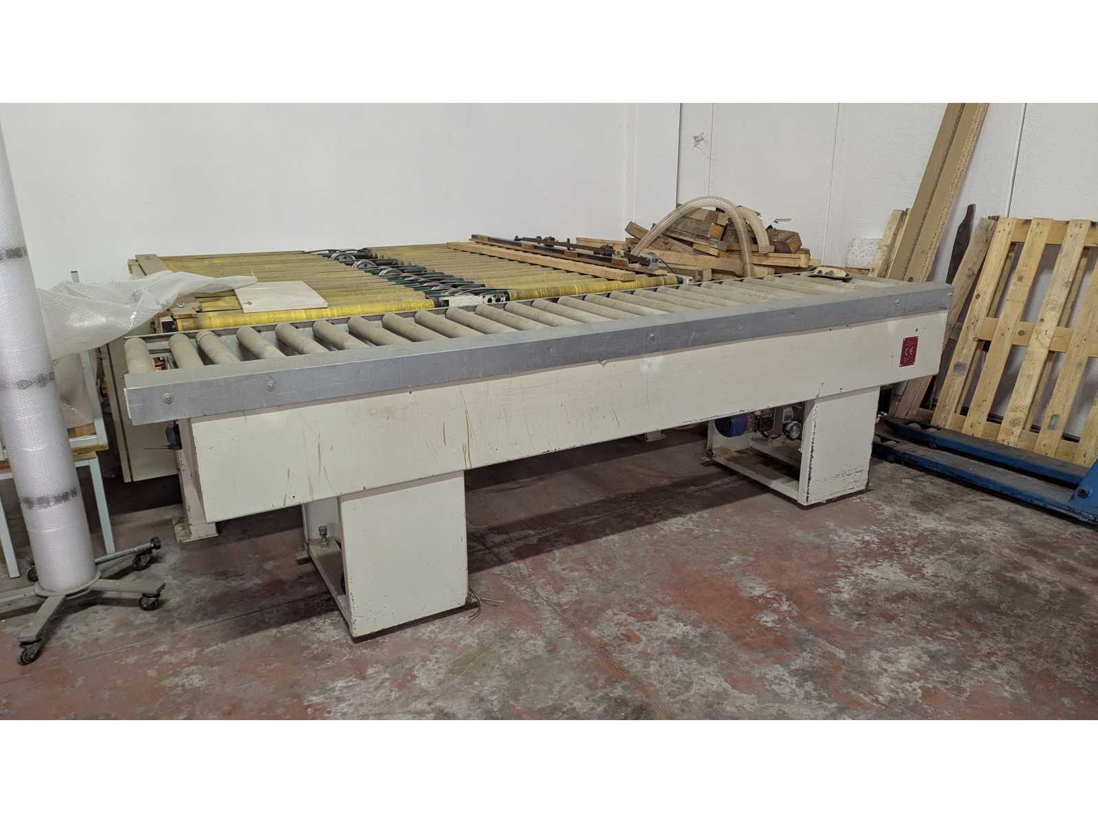 Technical data: - Year of manufacture 2009 - transport length: 2.500 mm - working width, usable: 1.300 mm - Roller length 1,450 mm - Working height: 900 +-20 mm - Roll diameter: 64 mm - roller pitch: 125 mm - Feed rate adjustable (manual): 3-15 m/min - Installed power: 0,37 KW - Producer Superfici Elmag